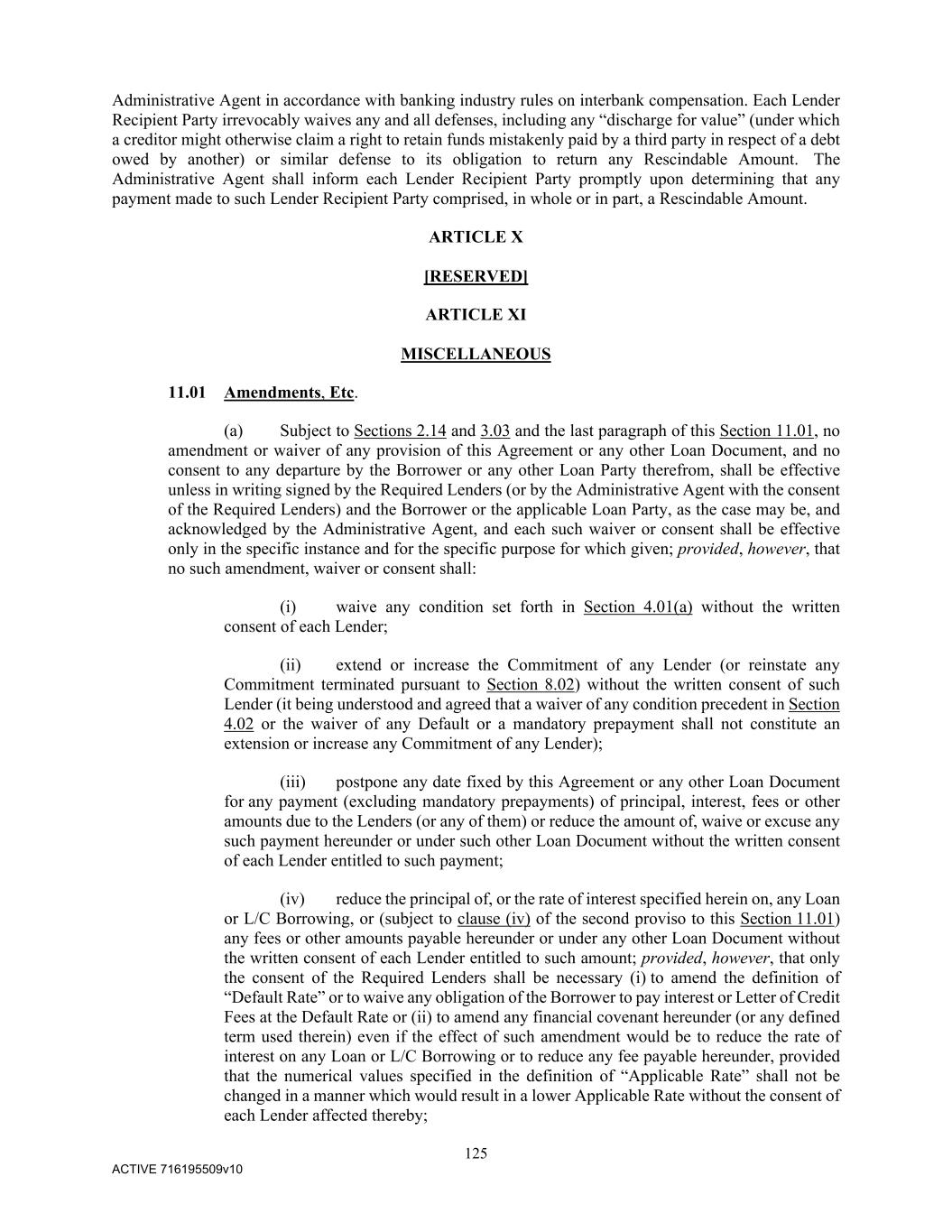 125 ACTIVE 716195509v10 Administrative Agent in accordance with banking industry rules on interbank compensation. Each Lender Recipient Party irrevocably waives any and all defenses, including any “discharge for value” (under which a creditor might otherwise claim a right to retain funds mistakenly paid by a third party in respect of a debt owed by another) or similar defense to its obligation to return any Rescindable Amount. The Administrative Agent shall inform each Lender Recipient Party promptly upon determining that any payment made to such Lender Recipient Party comprised, in whole or in part, a Rescindable Amount. ARTICLE X [RESERVED] ARTICLE XI MISCELLANEOUS 11.01 Amendments, Etc. (a) Subject to Sections 2.14 and 3.03 and the last paragraph of this Section 11.01, no amendment or waiver of any provision of this Agreement or any other Loan Document, and no consent to any departure by the Borrower or any other Loan Party therefrom, shall be effective unless in writing signed by the Required Lenders (or by the Administrative Agent with the consent of the Required Lenders) and the Borrower or the applicable Loan Party, as the case may be, and acknowledged by the Administrative Agent, and each such waiver or consent shall be effective only in the specific instance and for the specific purpose for which given; provided, however, that no such amendment, waiver or consent shall: (i) waive any condition set forth in Section 4.01(a) without the written consent of each Lender; (ii) extend or increase the Commitment of any Lender (or reinstate any Commitment terminated pursuant to Section 8.02) without the written consent of such Lender (it being understood and agreed that a waiver of any condition precedent in Section 4.02 or the waiver of any Default or a mandatory prepayment shall not constitute an extension or increase any Commitment of any Lender); (iii) postpone any date fixed by this Agreement or any other Loan Document for any payment (excluding mandatory prepayments) of principal, interest, fees or other amounts due to the Lenders (or any of them) or reduce the amount of, waive or excuse any such payment hereunder or under such other Loan Document without the written consent of each Lender entitled to such payment; (iv) reduce the principal of, or the rate of interest specified herein on, any Loan or L/C Borrowing, or (subject to clause (iv) of the second proviso to this Section 11.01) any fees or other amounts payable hereunder or under any other Loan Document without the written consent of each Lender entitled to such amount; provided, however, that only the consent of the Required Lenders shall be necessary (i) to amend the definition of “Default Rate” or to waive any obligation of the Borrower to pay interest or Letter of Credit Fees at the Default Rate or (ii) to amend any financial covenant hereunder (or any defined term used therein) even if the effect of such amendment would be to reduce the rate of interest on any Loan or L/C Borrowing or to reduce any fee payable hereunder, provided that the numerical values specified in the definition of “Applicable Rate” shall not be changed in a manner which would result in a lower Applicable Rate without the consent of each Lender affected thereby;