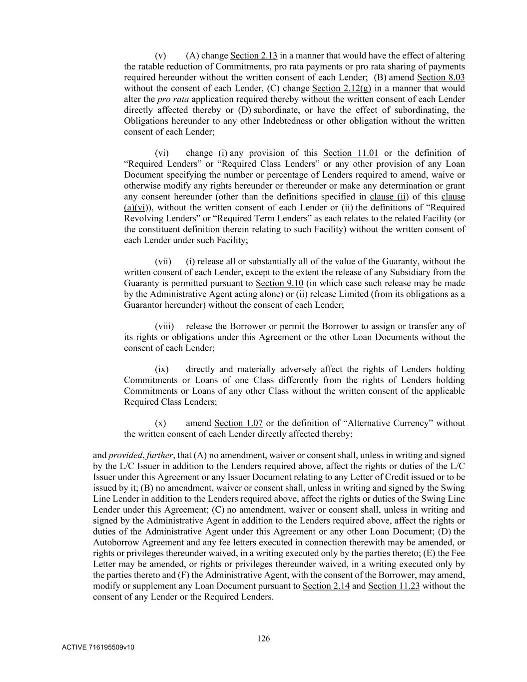 126 ACTIVE 716195509v10 (v) (A) change Section 2.13 in a manner that would have the effect of altering the ratable reduction of Commitments, pro rata payments or pro rata sharing of payments required hereunder without the written consent of each Lender; (B) amend Section 8.03 without the consent of each Lender, (C) change Section 2.12(g) in a manner that would alter the pro rata application required thereby without the written consent of each Lender directly affected thereby or (D) subordinate, or have the effect of subordinating, the Obligations hereunder to any other Indebtedness or other obligation without the written consent of each Lender; (vi) change (i) any provision of this Section 11.01 or the definition of “Required Lenders” or “Required Class Lenders” or any other provision of any Loan Document specifying the number or percentage of Lenders required to amend, waive or otherwise modify any rights hereunder or thereunder or make any determination or grant any consent hereunder (other than the definitions specified in clause (ii) of this clause (a)(vi)), without the written consent of each Lender or (ii) the definitions of “Required Revolving Lenders” or “Required Term Lenders” as each relates to the related Facility (or the constituent definition therein relating to such Facility) without the written consent of each Lender under such Facility; (vii) (i) release all or substantially all of the value of the Guaranty, without the written consent of each Lender, except to the extent the release of any Subsidiary from the Guaranty is permitted pursuant to Section 9.10 (in which case such release may be made by the Administrative Agent acting alone) or (ii) release Limited (from its obligations as a Guarantor hereunder) without the consent of each Lender; (viii) release the Borrower or permit the Borrower to assign or transfer any of its rights or obligations under this Agreement or the other Loan Documents without the consent of each Lender; (ix) directly and materially adversely affect the rights of Lenders holding Commitments or Loans of one Class differently from the rights of Lenders holding Commitments or Loans of any other Class without the written consent of the applicable Required Class Lenders; (x) amend Section 1.07 or the definition of “Alternative Currency” without the written consent of each Lender directly affected thereby; and provided, further, that (A) no amendment, waiver or consent shall, unless in writing and signed by the L/C Issuer in addition to the Lenders required above, affect the rights or duties of the L/C Issuer under this Agreement or any Issuer Document relating to any Letter of Credit issued or to be issued by it; (B) no amendment, waiver or consent shall, unless in writing and signed by the Swing Line Lender in addition to the Lenders required above, affect the rights or duties of the Swing Line Lender under this Agreement; (C) no amendment, waiver or consent shall, unless in writing and signed by the Administrative Agent in addition to the Lenders required above, affect the rights or duties of the Administrative Agent under this Agreement or any other Loan Document; (D) the Autoborrow Agreement and any fee letters executed in connection therewith may be amended, or rights or privileges thereunder waived, in a writing executed only by the parties thereto; (E) the Fee Letter may be amended, or rights or privileges thereunder waived, in a writing executed only by the parties thereto and (F) the Administrative Agent, with the consent of the Borrower, may amend, modify or supplement any Loan Document pursuant to Section 2.14 and Section 11.23 without the consent of any Lender or the Required Lenders.