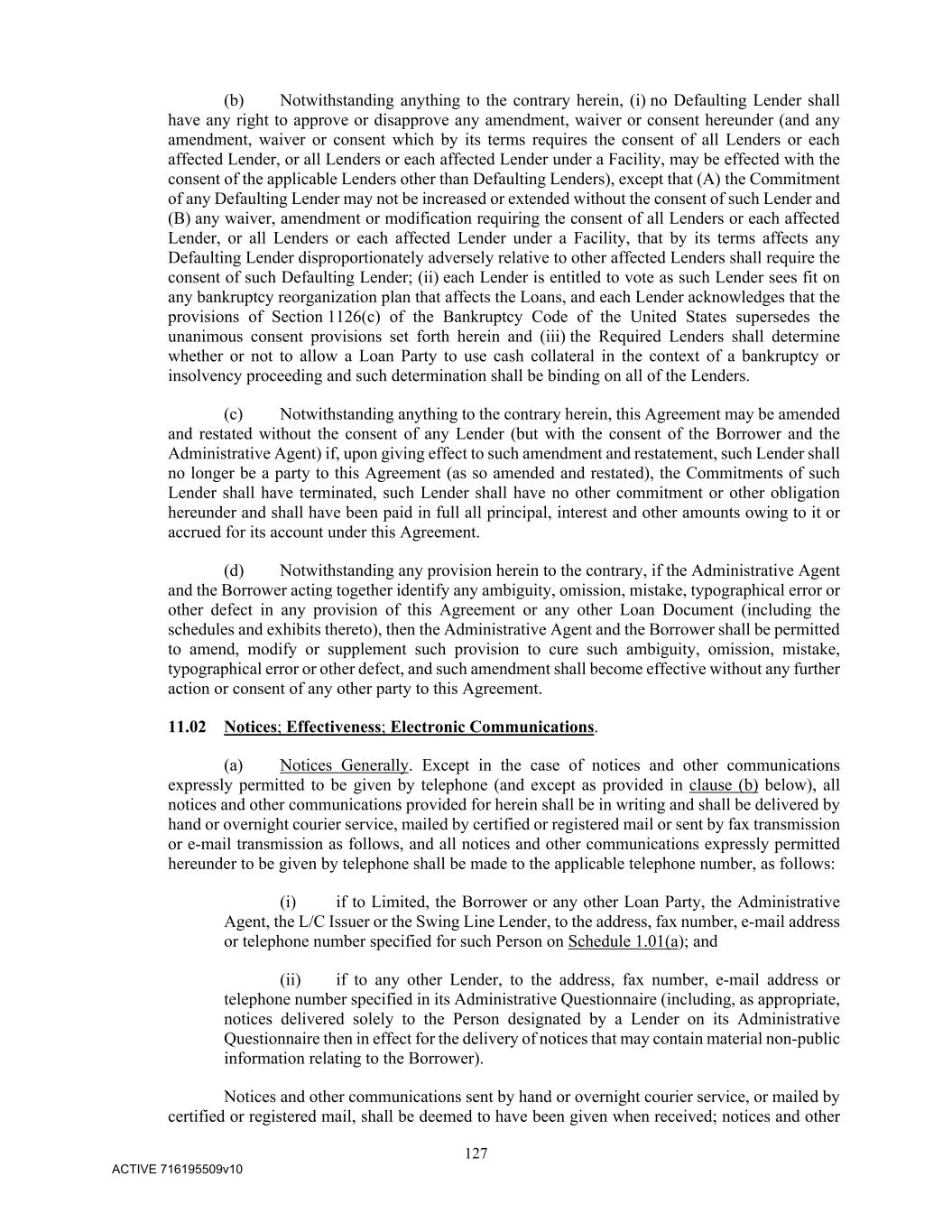 127 ACTIVE 716195509v10 (b) Notwithstanding anything to the contrary herein, (i) no Defaulting Lender shall have any right to approve or disapprove any amendment, waiver or consent hereunder (and any amendment, waiver or consent which by its terms requires the consent of all Lenders or each affected Lender, or all Lenders or each affected Lender under a Facility, may be effected with the consent of the applicable Lenders other than Defaulting Lenders), except that (A) the Commitment of any Defaulting Lender may not be increased or extended without the consent of such Lender and (B) any waiver, amendment or modification requiring the consent of all Lenders or each affected Lender, or all Lenders or each affected Lender under a Facility, that by its terms affects any Defaulting Lender disproportionately adversely relative to other affected Lenders shall require the consent of such Defaulting Lender; (ii) each Lender is entitled to vote as such Lender sees fit on any bankruptcy reorganization plan that affects the Loans, and each Lender acknowledges that the provisions of Section 1126(c) of the Bankruptcy Code of the United States supersedes the unanimous consent provisions set forth herein and (iii) the Required Lenders shall determine whether or not to allow a Loan Party to use cash collateral in the context of a bankruptcy or insolvency proceeding and such determination shall be binding on all of the Lenders. (c) Notwithstanding anything to the contrary herein, this Agreement may be amended and restated without the consent of any Lender (but with the consent of the Borrower and the Administrative Agent) if, upon giving effect to such amendment and restatement, such Lender shall no longer be a party to this Agreement (as so amended and restated), the Commitments of such Lender shall have terminated, such Lender shall have no other commitment or other obligation hereunder and shall have been paid in full all principal, interest and other amounts owing to it or accrued for its account under this Agreement. (d) Notwithstanding any provision herein to the contrary, if the Administrative Agent and the Borrower acting together identify any ambiguity, omission, mistake, typographical error or other defect in any provision of this Agreement or any other Loan Document (including the schedules and exhibits thereto), then the Administrative Agent and the Borrower shall be permitted to amend, modify or supplement such provision to cure such ambiguity, omission, mistake, typographical error or other defect, and such amendment shall become effective without any further action or consent of any other party to this Agreement. 11.02 Notices; Effectiveness; Electronic Communications. (a) Notices Generally. Except in the case of notices and other communications expressly permitted to be given by telephone (and except as provided in clause (b) below), all notices and other communications provided for herein shall be in writing and shall be delivered by hand or overnight courier service, mailed by certified or registered mail or sent by fax transmission or e-mail transmission as follows, and all notices and other communications expressly permitted hereunder to be given by telephone shall be made to the applicable telephone number, as follows: (i) if to Limited, the Borrower or any other Loan Party, the Administrative Agent, the L/C Issuer or the Swing Line Lender, to the address, fax number, e-mail address or telephone number specified for such Person on Schedule 1.01(a); and (ii) if to any other Lender, to the address, fax number, e-mail address or telephone number specified in its Administrative Questionnaire (including, as appropriate, notices delivered solely to the Person designated by a Lender on its Administrative Questionnaire then in effect for the delivery of notices that may contain material non-public information relating to the Borrower). Notices and other communications sent by hand or overnight courier service, or mailed by certified or registered mail, shall be deemed to have been given when received; notices and other