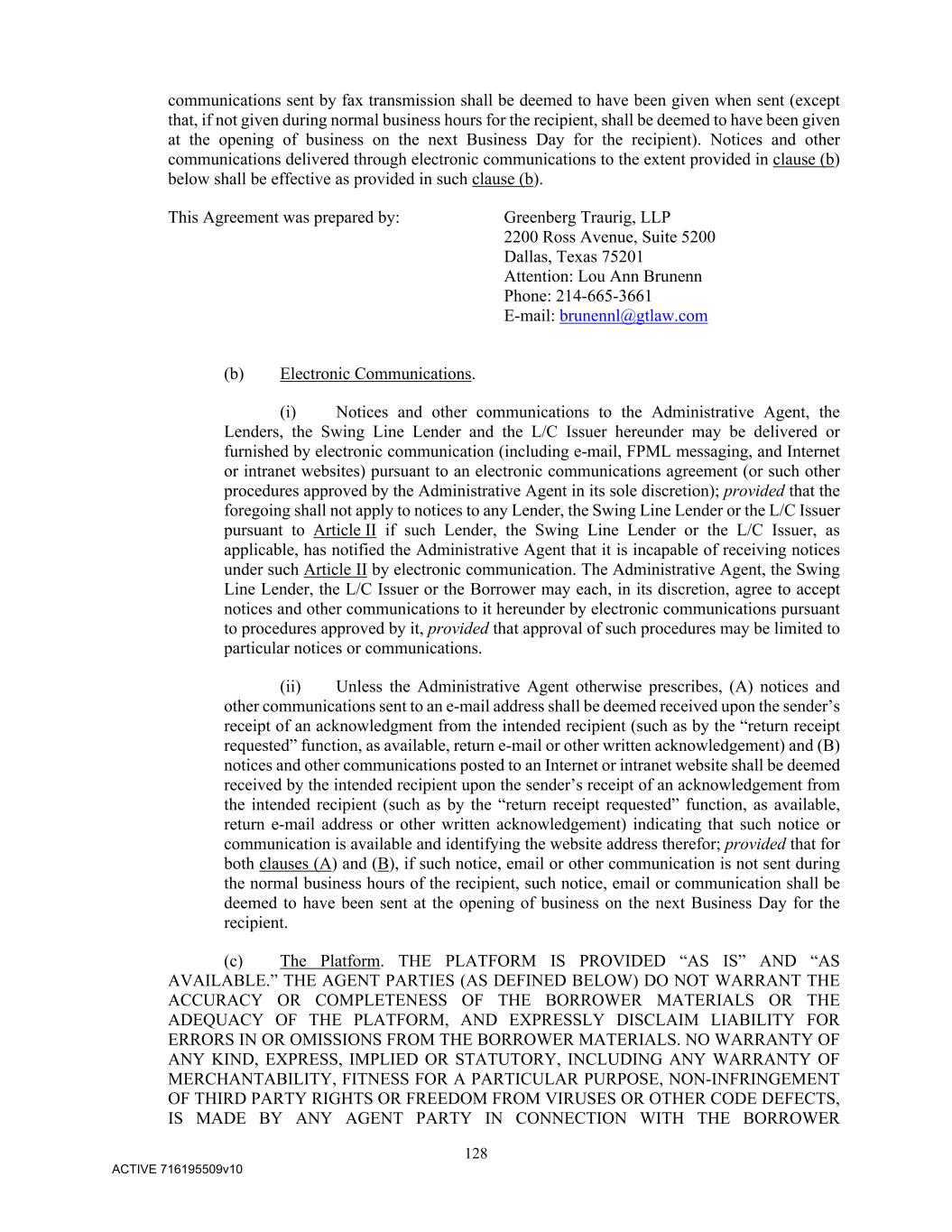 128 ACTIVE 716195509v10 communications sent by fax transmission shall be deemed to have been given when sent (except that, if not given during normal business hours for the recipient, shall be deemed to have been given at the opening of business on the next Business Day for the recipient). Notices and other communications delivered through electronic communications to the extent provided in clause (b) below shall be effective as provided in such clause (b). This Agreement was prepared by: Greenberg Traurig, LLP 2200 Ross Avenue, Suite 5200 Dallas, Texas 75201 Attention: Lou Ann Brunenn Phone: 214-665-3661 E-mail: brunennl@gtlaw.com (b) Electronic Communications. (i) Notices and other communications to the Administrative Agent, the Lenders, the Swing Line Lender and the L/C Issuer hereunder may be delivered or furnished by electronic communication (including e-mail, FPML messaging, and Internet or intranet websites) pursuant to an electronic communications agreement (or such other procedures approved by the Administrative Agent in its sole discretion); provided that the foregoing shall not apply to notices to any Lender, the Swing Line Lender or the L/C Issuer pursuant to Article II if such Lender, the Swing Line Lender or the L/C Issuer, as applicable, has notified the Administrative Agent that it is incapable of receiving notices under such Article II by electronic communication. The Administrative Agent, the Swing Line Lender, the L/C Issuer or the Borrower may each, in its discretion, agree to accept notices and other communications to it hereunder by electronic communications pursuant to procedures approved by it, provided that approval of such procedures may be limited to particular notices or communications. (ii) Unless the Administrative Agent otherwise prescribes, (A) notices and other communications sent to an e-mail address shall be deemed received upon the sender’s receipt of an acknowledgment from the intended recipient (such as by the “return receipt requested” function, as available, return e-mail or other written acknowledgement) and (B) notices and other communications posted to an Internet or intranet website shall be deemed received by the intended recipient upon the sender’s receipt of an acknowledgement from the intended recipient (such as by the “return receipt requested” function, as available, return e-mail address or other written acknowledgement) indicating that such notice or communication is available and identifying the website address therefor; provided that for both clauses (A) and (B), if such notice, email or other communication is not sent during the normal business hours of the recipient, such notice, email or communication shall be deemed to have been sent at the opening of business on the next Business Day for the recipient. (c) The Platform. THE PLATFORM IS PROVIDED “AS IS” AND “AS AVAILABLE.” THE AGENT PARTIES (AS DEFINED BELOW) DO NOT WARRANT THE ACCURACY OR COMPLETENESS OF THE BORROWER MATERIALS OR THE ADEQUACY OF THE PLATFORM, AND EXPRESSLY DISCLAIM LIABILITY FOR ERRORS IN OR OMISSIONS FROM THE BORROWER MATERIALS. NO WARRANTY OF ANY KIND, EXPRESS, IMPLIED OR STATUTORY, INCLUDING ANY WARRANTY OF MERCHANTABILITY, FITNESS FOR A PARTICULAR PURPOSE, NON-INFRINGEMENT OF THIRD PARTY RIGHTS OR FREEDOM FROM VIRUSES OR OTHER CODE DEFECTS, IS MADE BY ANY AGENT PARTY IN CONNECTION WITH THE BORROWER