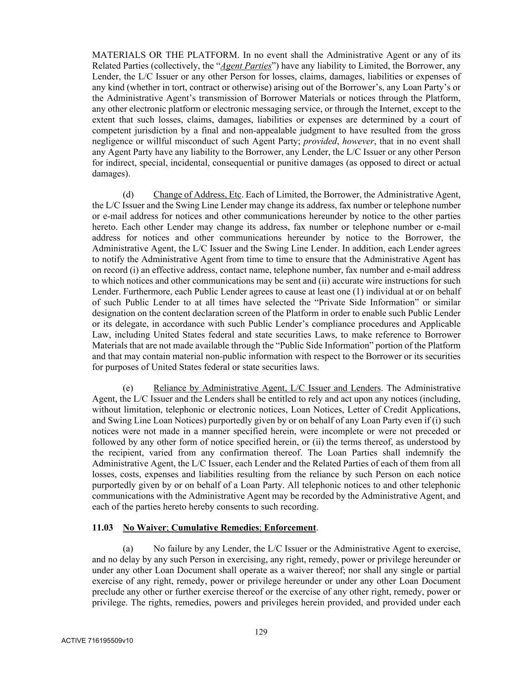 129 ACTIVE 716195509v10 MATERIALS OR THE PLATFORM. In no event shall the Administrative Agent or any of its Related Parties (collectively, the “Agent Parties”) have any liability to Limited, the Borrower, any Lender, the L/C Issuer or any other Person for losses, claims, damages, liabilities or expenses of any kind (whether in tort, contract or otherwise) arising out of the Borrower’s, any Loan Party’s or the Administrative Agent’s transmission of Borrower Materials or notices through the Platform, any other electronic platform or electronic messaging service, or through the Internet, except to the extent that such losses, claims, damages, liabilities or expenses are determined by a court of competent jurisdiction by a final and non-appealable judgment to have resulted from the gross negligence or willful misconduct of such Agent Party; provided, however, that in no event shall any Agent Party have any liability to the Borrower, any Lender, the L/C Issuer or any other Person for indirect, special, incidental, consequential or punitive damages (as opposed to direct or actual damages). (d) Change of Address, Etc. Each of Limited, the Borrower, the Administrative Agent, the L/C Issuer and the Swing Line Lender may change its address, fax number or telephone number or e-mail address for notices and other communications hereunder by notice to the other parties hereto. Each other Lender may change its address, fax number or telephone number or e-mail address for notices and other communications hereunder by notice to the Borrower, the Administrative Agent, the L/C Issuer and the Swing Line Lender. In addition, each Lender agrees to notify the Administrative Agent from time to time to ensure that the Administrative Agent has on record (i) an effective address, contact name, telephone number, fax number and e-mail address to which notices and other communications may be sent and (ii) accurate wire instructions for such Lender. Furthermore, each Public Lender agrees to cause at least one (1) individual at or on behalf of such Public Lender to at all times have selected the “Private Side Information” or similar designation on the content declaration screen of the Platform in order to enable such Public Lender or its delegate, in accordance with such Public Lender’s compliance procedures and Applicable Law, including United States federal and state securities Laws, to make reference to Borrower Materials that are not made available through the “Public Side Information” portion of the Platform and that may contain material non-public information with respect to the Borrower or its securities for purposes of United States federal or state securities laws. (e) Reliance by Administrative Agent, L/C Issuer and Lenders. The Administrative Agent, the L/C Issuer and the Lenders shall be entitled to rely and act upon any notices (including, without limitation, telephonic or electronic notices, Loan Notices, Letter of Credit Applications, and Swing Line Loan Notices) purportedly given by or on behalf of any Loan Party even if (i) such notices were not made in a manner specified herein, were incomplete or were not preceded or followed by any other form of notice specified herein, or (ii) the terms thereof, as understood by the recipient, varied from any confirmation thereof. The Loan Parties shall indemnify the Administrative Agent, the L/C Issuer, each Lender and the Related Parties of each of them from all losses, costs, expenses and liabilities resulting from the reliance by such Person on each notice purportedly given by or on behalf of a Loan Party. All telephonic notices to and other telephonic communications with the Administrative Agent may be recorded by the Administrative Agent, and each of the parties hereto hereby consents to such recording. 11.03 No Waiver; Cumulative Remedies; Enforcement. (a) No failure by any Lender, the L/C Issuer or the Administrative Agent to exercise, and no delay by any such Person in exercising, any right, remedy, power or privilege hereunder or under any other Loan Document shall operate as a waiver thereof; nor shall any single or partial exercise of any right, remedy, power or privilege hereunder or under any other Loan Document preclude any other or further exercise thereof or the exercise of any other right, remedy, power or privilege. The rights, remedies, powers and privileges herein provided, and provided under each
