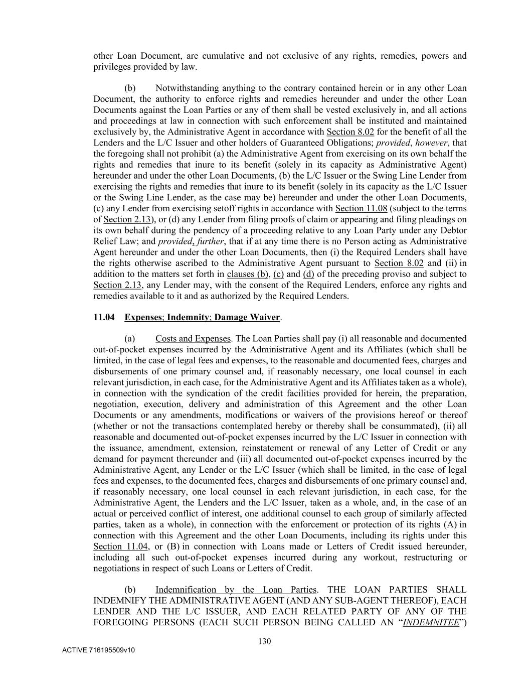 130 ACTIVE 716195509v10 other Loan Document, are cumulative and not exclusive of any rights, remedies, powers and privileges provided by law. (b) Notwithstanding anything to the contrary contained herein or in any other Loan Document, the authority to enforce rights and remedies hereunder and under the other Loan Documents against the Loan Parties or any of them shall be vested exclusively in, and all actions and proceedings at law in connection with such enforcement shall be instituted and maintained exclusively by, the Administrative Agent in accordance with Section 8.02 for the benefit of all the Lenders and the L/C Issuer and other holders of Guaranteed Obligations; provided, however, that the foregoing shall not prohibit (a) the Administrative Agent from exercising on its own behalf the rights and remedies that inure to its benefit (solely in its capacity as Administrative Agent) hereunder and under the other Loan Documents, (b) the L/C Issuer or the Swing Line Lender from exercising the rights and remedies that inure to its benefit (solely in its capacity as the L/C Issuer or the Swing Line Lender, as the case may be) hereunder and under the other Loan Documents, (c) any Lender from exercising setoff rights in accordance with Section 11.08 (subject to the terms of Section 2.13), or (d) any Lender from filing proofs of claim or appearing and filing pleadings on its own behalf during the pendency of a proceeding relative to any Loan Party under any Debtor Relief Law; and provided, further, that if at any time there is no Person acting as Administrative Agent hereunder and under the other Loan Documents, then (i) the Required Lenders shall have the rights otherwise ascribed to the Administrative Agent pursuant to Section 8.02 and (ii) in addition to the matters set forth in clauses (b), (c) and (d) of the preceding proviso and subject to Section 2.13, any Lender may, with the consent of the Required Lenders, enforce any rights and remedies available to it and as authorized by the Required Lenders. 11.04 Expenses; Indemnity; Damage Waiver. (a) Costs and Expenses. The Loan Parties shall pay (i) all reasonable and documented out-of-pocket expenses incurred by the Administrative Agent and its Affiliates (which shall be limited, in the case of legal fees and expenses, to the reasonable and documented fees, charges and disbursements of one primary counsel and, if reasonably necessary, one local counsel in each relevant jurisdiction, in each case, for the Administrative Agent and its Affiliates taken as a whole), in connection with the syndication of the credit facilities provided for herein, the preparation, negotiation, execution, delivery and administration of this Agreement and the other Loan Documents or any amendments, modifications or waivers of the provisions hereof or thereof (whether or not the transactions contemplated hereby or thereby shall be consummated), (ii) all reasonable and documented out-of-pocket expenses incurred by the L/C Issuer in connection with the issuance, amendment, extension, reinstatement or renewal of any Letter of Credit or any demand for payment thereunder and (iii) all documented out-of-pocket expenses incurred by the Administrative Agent, any Lender or the L/C Issuer (which shall be limited, in the case of legal fees and expenses, to the documented fees, charges and disbursements of one primary counsel and, if reasonably necessary, one local counsel in each relevant jurisdiction, in each case, for the Administrative Agent, the Lenders and the L/C Issuer, taken as a whole, and, in the case of an actual or perceived conflict of interest, one additional counsel to each group of similarly affected parties, taken as a whole), in connection with the enforcement or protection of its rights (A) in connection with this Agreement and the other Loan Documents, including its rights under this Section 11.04, or (B) in connection with Loans made or Letters of Credit issued hereunder, including all such out-of-pocket expenses incurred during any workout, restructuring or negotiations in respect of such Loans or Letters of Credit. (b) Indemnification by the Loan Parties. THE LOAN PARTIES SHALL INDEMNIFY THE ADMINISTRATIVE AGENT (AND ANY SUB-AGENT THEREOF), EACH LENDER AND THE L/C ISSUER, AND EACH RELATED PARTY OF ANY OF THE FOREGOING PERSONS (EACH SUCH PERSON BEING CALLED AN “INDEMNITEE”)