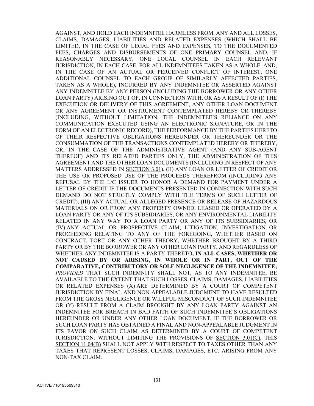131 ACTIVE 716195509v10 AGAINST, AND HOLD EACH INDEMNITEE HARMLESS FROM, ANY AND ALL LOSSES, CLAIMS, DAMAGES, LIABILITIES AND RELATED EXPENSES (WHICH SHALL BE LIMITED, IN THE CASE OF LEGAL FEES AND EXPENSES, TO THE DOCUMENTED FEES, CHARGES AND DISBURSEMENTS OF ONE PRIMARY COUNSEL AND, IF REASONABLY NECESSARY, ONE LOCAL COUNSEL IN EACH RELEVANT JURISDICTION, IN EACH CASE, FOR ALL INDEMNITEES TAKEN AS A WHOLE, AND, IN THE CASE OF AN ACTUAL OR PERCEIVED CONFLICT OF INTEREST, ONE ADDITIONAL COUNSEL TO EACH GROUP OF SIMILARLY AFFECTED PARTIES, TAKEN AS A WHOLE), INCURRED BY ANY INDEMNITEE OR ASSERTED AGAINST ANY INDEMNITEE BY ANY PERSON (INCLUDING THE BORROWER OR ANY OTHER LOAN PARTY) ARISING OUT OF, IN CONNECTION WITH, OR AS A RESULT OF (I) THE EXECUTION OR DELIVERY OF THIS AGREEMENT, ANY OTHER LOAN DOCUMENT OR ANY AGREEMENT OR INSTRUMENT CONTEMPLATED HEREBY OR THEREBY (INCLUDING, WITHOUT LIMITATION, THE INDEMNITEE’S RELIANCE ON ANY COMMUNICATION EXECUTED USING AN ELECTRONIC SIGNATURE, OR IN THE FORM OF AN ELECTRONIC RECORD), THE PERFORMANCE BY THE PARTIES HERETO OF THEIR RESPECTIVE OBLIGATIONS HEREUNDER OR THEREUNDER OR THE CONSUMMATION OF THE TRANSACTIONS CONTEMPLATED HEREBY OR THEREBY, OR, IN THE CASE OF THE ADMINISTRATIVE AGENT (AND ANY SUB-AGENT THEREOF) AND ITS RELATED PARTIES ONLY, THE ADMINISTRATION OF THIS AGREEMENT AND THE OTHER LOAN DOCUMENTS (INCLUDING IN RESPECT OF ANY MATTERS ADDRESSED IN SECTION 3.01), (II) ANY LOAN OR LETTER OF CREDIT OR THE USE OR PROPOSED USE OF THE PROCEEDS THEREFROM (INCLUDING ANY REFUSAL BY THE L/C ISSUER TO HONOR A DEMAND FOR PAYMENT UNDER A LETTER OF CREDIT IF THE DOCUMENTS PRESENTED IN CONNECTION WITH SUCH DEMAND DO NOT STRICTLY COMPLY WITH THE TERMS OF SUCH LETTER OF CREDIT), (III) ANY ACTUAL OR ALLEGED PRESENCE OR RELEASE OF HAZARDOUS MATERIALS ON OR FROM ANY PROPERTY OWNED, LEASED OR OPERATED BY A LOAN PARTY OR ANY OF ITS SUBSIDIARIES, OR ANY ENVIRONMENTAL LIABILITY RELATED IN ANY WAY TO A LOAN PARTY OR ANY OF ITS SUBSIDIARIES, OR (IV) ANY ACTUAL OR PROSPECTIVE CLAIM, LITIGATION, INVESTIGATION OR PROCEEDING RELATING TO ANY OF THE FOREGOING, WHETHER BASED ON CONTRACT, TORT OR ANY OTHER THEORY, WHETHER BROUGHT BY A THIRD PARTY OR BY THE BORROWER OR ANY OTHER LOAN PARTY, AND REGARDLESS OF WHETHER ANY INDEMNITEE IS A PARTY THERETO, IN ALL CASES, WHETHER OR NOT CAUSED BY OR ARISING, IN WHOLE OR IN PART, OUT OF THE COMPARATIVE, CONTRIBUTORY OR SOLE NEGLIGENCE OF THE INDEMNITEE; PROVIDED THAT SUCH INDEMNITY SHALL NOT, AS TO ANY INDEMNITEE, BE AVAILABLE TO THE EXTENT THAT SUCH LOSSES, CLAIMS, DAMAGES, LIABILITIES OR RELATED EXPENSES (X) ARE DETERMINED BY A COURT OF COMPETENT JURISDICTION BY FINAL AND NON-APPEALABLE JUDGMENT TO HAVE RESULTED FROM THE GROSS NEGLIGENCE OR WILLFUL MISCONDUCT OF SUCH INDEMNITEE OR (Y) RESULT FROM A CLAIM BROUGHT BY ANY LOAN PARTY AGAINST AN INDEMNITEE FOR BREACH IN BAD FAITH OF SUCH INDEMNITEE’S OBLIGATIONS HEREUNDER OR UNDER ANY OTHER LOAN DOCUMENT, IF THE BORROWER OR SUCH LOAN PARTY HAS OBTAINED A FINAL AND NON-APPEALABLE JUDGMENT IN ITS FAVOR ON SUCH CLAIM AS DETERMINED BY A COURT OF COMPETENT JURISDICTION. WITHOUT LIMITING THE PROVISIONS OF SECTION 3.01(C), THIS SECTION 11.04(B) SHALL NOT APPLY WITH RESPECT TO TAXES OTHER THAN ANY TAXES THAT REPRESENT LOSSES, CLAIMS, DAMAGES, ETC. ARISING FROM ANY NON-TAX CLAIM.