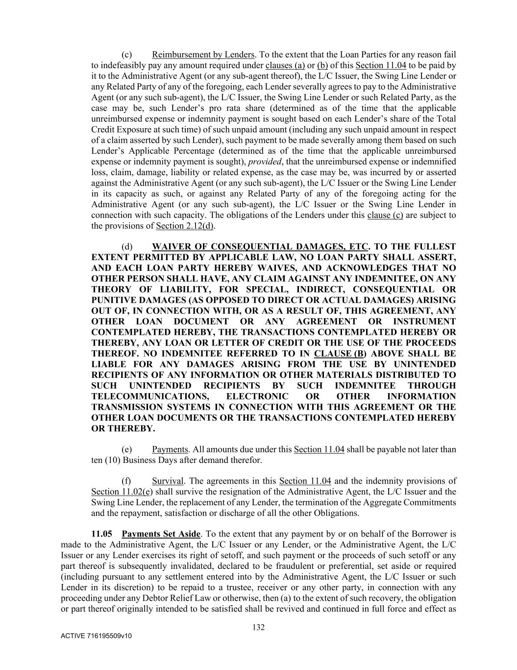 132 ACTIVE 716195509v10 (c) Reimbursement by Lenders. To the extent that the Loan Parties for any reason fail to indefeasibly pay any amount required under clauses (a) or (b) of this Section 11.04 to be paid by it to the Administrative Agent (or any sub-agent thereof), the L/C Issuer, the Swing Line Lender or any Related Party of any of the foregoing, each Lender severally agrees to pay to the Administrative Agent (or any such sub-agent), the L/C Issuer, the Swing Line Lender or such Related Party, as the case may be, such Lender’s pro rata share (determined as of the time that the applicable unreimbursed expense or indemnity payment is sought based on each Lender’s share of the Total Credit Exposure at such time) of such unpaid amount (including any such unpaid amount in respect of a claim asserted by such Lender), such payment to be made severally among them based on such Lender’s Applicable Percentage (determined as of the time that the applicable unreimbursed expense or indemnity payment is sought), provided, that the unreimbursed expense or indemnified loss, claim, damage, liability or related expense, as the case may be, was incurred by or asserted against the Administrative Agent (or any such sub-agent), the L/C Issuer or the Swing Line Lender in its capacity as such, or against any Related Party of any of the foregoing acting for the Administrative Agent (or any such sub-agent), the L/C Issuer or the Swing Line Lender in connection with such capacity. The obligations of the Lenders under this clause (c) are subject to the provisions of Section 2.12(d). (d) WAIVER OF CONSEQUENTIAL DAMAGES, ETC. TO THE FULLEST EXTENT PERMITTED BY APPLICABLE LAW, NO LOAN PARTY SHALL ASSERT, AND EACH LOAN PARTY HEREBY WAIVES, AND ACKNOWLEDGES THAT NO OTHER PERSON SHALL HAVE, ANY CLAIM AGAINST ANY INDEMNITEE, ON ANY THEORY OF LIABILITY, FOR SPECIAL, INDIRECT, CONSEQUENTIAL OR PUNITIVE DAMAGES (AS OPPOSED TO DIRECT OR ACTUAL DAMAGES) ARISING OUT OF, IN CONNECTION WITH, OR AS A RESULT OF, THIS AGREEMENT, ANY OTHER LOAN DOCUMENT OR ANY AGREEMENT OR INSTRUMENT CONTEMPLATED HEREBY, THE TRANSACTIONS CONTEMPLATED HEREBY OR THEREBY, ANY LOAN OR LETTER OF CREDIT OR THE USE OF THE PROCEEDS THEREOF. NO INDEMNITEE REFERRED TO IN CLAUSE (B) ABOVE SHALL BE LIABLE FOR ANY DAMAGES ARISING FROM THE USE BY UNINTENDED RECIPIENTS OF ANY INFORMATION OR OTHER MATERIALS DISTRIBUTED TO SUCH UNINTENDED RECIPIENTS BY SUCH INDEMNITEE THROUGH TELECOMMUNICATIONS, ELECTRONIC OR OTHER INFORMATION TRANSMISSION SYSTEMS IN CONNECTION WITH THIS AGREEMENT OR THE OTHER LOAN DOCUMENTS OR THE TRANSACTIONS CONTEMPLATED HEREBY OR THEREBY. (e) Payments. All amounts due under this Section 11.04 shall be payable not later than ten (10) Business Days after demand therefor. (f) Survival. The agreements in this Section 11.04 and the indemnity provisions of Section 11.02(e) shall survive the resignation of the Administrative Agent, the L/C Issuer and the Swing Line Lender, the replacement of any Lender, the termination of the Aggregate Commitments and the repayment, satisfaction or discharge of all the other Obligations. 11.05 Payments Set Aside. To the extent that any payment by or on behalf of the Borrower is made to the Administrative Agent, the L/C Issuer or any Lender, or the Administrative Agent, the L/C Issuer or any Lender exercises its right of setoff, and such payment or the proceeds of such setoff or any part thereof is subsequently invalidated, declared to be fraudulent or preferential, set aside or required (including pursuant to any settlement entered into by the Administrative Agent, the L/C Issuer or such Lender in its discretion) to be repaid to a trustee, receiver or any other party, in connection with any proceeding under any Debtor Relief Law or otherwise, then (a) to the extent of such recovery, the obligation or part thereof originally intended to be satisfied shall be revived and continued in full force and effect as