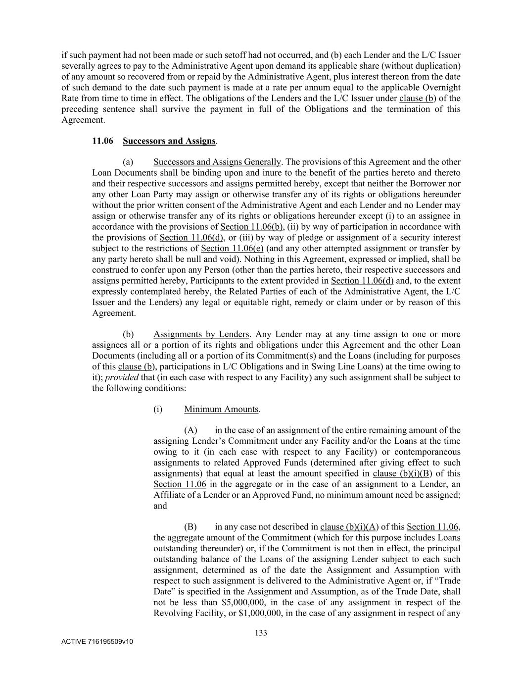 133 ACTIVE 716195509v10 if such payment had not been made or such setoff had not occurred, and (b) each Lender and the L/C Issuer severally agrees to pay to the Administrative Agent upon demand its applicable share (without duplication) of any amount so recovered from or repaid by the Administrative Agent, plus interest thereon from the date of such demand to the date such payment is made at a rate per annum equal to the applicable Overnight Rate from time to time in effect. The obligations of the Lenders and the L/C Issuer under clause (b) of the preceding sentence shall survive the payment in full of the Obligations and the termination of this Agreement. 11.06 Successors and Assigns. (a) Successors and Assigns Generally. The provisions of this Agreement and the other Loan Documents shall be binding upon and inure to the benefit of the parties hereto and thereto and their respective successors and assigns permitted hereby, except that neither the Borrower nor any other Loan Party may assign or otherwise transfer any of its rights or obligations hereunder without the prior written consent of the Administrative Agent and each Lender and no Lender may assign or otherwise transfer any of its rights or obligations hereunder except (i) to an assignee in accordance with the provisions of Section 11.06(b), (ii) by way of participation in accordance with the provisions of Section 11.06(d), or (iii) by way of pledge or assignment of a security interest subject to the restrictions of Section 11.06(e) (and any other attempted assignment or transfer by any party hereto shall be null and void). Nothing in this Agreement, expressed or implied, shall be construed to confer upon any Person (other than the parties hereto, their respective successors and assigns permitted hereby, Participants to the extent provided in Section 11.06(d) and, to the extent expressly contemplated hereby, the Related Parties of each of the Administrative Agent, the L/C Issuer and the Lenders) any legal or equitable right, remedy or claim under or by reason of this Agreement. (b) Assignments by Lenders. Any Lender may at any time assign to one or more assignees all or a portion of its rights and obligations under this Agreement and the other Loan Documents (including all or a portion of its Commitment(s) and the Loans (including for purposes of this clause (b), participations in L/C Obligations and in Swing Line Loans) at the time owing to it); provided that (in each case with respect to any Facility) any such assignment shall be subject to the following conditions: (i) Minimum Amounts. (A) in the case of an assignment of the entire remaining amount of the assigning Lender’s Commitment under any Facility and/or the Loans at the time owing to it (in each case with respect to any Facility) or contemporaneous assignments to related Approved Funds (determined after giving effect to such assignments) that equal at least the amount specified in clause (b)(i)(B) of this Section 11.06 in the aggregate or in the case of an assignment to a Lender, an Affiliate of a Lender or an Approved Fund, no minimum amount need be assigned; and (B) in any case not described in clause (b)(i)(A) of this Section 11.06, the aggregate amount of the Commitment (which for this purpose includes Loans outstanding thereunder) or, if the Commitment is not then in effect, the principal outstanding balance of the Loans of the assigning Lender subject to each such assignment, determined as of the date the Assignment and Assumption with respect to such assignment is delivered to the Administrative Agent or, if “Trade Date” is specified in the Assignment and Assumption, as of the Trade Date, shall not be less than $5,000,000, in the case of any assignment in respect of the Revolving Facility, or $1,000,000, in the case of any assignment in respect of any