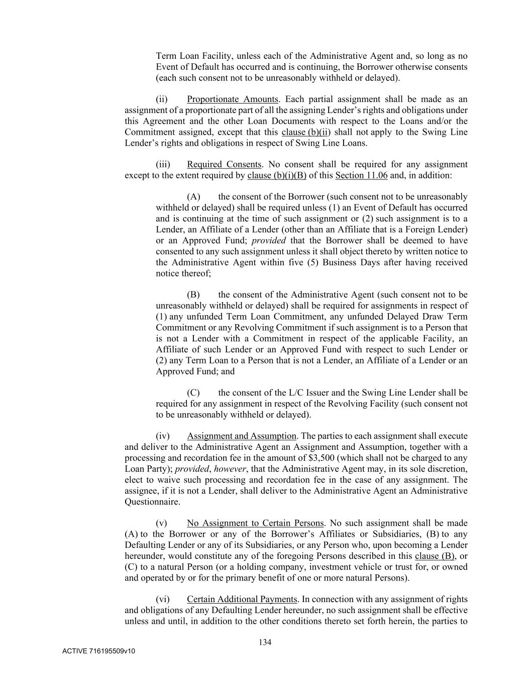 134 ACTIVE 716195509v10 Term Loan Facility, unless each of the Administrative Agent and, so long as no Event of Default has occurred and is continuing, the Borrower otherwise consents (each such consent not to be unreasonably withheld or delayed). (ii) Proportionate Amounts. Each partial assignment shall be made as an assignment of a proportionate part of all the assigning Lender’s rights and obligations under this Agreement and the other Loan Documents with respect to the Loans and/or the Commitment assigned, except that this clause (b)(ii) shall not apply to the Swing Line Lender’s rights and obligations in respect of Swing Line Loans. (iii) Required Consents. No consent shall be required for any assignment except to the extent required by clause (b)(i)(B) of this Section 11.06 and, in addition: (A) the consent of the Borrower (such consent not to be unreasonably withheld or delayed) shall be required unless (1) an Event of Default has occurred and is continuing at the time of such assignment or (2) such assignment is to a Lender, an Affiliate of a Lender (other than an Affiliate that is a Foreign Lender) or an Approved Fund; provided that the Borrower shall be deemed to have consented to any such assignment unless it shall object thereto by written notice to the Administrative Agent within five (5) Business Days after having received notice thereof; (B) the consent of the Administrative Agent (such consent not to be unreasonably withheld or delayed) shall be required for assignments in respect of (1) any unfunded Term Loan Commitment, any unfunded Delayed Draw Term Commitment or any Revolving Commitment if such assignment is to a Person that is not a Lender with a Commitment in respect of the applicable Facility, an Affiliate of such Lender or an Approved Fund with respect to such Lender or (2) any Term Loan to a Person that is not a Lender, an Affiliate of a Lender or an Approved Fund; and (C) the consent of the L/C Issuer and the Swing Line Lender shall be required for any assignment in respect of the Revolving Facility (such consent not to be unreasonably withheld or delayed). (iv) Assignment and Assumption. The parties to each assignment shall execute and deliver to the Administrative Agent an Assignment and Assumption, together with a processing and recordation fee in the amount of $3,500 (which shall not be charged to any Loan Party); provided, however, that the Administrative Agent may, in its sole discretion, elect to waive such processing and recordation fee in the case of any assignment. The assignee, if it is not a Lender, shall deliver to the Administrative Agent an Administrative Questionnaire. (v) No Assignment to Certain Persons. No such assignment shall be made (A) to the Borrower or any of the Borrower’s Affiliates or Subsidiaries, (B) to any Defaulting Lender or any of its Subsidiaries, or any Person who, upon becoming a Lender hereunder, would constitute any of the foregoing Persons described in this clause (B), or (C) to a natural Person (or a holding company, investment vehicle or trust for, or owned and operated by or for the primary benefit of one or more natural Persons). (vi) Certain Additional Payments. In connection with any assignment of rights and obligations of any Defaulting Lender hereunder, no such assignment shall be effective unless and until, in addition to the other conditions thereto set forth herein, the parties to