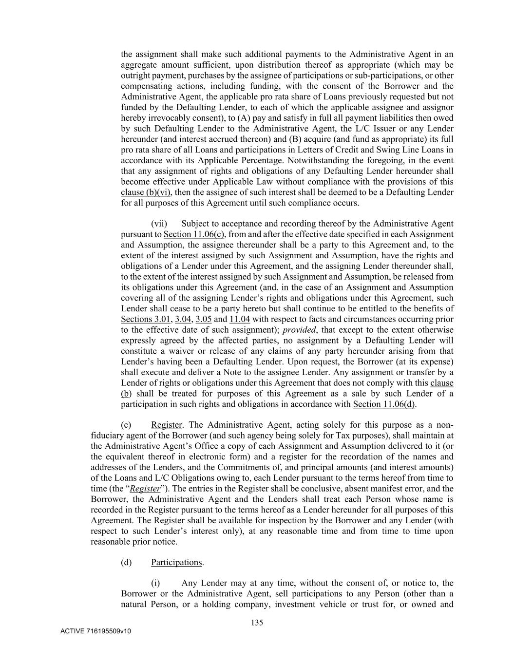 135 ACTIVE 716195509v10 the assignment shall make such additional payments to the Administrative Agent in an aggregate amount sufficient, upon distribution thereof as appropriate (which may be outright payment, purchases by the assignee of participations or sub-participations, or other compensating actions, including funding, with the consent of the Borrower and the Administrative Agent, the applicable pro rata share of Loans previously requested but not funded by the Defaulting Lender, to each of which the applicable assignee and assignor hereby irrevocably consent), to (A) pay and satisfy in full all payment liabilities then owed by such Defaulting Lender to the Administrative Agent, the L/C Issuer or any Lender hereunder (and interest accrued thereon) and (B) acquire (and fund as appropriate) its full pro rata share of all Loans and participations in Letters of Credit and Swing Line Loans in accordance with its Applicable Percentage. Notwithstanding the foregoing, in the event that any assignment of rights and obligations of any Defaulting Lender hereunder shall become effective under Applicable Law without compliance with the provisions of this clause (b)(vi), then the assignee of such interest shall be deemed to be a Defaulting Lender for all purposes of this Agreement until such compliance occurs. (vii) Subject to acceptance and recording thereof by the Administrative Agent pursuant to Section 11.06(c), from and after the effective date specified in each Assignment and Assumption, the assignee thereunder shall be a party to this Agreement and, to the extent of the interest assigned by such Assignment and Assumption, have the rights and obligations of a Lender under this Agreement, and the assigning Lender thereunder shall, to the extent of the interest assigned by such Assignment and Assumption, be released from its obligations under this Agreement (and, in the case of an Assignment and Assumption covering all of the assigning Lender’s rights and obligations under this Agreement, such Lender shall cease to be a party hereto but shall continue to be entitled to the benefits of Sections 3.01, 3.04, 3.05 and 11.04 with respect to facts and circumstances occurring prior to the effective date of such assignment); provided, that except to the extent otherwise expressly agreed by the affected parties, no assignment by a Defaulting Lender will constitute a waiver or release of any claims of any party hereunder arising from that Lender’s having been a Defaulting Lender. Upon request, the Borrower (at its expense) shall execute and deliver a Note to the assignee Lender. Any assignment or transfer by a Lender of rights or obligations under this Agreement that does not comply with this clause (b) shall be treated for purposes of this Agreement as a sale by such Lender of a participation in such rights and obligations in accordance with Section 11.06(d). (c) Register. The Administrative Agent, acting solely for this purpose as a non- fiduciary agent of the Borrower (and such agency being solely for Tax purposes), shall maintain at the Administrative Agent’s Office a copy of each Assignment and Assumption delivered to it (or the equivalent thereof in electronic form) and a register for the recordation of the names and addresses of the Lenders, and the Commitments of, and principal amounts (and interest amounts) of the Loans and L/C Obligations owing to, each Lender pursuant to the terms hereof from time to time (the “Register”). The entries in the Register shall be conclusive, absent manifest error, and the Borrower, the Administrative Agent and the Lenders shall treat each Person whose name is recorded in the Register pursuant to the terms hereof as a Lender hereunder for all purposes of this Agreement. The Register shall be available for inspection by the Borrower and any Lender (with respect to such Lender’s interest only), at any reasonable time and from time to time upon reasonable prior notice. (d) Participations. (i) Any Lender may at any time, without the consent of, or notice to, the Borrower or the Administrative Agent, sell participations to any Person (other than a natural Person, or a holding company, investment vehicle or trust for, or owned and