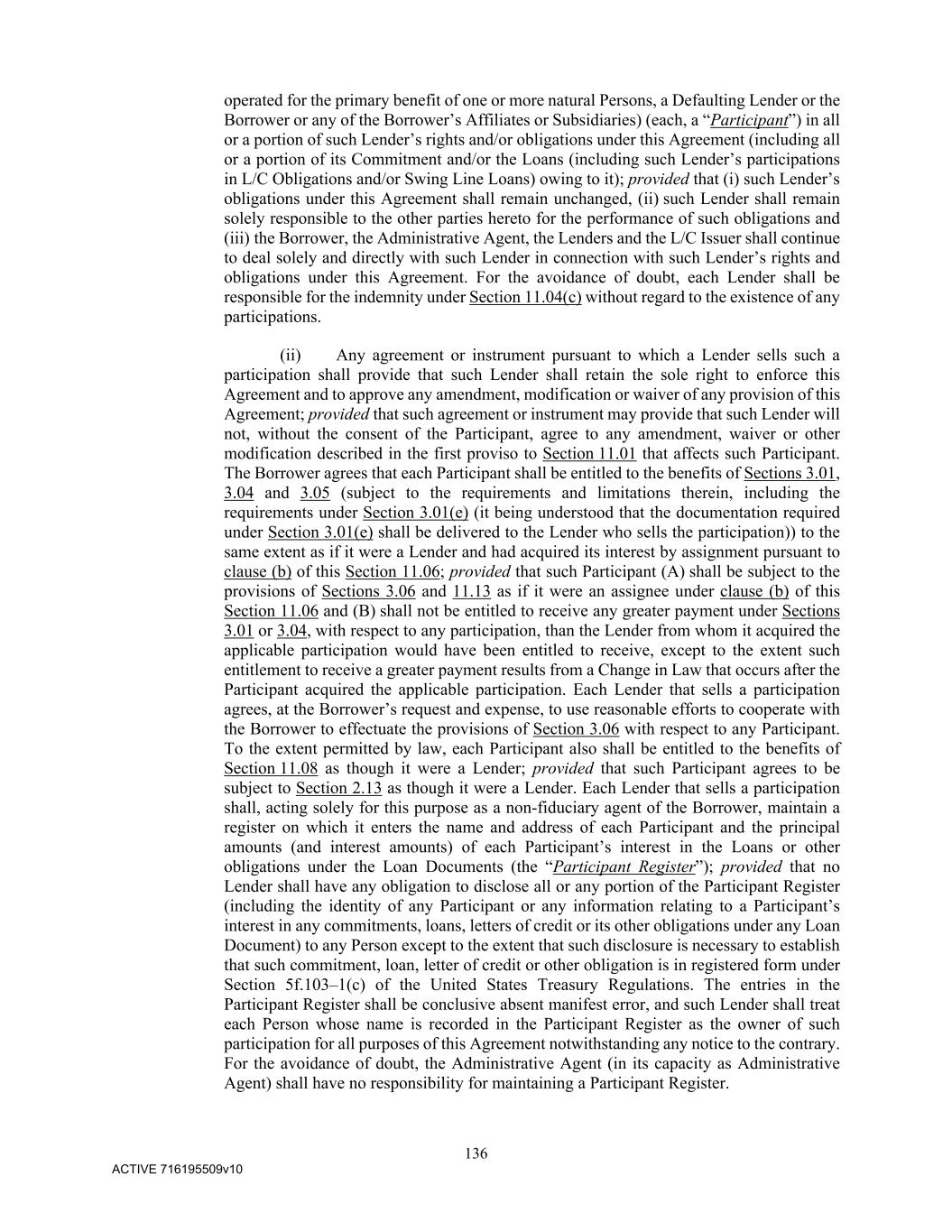 136 ACTIVE 716195509v10 operated for the primary benefit of one or more natural Persons, a Defaulting Lender or the Borrower or any of the Borrower’s Affiliates or Subsidiaries) (each, a “Participant”) in all or a portion of such Lender’s rights and/or obligations under this Agreement (including all or a portion of its Commitment and/or the Loans (including such Lender’s participations in L/C Obligations and/or Swing Line Loans) owing to it); provided that (i) such Lender’s obligations under this Agreement shall remain unchanged, (ii) such Lender shall remain solely responsible to the other parties hereto for the performance of such obligations and (iii) the Borrower, the Administrative Agent, the Lenders and the L/C Issuer shall continue to deal solely and directly with such Lender in connection with such Lender’s rights and obligations under this Agreement. For the avoidance of doubt, each Lender shall be responsible for the indemnity under Section 11.04(c) without regard to the existence of any participations. (ii) Any agreement or instrument pursuant to which a Lender sells such a participation shall provide that such Lender shall retain the sole right to enforce this Agreement and to approve any amendment, modification or waiver of any provision of this Agreement; provided that such agreement or instrument may provide that such Lender will not, without the consent of the Participant, agree to any amendment, waiver or other modification described in the first proviso to Section 11.01 that affects such Participant. The Borrower agrees that each Participant shall be entitled to the benefits of Sections 3.01, 3.04 and 3.05 (subject to the requirements and limitations therein, including the requirements under Section 3.01(e) (it being understood that the documentation required under Section 3.01(e) shall be delivered to the Lender who sells the participation)) to the same extent as if it were a Lender and had acquired its interest by assignment pursuant to clause (b) of this Section 11.06; provided that such Participant (A) shall be subject to the provisions of Sections 3.06 and 11.13 as if it were an assignee under clause (b) of this Section 11.06 and (B) shall not be entitled to receive any greater payment under Sections 3.01 or 3.04, with respect to any participation, than the Lender from whom it acquired the applicable participation would have been entitled to receive, except to the extent such entitlement to receive a greater payment results from a Change in Law that occurs after the Participant acquired the applicable participation. Each Lender that sells a participation agrees, at the Borrower’s request and expense, to use reasonable efforts to cooperate with the Borrower to effectuate the provisions of Section 3.06 with respect to any Participant. To the extent permitted by law, each Participant also shall be entitled to the benefits of Section 11.08 as though it were a Lender; provided that such Participant agrees to be subject to Section 2.13 as though it were a Lender. Each Lender that sells a participation shall, acting solely for this purpose as a non-fiduciary agent of the Borrower, maintain a register on which it enters the name and address of each Participant and the principal amounts (and interest amounts) of each Participant’s interest in the Loans or other obligations under the Loan Documents (the “Participant Register”); provided that no Lender shall have any obligation to disclose all or any portion of the Participant Register (including the identity of any Participant or any information relating to a Participant’s interest in any commitments, loans, letters of credit or its other obligations under any Loan Document) to any Person except to the extent that such disclosure is necessary to establish that such commitment, loan, letter of credit or other obligation is in registered form under Section 5f.103–1(c) of the United States Treasury Regulations. The entries in the Participant Register shall be conclusive absent manifest error, and such Lender shall treat each Person whose name is recorded in the Participant Register as the owner of such participation for all purposes of this Agreement notwithstanding any notice to the contrary. For the avoidance of doubt, the Administrative Agent (in its capacity as Administrative Agent) shall have no responsibility for maintaining a Participant Register.