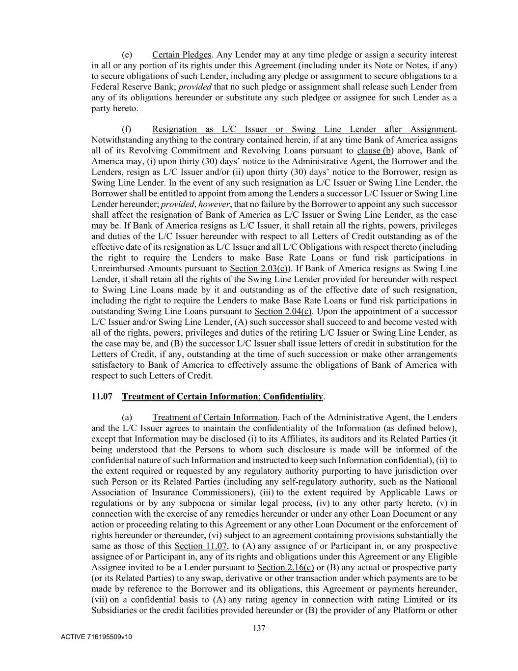 137 ACTIVE 716195509v10 (e) Certain Pledges. Any Lender may at any time pledge or assign a security interest in all or any portion of its rights under this Agreement (including under its Note or Notes, if any) to secure obligations of such Lender, including any pledge or assignment to secure obligations to a Federal Reserve Bank; provided that no such pledge or assignment shall release such Lender from any of its obligations hereunder or substitute any such pledgee or assignee for such Lender as a party hereto. (f) Resignation as L/C Issuer or Swing Line Lender after Assignment. Notwithstanding anything to the contrary contained herein, if at any time Bank of America assigns all of its Revolving Commitment and Revolving Loans pursuant to clause (b) above, Bank of America may, (i) upon thirty (30) days’ notice to the Administrative Agent, the Borrower and the Lenders, resign as L/C Issuer and/or (ii) upon thirty (30) days’ notice to the Borrower, resign as Swing Line Lender. In the event of any such resignation as L/C Issuer or Swing Line Lender, the Borrower shall be entitled to appoint from among the Lenders a successor L/C Issuer or Swing Line Lender hereunder; provided, however, that no failure by the Borrower to appoint any such successor shall affect the resignation of Bank of America as L/C Issuer or Swing Line Lender, as the case may be. If Bank of America resigns as L/C Issuer, it shall retain all the rights, powers, privileges and duties of the L/C Issuer hereunder with respect to all Letters of Credit outstanding as of the effective date of its resignation as L/C Issuer and all L/C Obligations with respect thereto (including the right to require the Lenders to make Base Rate Loans or fund risk participations in Unreimbursed Amounts pursuant to Section 2.03(c)). If Bank of America resigns as Swing Line Lender, it shall retain all the rights of the Swing Line Lender provided for hereunder with respect to Swing Line Loans made by it and outstanding as of the effective date of such resignation, including the right to require the Lenders to make Base Rate Loans or fund risk participations in outstanding Swing Line Loans pursuant to Section 2.04(c). Upon the appointment of a successor L/C Issuer and/or Swing Line Lender, (A) such successor shall succeed to and become vested with all of the rights, powers, privileges and duties of the retiring L/C Issuer or Swing Line Lender, as the case may be, and (B) the successor L/C Issuer shall issue letters of credit in substitution for the Letters of Credit, if any, outstanding at the time of such succession or make other arrangements satisfactory to Bank of America to effectively assume the obligations of Bank of America with respect to such Letters of Credit. 11.07 Treatment of Certain Information; Confidentiality. (a) Treatment of Certain Information. Each of the Administrative Agent, the Lenders and the L/C Issuer agrees to maintain the confidentiality of the Information (as defined below), except that Information may be disclosed (i) to its Affiliates, its auditors and its Related Parties (it being understood that the Persons to whom such disclosure is made will be informed of the confidential nature of such Information and instructed to keep such Information confidential), (ii) to the extent required or requested by any regulatory authority purporting to have jurisdiction over such Person or its Related Parties (including any self-regulatory authority, such as the National Association of Insurance Commissioners), (iii) to the extent required by Applicable Laws or regulations or by any subpoena or similar legal process, (iv) to any other party hereto, (v) in connection with the exercise of any remedies hereunder or under any other Loan Document or any action or proceeding relating to this Agreement or any other Loan Document or the enforcement of rights hereunder or thereunder, (vi) subject to an agreement containing provisions substantially the same as those of this Section 11.07, to (A) any assignee of or Participant in, or any prospective assignee of or Participant in, any of its rights and obligations under this Agreement or any Eligible Assignee invited to be a Lender pursuant to Section 2.16(c) or (B) any actual or prospective party (or its Related Parties) to any swap, derivative or other transaction under which payments are to be made by reference to the Borrower and its obligations, this Agreement or payments hereunder, (vii) on a confidential basis to (A) any rating agency in connection with rating Limited or its Subsidiaries or the credit facilities provided hereunder or (B) the provider of any Platform or other