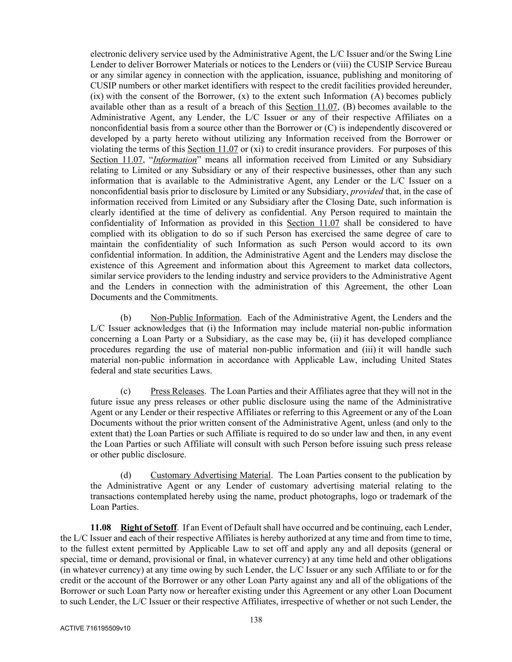 138 ACTIVE 716195509v10 electronic delivery service used by the Administrative Agent, the L/C Issuer and/or the Swing Line Lender to deliver Borrower Materials or notices to the Lenders or (viii) the CUSIP Service Bureau or any similar agency in connection with the application, issuance, publishing and monitoring of CUSIP numbers or other market identifiers with respect to the credit facilities provided hereunder, (ix) with the consent of the Borrower, (x) to the extent such Information (A) becomes publicly available other than as a result of a breach of this Section 11.07, (B) becomes available to the Administrative Agent, any Lender, the L/C Issuer or any of their respective Affiliates on a nonconfidential basis from a source other than the Borrower or (C) is independently discovered or developed by a party hereto without utilizing any Information received from the Borrower or violating the terms of this Section 11.07 or (xi) to credit insurance providers. For purposes of this Section 11.07, “Information” means all information received from Limited or any Subsidiary relating to Limited or any Subsidiary or any of their respective businesses, other than any such information that is available to the Administrative Agent, any Lender or the L/C Issuer on a nonconfidential basis prior to disclosure by Limited or any Subsidiary, provided that, in the case of information received from Limited or any Subsidiary after the Closing Date, such information is clearly identified at the time of delivery as confidential. Any Person required to maintain the confidentiality of Information as provided in this Section 11.07 shall be considered to have complied with its obligation to do so if such Person has exercised the same degree of care to maintain the confidentiality of such Information as such Person would accord to its own confidential information. In addition, the Administrative Agent and the Lenders may disclose the existence of this Agreement and information about this Agreement to market data collectors, similar service providers to the lending industry and service providers to the Administrative Agent and the Lenders in connection with the administration of this Agreement, the other Loan Documents and the Commitments. (b) Non-Public Information. Each of the Administrative Agent, the Lenders and the L/C Issuer acknowledges that (i) the Information may include material non-public information concerning a Loan Party or a Subsidiary, as the case may be, (ii) it has developed compliance procedures regarding the use of material non-public information and (iii) it will handle such material non-public information in accordance with Applicable Law, including United States federal and state securities Laws. (c) Press Releases. The Loan Parties and their Affiliates agree that they will not in the future issue any press releases or other public disclosure using the name of the Administrative Agent or any Lender or their respective Affiliates or referring to this Agreement or any of the Loan Documents without the prior written consent of the Administrative Agent, unless (and only to the extent that) the Loan Parties or such Affiliate is required to do so under law and then, in any event the Loan Parties or such Affiliate will consult with such Person before issuing such press release or other public disclosure. (d) Customary Advertising Material. The Loan Parties consent to the publication by the Administrative Agent or any Lender of customary advertising material relating to the transactions contemplated hereby using the name, product photographs, logo or trademark of the Loan Parties. 11.08 Right of Setoff. If an Event of Default shall have occurred and be continuing, each Lender, the L/C Issuer and each of their respective Affiliates is hereby authorized at any time and from time to time, to the fullest extent permitted by Applicable Law to set off and apply any and all deposits (general or special, time or demand, provisional or final, in whatever currency) at any time held and other obligations (in whatever currency) at any time owing by such Lender, the L/C Issuer or any such Affiliate to or for the credit or the account of the Borrower or any other Loan Party against any and all of the obligations of the Borrower or such Loan Party now or hereafter existing under this Agreement or any other Loan Document to such Lender, the L/C Issuer or their respective Affiliates, irrespective of whether or not such Lender, the
