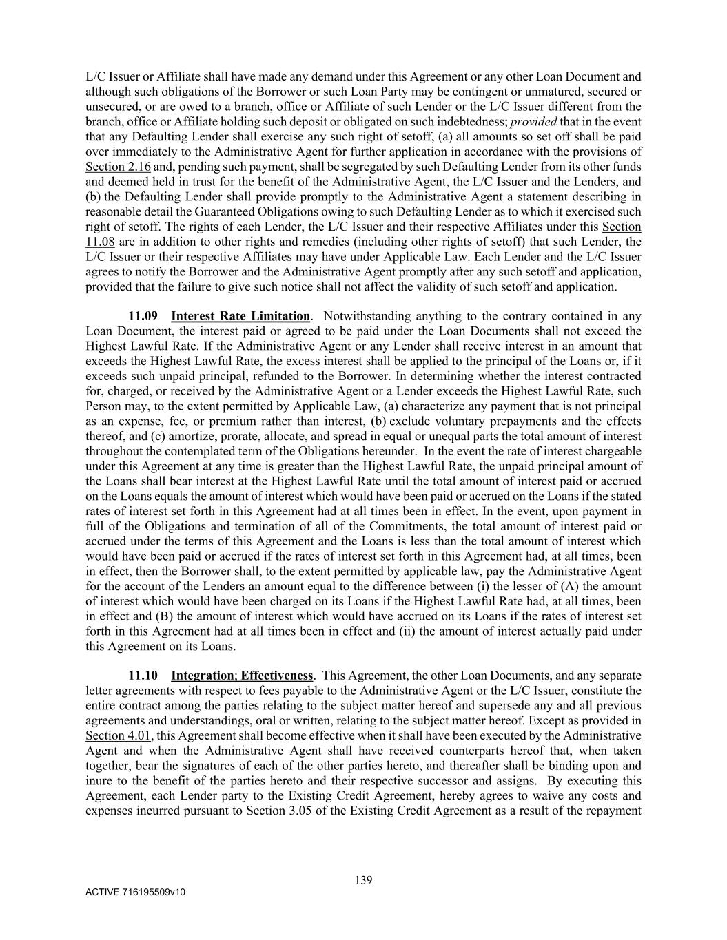 139 ACTIVE 716195509v10 L/C Issuer or Affiliate shall have made any demand under this Agreement or any other Loan Document and although such obligations of the Borrower or such Loan Party may be contingent or unmatured, secured or unsecured, or are owed to a branch, office or Affiliate of such Lender or the L/C Issuer different from the branch, office or Affiliate holding such deposit or obligated on such indebtedness; provided that in the event that any Defaulting Lender shall exercise any such right of setoff, (a) all amounts so set off shall be paid over immediately to the Administrative Agent for further application in accordance with the provisions of Section 2.16 and, pending such payment, shall be segregated by such Defaulting Lender from its other funds and deemed held in trust for the benefit of the Administrative Agent, the L/C Issuer and the Lenders, and (b) the Defaulting Lender shall provide promptly to the Administrative Agent a statement describing in reasonable detail the Guaranteed Obligations owing to such Defaulting Lender as to which it exercised such right of setoff. The rights of each Lender, the L/C Issuer and their respective Affiliates under this Section 11.08 are in addition to other rights and remedies (including other rights of setoff) that such Lender, the L/C Issuer or their respective Affiliates may have under Applicable Law. Each Lender and the L/C Issuer agrees to notify the Borrower and the Administrative Agent promptly after any such setoff and application, provided that the failure to give such notice shall not affect the validity of such setoff and application. 11.09 Interest Rate Limitation. Notwithstanding anything to the contrary contained in any Loan Document, the interest paid or agreed to be paid under the Loan Documents shall not exceed the Highest Lawful Rate. If the Administrative Agent or any Lender shall receive interest in an amount that exceeds the Highest Lawful Rate, the excess interest shall be applied to the principal of the Loans or, if it exceeds such unpaid principal, refunded to the Borrower. In determining whether the interest contracted for, charged, or received by the Administrative Agent or a Lender exceeds the Highest Lawful Rate, such Person may, to the extent permitted by Applicable Law, (a) characterize any payment that is not principal as an expense, fee, or premium rather than interest, (b) exclude voluntary prepayments and the effects thereof, and (c) amortize, prorate, allocate, and spread in equal or unequal parts the total amount of interest throughout the contemplated term of the Obligations hereunder. In the event the rate of interest chargeable under this Agreement at any time is greater than the Highest Lawful Rate, the unpaid principal amount of the Loans shall bear interest at the Highest Lawful Rate until the total amount of interest paid or accrued on the Loans equals the amount of interest which would have been paid or accrued on the Loans if the stated rates of interest set forth in this Agreement had at all times been in effect. In the event, upon payment in full of the Obligations and termination of all of the Commitments, the total amount of interest paid or accrued under the terms of this Agreement and the Loans is less than the total amount of interest which would have been paid or accrued if the rates of interest set forth in this Agreement had, at all times, been in effect, then the Borrower shall, to the extent permitted by applicable law, pay the Administrative Agent for the account of the Lenders an amount equal to the difference between (i) the lesser of (A) the amount of interest which would have been charged on its Loans if the Highest Lawful Rate had, at all times, been in effect and (B) the amount of interest which would have accrued on its Loans if the rates of interest set forth in this Agreement had at all times been in effect and (ii) the amount of interest actually paid under this Agreement on its Loans. 11.10 Integration; Effectiveness. This Agreement, the other Loan Documents, and any separate letter agreements with respect to fees payable to the Administrative Agent or the L/C Issuer, constitute the entire contract among the parties relating to the subject matter hereof and supersede any and all previous agreements and understandings, oral or written, relating to the subject matter hereof. Except as provided in Section 4.01, this Agreement shall become effective when it shall have been executed by the Administrative Agent and when the Administrative Agent shall have received counterparts hereof that, when taken together, bear the signatures of each of the other parties hereto, and thereafter shall be binding upon and inure to the benefit of the parties hereto and their respective successor and assigns. By executing this Agreement, each Lender party to the Existing Credit Agreement, hereby agrees to waive any costs and expenses incurred pursuant to Section 3.05 of the Existing Credit Agreement as a result of the repayment