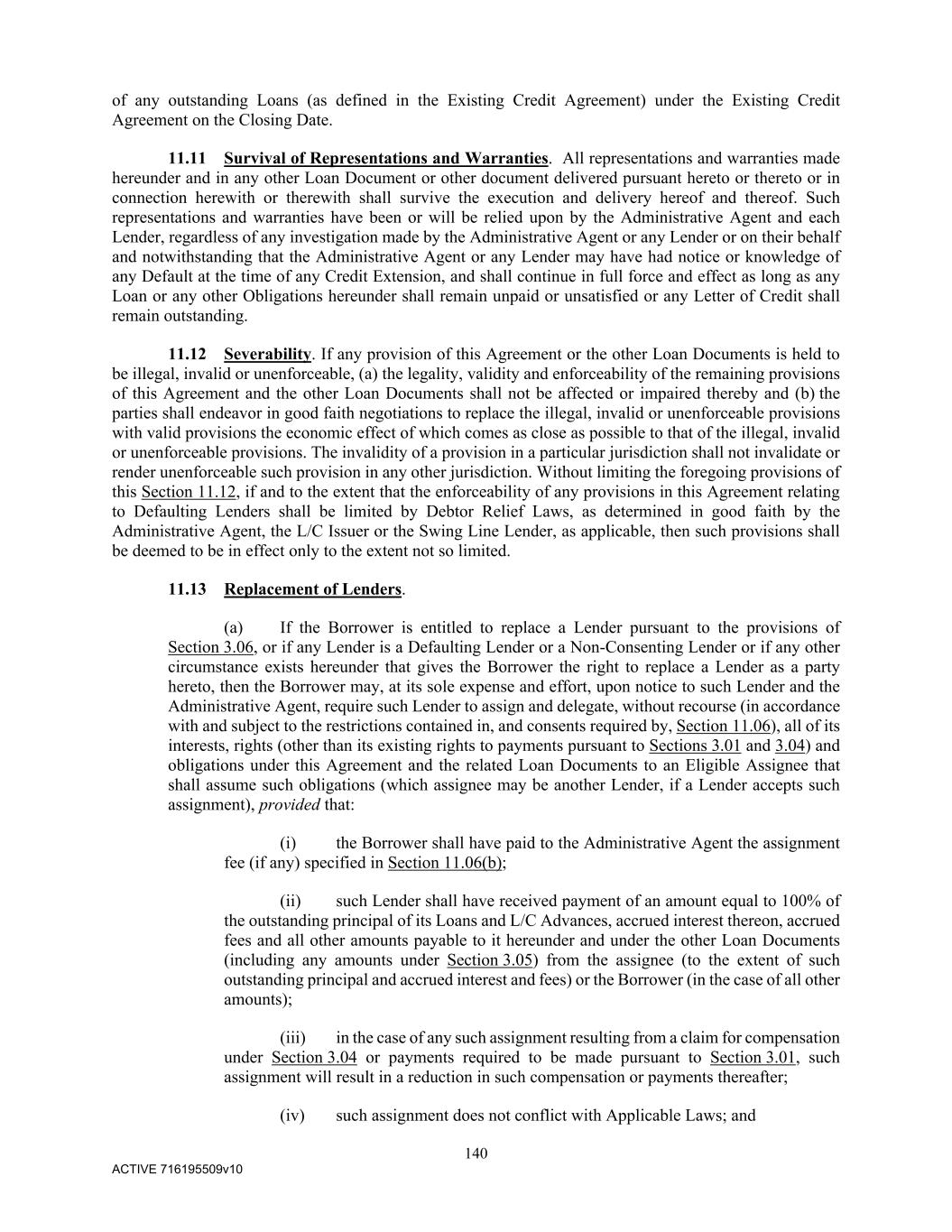140 ACTIVE 716195509v10 of any outstanding Loans (as defined in the Existing Credit Agreement) under the Existing Credit Agreement on the Closing Date. 11.11 Survival of Representations and Warranties. All representations and warranties made hereunder and in any other Loan Document or other document delivered pursuant hereto or thereto or in connection herewith or therewith shall survive the execution and delivery hereof and thereof. Such representations and warranties have been or will be relied upon by the Administrative Agent and each Lender, regardless of any investigation made by the Administrative Agent or any Lender or on their behalf and notwithstanding that the Administrative Agent or any Lender may have had notice or knowledge of any Default at the time of any Credit Extension, and shall continue in full force and effect as long as any Loan or any other Obligations hereunder shall remain unpaid or unsatisfied or any Letter of Credit shall remain outstanding. 11.12 Severability. If any provision of this Agreement or the other Loan Documents is held to be illegal, invalid or unenforceable, (a) the legality, validity and enforceability of the remaining provisions of this Agreement and the other Loan Documents shall not be affected or impaired thereby and (b) the parties shall endeavor in good faith negotiations to replace the illegal, invalid or unenforceable provisions with valid provisions the economic effect of which comes as close as possible to that of the illegal, invalid or unenforceable provisions. The invalidity of a provision in a particular jurisdiction shall not invalidate or render unenforceable such provision in any other jurisdiction. Without limiting the foregoing provisions of this Section 11.12, if and to the extent that the enforceability of any provisions in this Agreement relating to Defaulting Lenders shall be limited by Debtor Relief Laws, as determined in good faith by the Administrative Agent, the L/C Issuer or the Swing Line Lender, as applicable, then such provisions shall be deemed to be in effect only to the extent not so limited. 11.13 Replacement of Lenders. (a) If the Borrower is entitled to replace a Lender pursuant to the provisions of Section 3.06, or if any Lender is a Defaulting Lender or a Non-Consenting Lender or if any other circumstance exists hereunder that gives the Borrower the right to replace a Lender as a party hereto, then the Borrower may, at its sole expense and effort, upon notice to such Lender and the Administrative Agent, require such Lender to assign and delegate, without recourse (in accordance with and subject to the restrictions contained in, and consents required by, Section 11.06), all of its interests, rights (other than its existing rights to payments pursuant to Sections 3.01 and 3.04) and obligations under this Agreement and the related Loan Documents to an Eligible Assignee that shall assume such obligations (which assignee may be another Lender, if a Lender accepts such assignment), provided that: (i) the Borrower shall have paid to the Administrative Agent the assignment fee (if any) specified in Section 11.06(b); (ii) such Lender shall have received payment of an amount equal to 100% of the outstanding principal of its Loans and L/C Advances, accrued interest thereon, accrued fees and all other amounts payable to it hereunder and under the other Loan Documents (including any amounts under Section 3.05) from the assignee (to the extent of such outstanding principal and accrued interest and fees) or the Borrower (in the case of all other amounts); (iii) in the case of any such assignment resulting from a claim for compensation under Section 3.04 or payments required to be made pursuant to Section 3.01, such assignment will result in a reduction in such compensation or payments thereafter; (iv) such assignment does not conflict with Applicable Laws; and