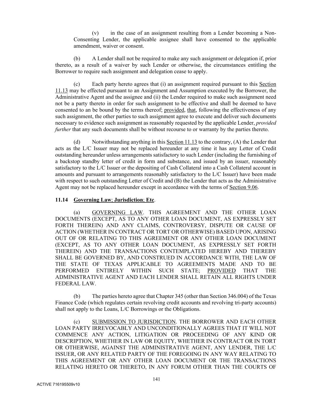 141 ACTIVE 716195509v10 (v) in the case of an assignment resulting from a Lender becoming a Non- Consenting Lender, the applicable assignee shall have consented to the applicable amendment, waiver or consent. (b) A Lender shall not be required to make any such assignment or delegation if, prior thereto, as a result of a waiver by such Lender or otherwise, the circumstances entitling the Borrower to require such assignment and delegation cease to apply. (c) Each party hereto agrees that (i) an assignment required pursuant to this Section 11.13 may be effected pursuant to an Assignment and Assumption executed by the Borrower, the Administrative Agent and the assignee and (ii) the Lender required to make such assignment need not be a party thereto in order for such assignment to be effective and shall be deemed to have consented to an be bound by the terms thereof; provided, that, following the effectiveness of any such assignment, the other parties to such assignment agree to execute and deliver such documents necessary to evidence such assignment as reasonably requested by the applicable Lender, provided further that any such documents shall be without recourse to or warranty by the parties thereto. (d) Notwithstanding anything in this Section 11.13 to the contrary, (A) the Lender that acts as the L/C Issuer may not be replaced hereunder at any time it has any Letter of Credit outstanding hereunder unless arrangements satisfactory to such Lender (including the furnishing of a backstop standby letter of credit in form and substance, and issued by an issuer, reasonably satisfactory to the L/C Issuer or the depositing of Cash Collateral into a Cash Collateral account in amounts and pursuant to arrangements reasonably satisfactory to the L/C Issuer) have been made with respect to such outstanding Letter of Credit and (B) the Lender that acts as the Administrative Agent may not be replaced hereunder except in accordance with the terms of Section 9.06. 11.14 Governing Law; Jurisdiction; Etc. (a) GOVERNING LAW. THIS AGREEMENT AND THE OTHER LOAN DOCUMENTS (EXCEPT, AS TO ANY OTHER LOAN DOCUMENT, AS EXPRESSLY SET FORTH THEREIN) AND ANY CLAIMS, CONTROVERSY, DISPUTE OR CAUSE OF ACTION (WHETHER IN CONTRACT OR TORT OR OTHERWISE) BASED UPON, ARISING OUT OF OR RELATING TO THIS AGREEMENT OR ANY OTHER LOAN DOCUMENT (EXCEPT, AS TO ANY OTHER LOAN DOCUMENT, AS EXPRESSLY SET FORTH THEREIN) AND THE TRANSACTIONS CONTEMPLATED HEREBY AND THEREBY SHALL BE GOVERNED BY, AND CONSTRUED IN ACCORDANCE WITH, THE LAW OF THE STATE OF TEXAS APPLICABLE TO AGREEMENTS MADE AND TO BE PERFORMED ENTIRELY WITHIN SUCH STATE; PROVIDED THAT THE ADMINISTRATIVE AGENT AND EACH LENDER SHALL RETAIN ALL RIGHTS UNDER FEDERAL LAW. (b) The parties hereto agree that Chapter 345 (other than Section 346.004) of the Texas Finance Code (which regulates certain revolving credit accounts and revolving tri-party accounts) shall not apply to the Loans, L/C Borrowings or the Obligations. (c) SUBMISSION TO JURISDICTION. THE BORROWER AND EACH OTHER LOAN PARTY IRREVOCABLY AND UNCONDITIONALLY AGREES THAT IT WILL NOT COMMENCE ANY ACTION, LITIGATION OR PROCEEDING OF ANY KIND OR DESCRIPTION, WHETHER IN LAW OR EQUITY, WHETHER IN CONTRACT OR IN TORT OR OTHERWISE, AGAINST THE ADMINISTRATIVE AGENT, ANY LENDER, THE L/C ISSUER, OR ANY RELATED PARTY OF THE FOREGOING IN ANY WAY RELATING TO THIS AGREEMENT OR ANY OTHER LOAN DOCUMENT OR THE TRANSACTIONS RELATING HERETO OR THERETO, IN ANY FORUM OTHER THAN THE COURTS OF