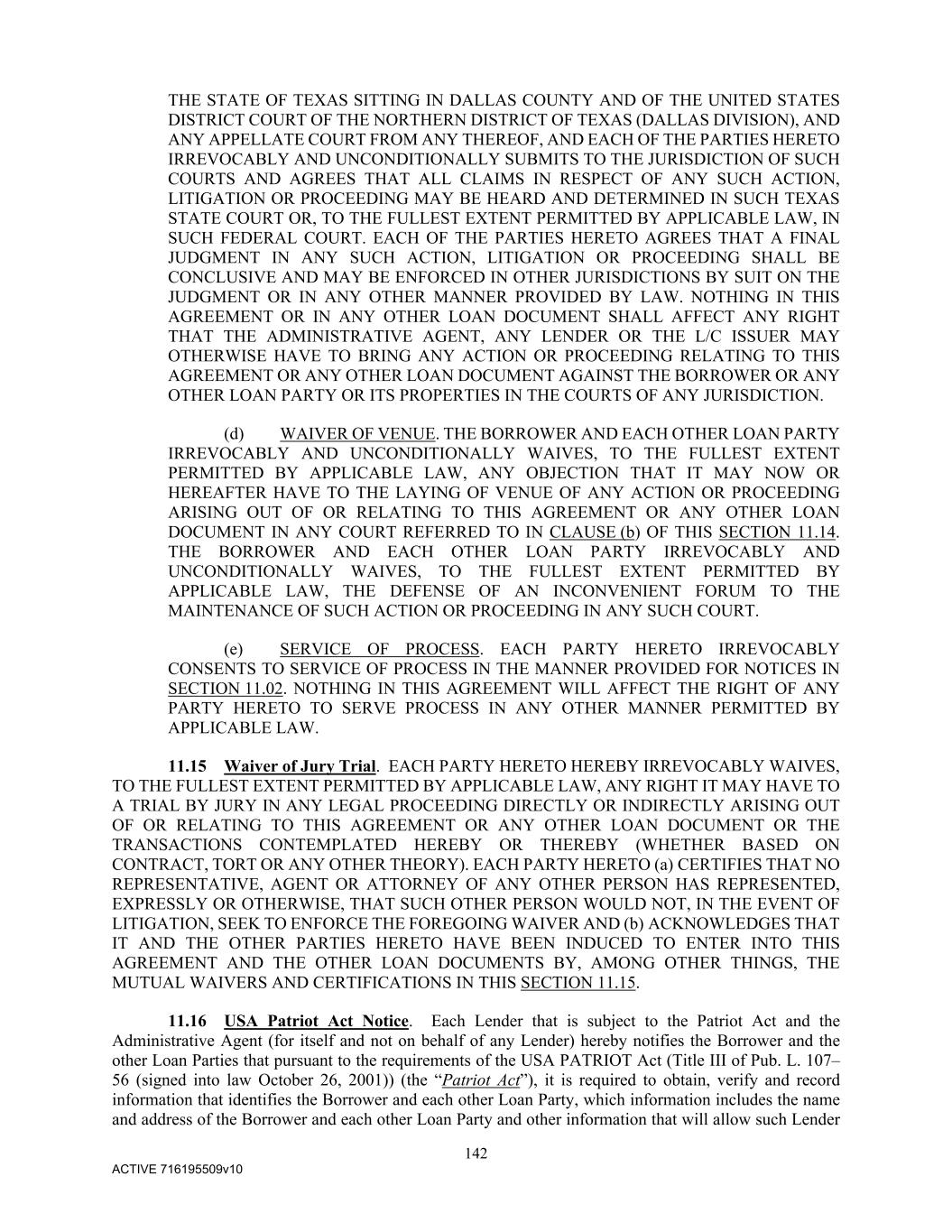 142 ACTIVE 716195509v10 THE STATE OF TEXAS SITTING IN DALLAS COUNTY AND OF THE UNITED STATES DISTRICT COURT OF THE NORTHERN DISTRICT OF TEXAS (DALLAS DIVISION), AND ANY APPELLATE COURT FROM ANY THEREOF, AND EACH OF THE PARTIES HERETO IRREVOCABLY AND UNCONDITIONALLY SUBMITS TO THE JURISDICTION OF SUCH COURTS AND AGREES THAT ALL CLAIMS IN RESPECT OF ANY SUCH ACTION, LITIGATION OR PROCEEDING MAY BE HEARD AND DETERMINED IN SUCH TEXAS STATE COURT OR, TO THE FULLEST EXTENT PERMITTED BY APPLICABLE LAW, IN SUCH FEDERAL COURT. EACH OF THE PARTIES HERETO AGREES THAT A FINAL JUDGMENT IN ANY SUCH ACTION, LITIGATION OR PROCEEDING SHALL BE CONCLUSIVE AND MAY BE ENFORCED IN OTHER JURISDICTIONS BY SUIT ON THE JUDGMENT OR IN ANY OTHER MANNER PROVIDED BY LAW. NOTHING IN THIS AGREEMENT OR IN ANY OTHER LOAN DOCUMENT SHALL AFFECT ANY RIGHT THAT THE ADMINISTRATIVE AGENT, ANY LENDER OR THE L/C ISSUER MAY OTHERWISE HAVE TO BRING ANY ACTION OR PROCEEDING RELATING TO THIS AGREEMENT OR ANY OTHER LOAN DOCUMENT AGAINST THE BORROWER OR ANY OTHER LOAN PARTY OR ITS PROPERTIES IN THE COURTS OF ANY JURISDICTION. (d) WAIVER OF VENUE. THE BORROWER AND EACH OTHER LOAN PARTY IRREVOCABLY AND UNCONDITIONALLY WAIVES, TO THE FULLEST EXTENT PERMITTED BY APPLICABLE LAW, ANY OBJECTION THAT IT MAY NOW OR HEREAFTER HAVE TO THE LAYING OF VENUE OF ANY ACTION OR PROCEEDING ARISING OUT OF OR RELATING TO THIS AGREEMENT OR ANY OTHER LOAN DOCUMENT IN ANY COURT REFERRED TO IN CLAUSE (b) OF THIS SECTION 11.14. THE BORROWER AND EACH OTHER LOAN PARTY IRREVOCABLY AND UNCONDITIONALLY WAIVES, TO THE FULLEST EXTENT PERMITTED BY APPLICABLE LAW, THE DEFENSE OF AN INCONVENIENT FORUM TO THE MAINTENANCE OF SUCH ACTION OR PROCEEDING IN ANY SUCH COURT. (e) SERVICE OF PROCESS. EACH PARTY HERETO IRREVOCABLY CONSENTS TO SERVICE OF PROCESS IN THE MANNER PROVIDED FOR NOTICES IN SECTION 11.02. NOTHING IN THIS AGREEMENT WILL AFFECT THE RIGHT OF ANY PARTY HERETO TO SERVE PROCESS IN ANY OTHER MANNER PERMITTED BY APPLICABLE LAW. 11.15 Waiver of Jury Trial. EACH PARTY HERETO HEREBY IRREVOCABLY WAIVES, TO THE FULLEST EXTENT PERMITTED BY APPLICABLE LAW, ANY RIGHT IT MAY HAVE TO A TRIAL BY JURY IN ANY LEGAL PROCEEDING DIRECTLY OR INDIRECTLY ARISING OUT OF OR RELATING TO THIS AGREEMENT OR ANY OTHER LOAN DOCUMENT OR THE TRANSACTIONS CONTEMPLATED HEREBY OR THEREBY (WHETHER BASED ON CONTRACT, TORT OR ANY OTHER THEORY). EACH PARTY HERETO (a) CERTIFIES THAT NO REPRESENTATIVE, AGENT OR ATTORNEY OF ANY OTHER PERSON HAS REPRESENTED, EXPRESSLY OR OTHERWISE, THAT SUCH OTHER PERSON WOULD NOT, IN THE EVENT OF LITIGATION, SEEK TO ENFORCE THE FOREGOING WAIVER AND (b) ACKNOWLEDGES THAT IT AND THE OTHER PARTIES HERETO HAVE BEEN INDUCED TO ENTER INTO THIS AGREEMENT AND THE OTHER LOAN DOCUMENTS BY, AMONG OTHER THINGS, THE MUTUAL WAIVERS AND CERTIFICATIONS IN THIS SECTION 11.15. 11.16 USA Patriot Act Notice. Each Lender that is subject to the Patriot Act and the Administrative Agent (for itself and not on behalf of any Lender) hereby notifies the Borrower and the other Loan Parties that pursuant to the requirements of the USA PATRIOT Act (Title III of Pub. L. 107– 56 (signed into law October 26, 2001)) (the “Patriot Act”), it is required to obtain, verify and record information that identifies the Borrower and each other Loan Party, which information includes the name and address of the Borrower and each other Loan Party and other information that will allow such Lender