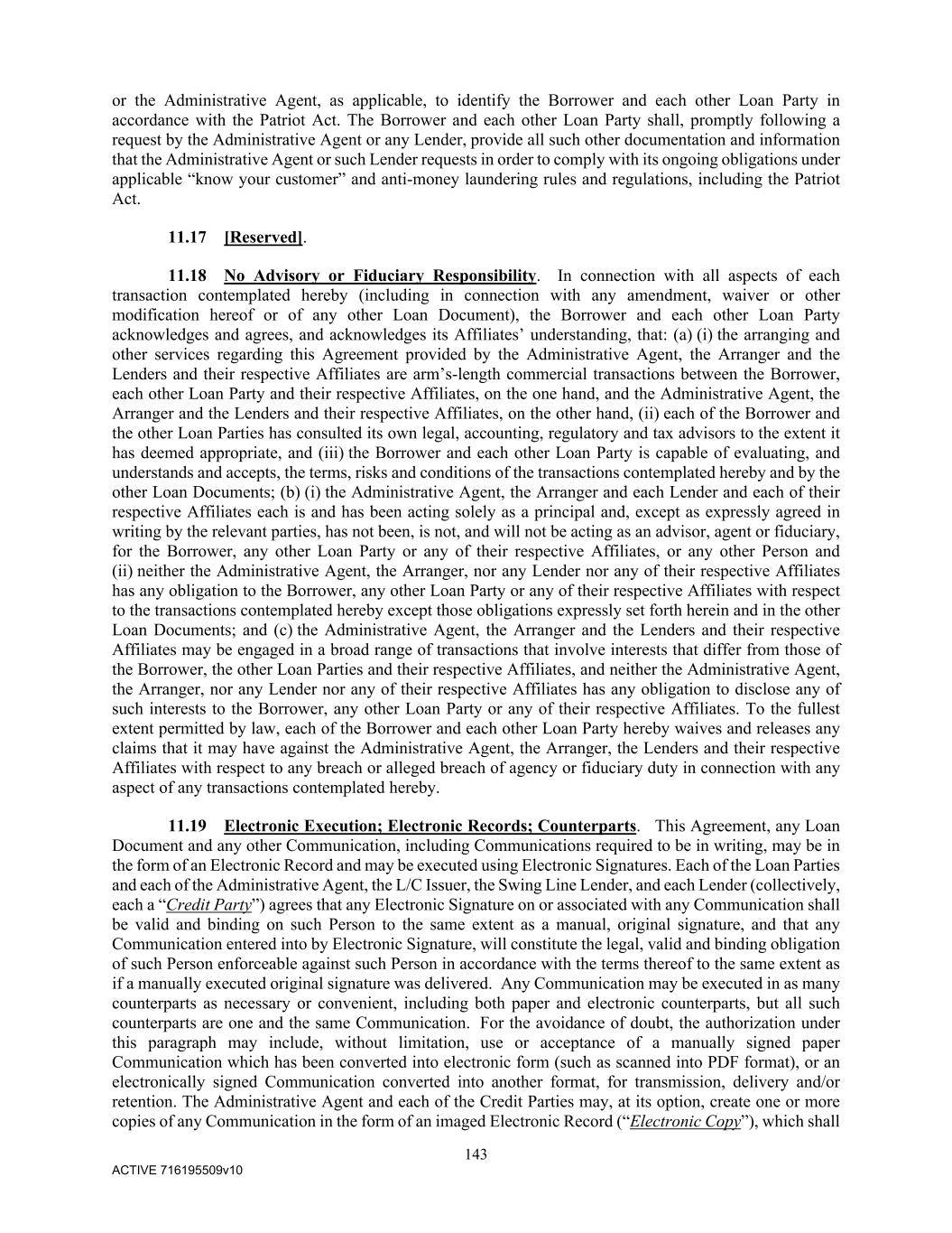 143 ACTIVE 716195509v10 or the Administrative Agent, as applicable, to identify the Borrower and each other Loan Party in accordance with the Patriot Act. The Borrower and each other Loan Party shall, promptly following a request by the Administrative Agent or any Lender, provide all such other documentation and information that the Administrative Agent or such Lender requests in order to comply with its ongoing obligations under applicable “know your customer” and anti-money laundering rules and regulations, including the Patriot Act. 11.17 [Reserved]. 11.18 No Advisory or Fiduciary Responsibility. In connection with all aspects of each transaction contemplated hereby (including in connection with any amendment, waiver or other modification hereof or of any other Loan Document), the Borrower and each other Loan Party acknowledges and agrees, and acknowledges its Affiliates’ understanding, that: (a) (i) the arranging and other services regarding this Agreement provided by the Administrative Agent, the Arranger and the Lenders and their respective Affiliates are arm’s-length commercial transactions between the Borrower, each other Loan Party and their respective Affiliates, on the one hand, and the Administrative Agent, the Arranger and the Lenders and their respective Affiliates, on the other hand, (ii) each of the Borrower and the other Loan Parties has consulted its own legal, accounting, regulatory and tax advisors to the extent it has deemed appropriate, and (iii) the Borrower and each other Loan Party is capable of evaluating, and understands and accepts, the terms, risks and conditions of the transactions contemplated hereby and by the other Loan Documents; (b) (i) the Administrative Agent, the Arranger and each Lender and each of their respective Affiliates each is and has been acting solely as a principal and, except as expressly agreed in writing by the relevant parties, has not been, is not, and will not be acting as an advisor, agent or fiduciary, for the Borrower, any other Loan Party or any of their respective Affiliates, or any other Person and (ii) neither the Administrative Agent, the Arranger, nor any Lender nor any of their respective Affiliates has any obligation to the Borrower, any other Loan Party or any of their respective Affiliates with respect to the transactions contemplated hereby except those obligations expressly set forth herein and in the other Loan Documents; and (c) the Administrative Agent, the Arranger and the Lenders and their respective Affiliates may be engaged in a broad range of transactions that involve interests that differ from those of the Borrower, the other Loan Parties and their respective Affiliates, and neither the Administrative Agent, the Arranger, nor any Lender nor any of their respective Affiliates has any obligation to disclose any of such interests to the Borrower, any other Loan Party or any of their respective Affiliates. To the fullest extent permitted by law, each of the Borrower and each other Loan Party hereby waives and releases any claims that it may have against the Administrative Agent, the Arranger, the Lenders and their respective Affiliates with respect to any breach or alleged breach of agency or fiduciary duty in connection with any aspect of any transactions contemplated hereby. 11.19 Electronic Execution; Electronic Records; Counterparts. This Agreement, any Loan Document and any other Communication, including Communications required to be in writing, may be in the form of an Electronic Record and may be executed using Electronic Signatures. Each of the Loan Parties and each of the Administrative Agent, the L/C Issuer, the Swing Line Lender, and each Lender (collectively, each a “Credit Party”) agrees that any Electronic Signature on or associated with any Communication shall be valid and binding on such Person to the same extent as a manual, original signature, and that any Communication entered into by Electronic Signature, will constitute the legal, valid and binding obligation of such Person enforceable against such Person in accordance with the terms thereof to the same extent as if a manually executed original signature was delivered. Any Communication may be executed in as many counterparts as necessary or convenient, including both paper and electronic counterparts, but all such counterparts are one and the same Communication. For the avoidance of doubt, the authorization under this paragraph may include, without limitation, use or acceptance of a manually signed paper Communication which has been converted into electronic form (such as scanned into PDF format), or an electronically signed Communication converted into another format, for transmission, delivery and/or retention. The Administrative Agent and each of the Credit Parties may, at its option, create one or more copies of any Communication in the form of an imaged Electronic Record (“Electronic Copy”), which shall