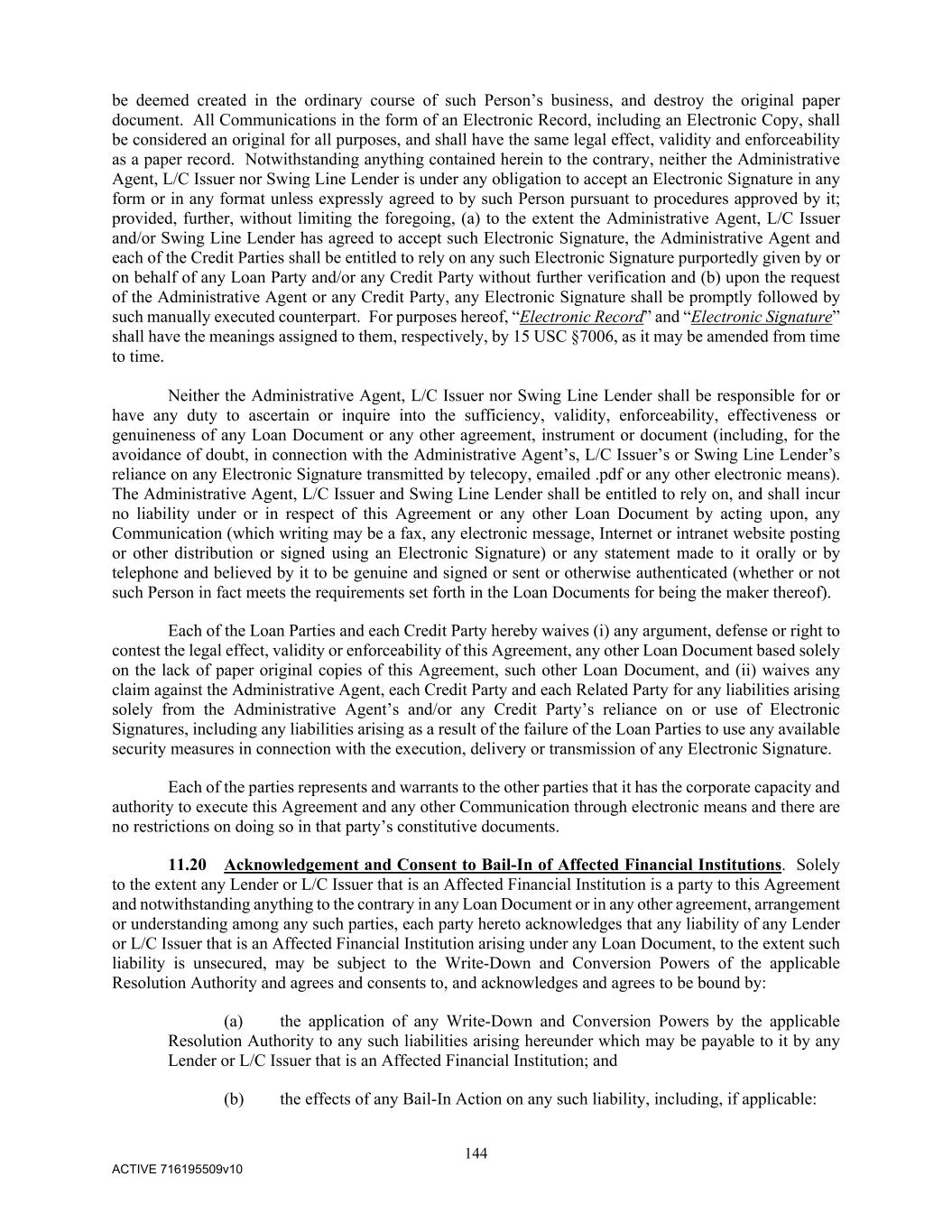 144 ACTIVE 716195509v10 be deemed created in the ordinary course of such Person’s business, and destroy the original paper document. All Communications in the form of an Electronic Record, including an Electronic Copy, shall be considered an original for all purposes, and shall have the same legal effect, validity and enforceability as a paper record. Notwithstanding anything contained herein to the contrary, neither the Administrative Agent, L/C Issuer nor Swing Line Lender is under any obligation to accept an Electronic Signature in any form or in any format unless expressly agreed to by such Person pursuant to procedures approved by it; provided, further, without limiting the foregoing, (a) to the extent the Administrative Agent, L/C Issuer and/or Swing Line Lender has agreed to accept such Electronic Signature, the Administrative Agent and each of the Credit Parties shall be entitled to rely on any such Electronic Signature purportedly given by or on behalf of any Loan Party and/or any Credit Party without further verification and (b) upon the request of the Administrative Agent or any Credit Party, any Electronic Signature shall be promptly followed by such manually executed counterpart. For purposes hereof, “Electronic Record” and “Electronic Signature” shall have the meanings assigned to them, respectively, by 15 USC §7006, as it may be amended from time to time. Neither the Administrative Agent, L/C Issuer nor Swing Line Lender shall be responsible for or have any duty to ascertain or inquire into the sufficiency, validity, enforceability, effectiveness or genuineness of any Loan Document or any other agreement, instrument or document (including, for the avoidance of doubt, in connection with the Administrative Agent’s, L/C Issuer’s or Swing Line Lender’s reliance on any Electronic Signature transmitted by telecopy, emailed .pdf or any other electronic means). The Administrative Agent, L/C Issuer and Swing Line Lender shall be entitled to rely on, and shall incur no liability under or in respect of this Agreement or any other Loan Document by acting upon, any Communication (which writing may be a fax, any electronic message, Internet or intranet website posting or other distribution or signed using an Electronic Signature) or any statement made to it orally or by telephone and believed by it to be genuine and signed or sent or otherwise authenticated (whether or not such Person in fact meets the requirements set forth in the Loan Documents for being the maker thereof). Each of the Loan Parties and each Credit Party hereby waives (i) any argument, defense or right to contest the legal effect, validity or enforceability of this Agreement, any other Loan Document based solely on the lack of paper original copies of this Agreement, such other Loan Document, and (ii) waives any claim against the Administrative Agent, each Credit Party and each Related Party for any liabilities arising solely from the Administrative Agent’s and/or any Credit Party’s reliance on or use of Electronic Signatures, including any liabilities arising as a result of the failure of the Loan Parties to use any available security measures in connection with the execution, delivery or transmission of any Electronic Signature. Each of the parties represents and warrants to the other parties that it has the corporate capacity and authority to execute this Agreement and any other Communication through electronic means and there are no restrictions on doing so in that party’s constitutive documents. 11.20 Acknowledgement and Consent to Bail-In of Affected Financial Institutions. Solely to the extent any Lender or L/C Issuer that is an Affected Financial Institution is a party to this Agreement and notwithstanding anything to the contrary in any Loan Document or in any other agreement, arrangement or understanding among any such parties, each party hereto acknowledges that any liability of any Lender or L/C Issuer that is an Affected Financial Institution arising under any Loan Document, to the extent such liability is unsecured, may be subject to the Write-Down and Conversion Powers of the applicable Resolution Authority and agrees and consents to, and acknowledges and agrees to be bound by: (a) the application of any Write-Down and Conversion Powers by the applicable Resolution Authority to any such liabilities arising hereunder which may be payable to it by any Lender or L/C Issuer that is an Affected Financial Institution; and (b) the effects of any Bail-In Action on any such liability, including, if applicable: