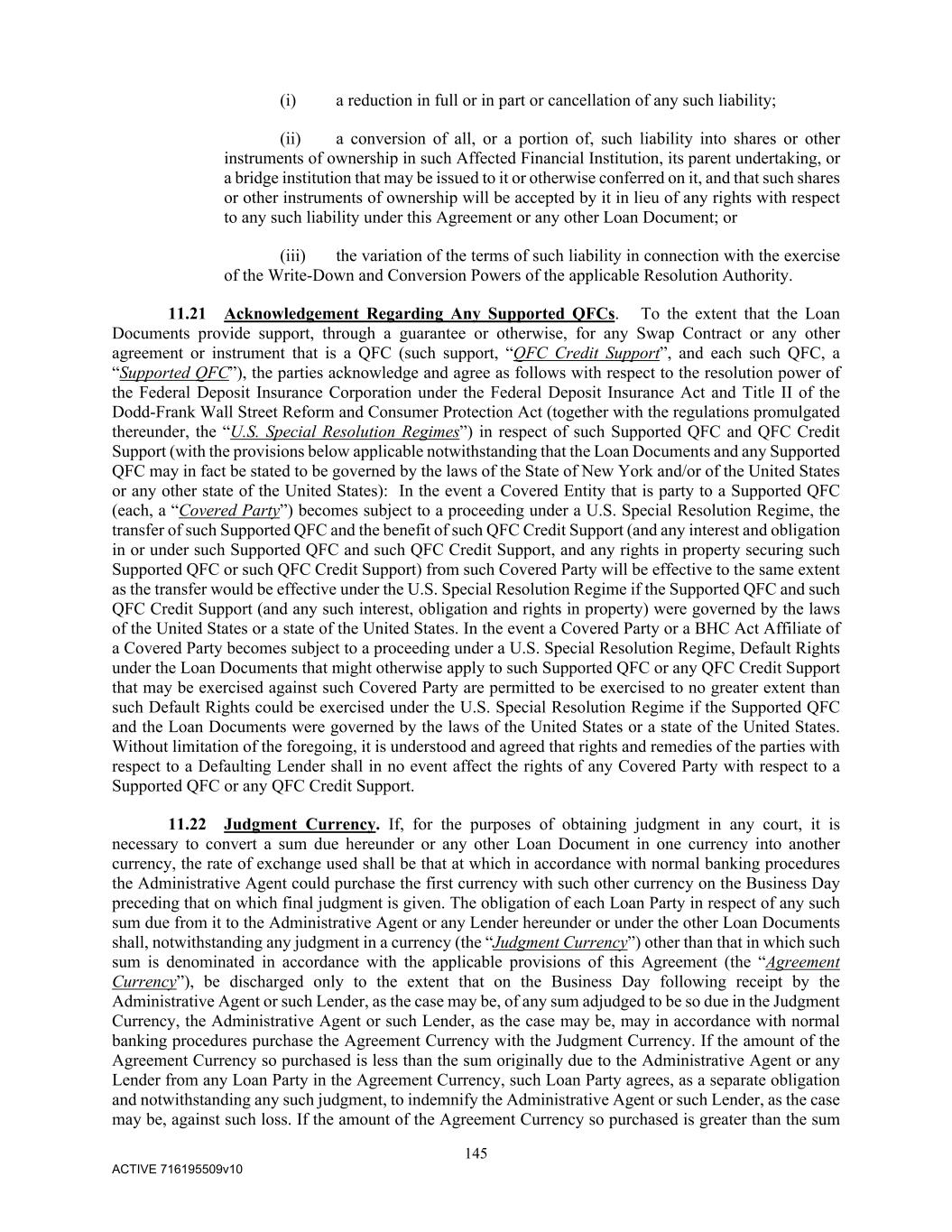 145 ACTIVE 716195509v10 (i) a reduction in full or in part or cancellation of any such liability; (ii) a conversion of all, or a portion of, such liability into shares or other instruments of ownership in such Affected Financial Institution, its parent undertaking, or a bridge institution that may be issued to it or otherwise conferred on it, and that such shares or other instruments of ownership will be accepted by it in lieu of any rights with respect to any such liability under this Agreement or any other Loan Document; or (iii) the variation of the terms of such liability in connection with the exercise of the Write-Down and Conversion Powers of the applicable Resolution Authority. 11.21 Acknowledgement Regarding Any Supported QFCs. To the extent that the Loan Documents provide support, through a guarantee or otherwise, for any Swap Contract or any other agreement or instrument that is a QFC (such support, “QFC Credit Support”, and each such QFC, a “Supported QFC”), the parties acknowledge and agree as follows with respect to the resolution power of the Federal Deposit Insurance Corporation under the Federal Deposit Insurance Act and Title II of the Dodd-Frank Wall Street Reform and Consumer Protection Act (together with the regulations promulgated thereunder, the “U.S. Special Resolution Regimes”) in respect of such Supported QFC and QFC Credit Support (with the provisions below applicable notwithstanding that the Loan Documents and any Supported QFC may in fact be stated to be governed by the laws of the State of New York and/or of the United States or any other state of the United States): In the event a Covered Entity that is party to a Supported QFC (each, a “Covered Party”) becomes subject to a proceeding under a U.S. Special Resolution Regime, the transfer of such Supported QFC and the benefit of such QFC Credit Support (and any interest and obligation in or under such Supported QFC and such QFC Credit Support, and any rights in property securing such Supported QFC or such QFC Credit Support) from such Covered Party will be effective to the same extent as the transfer would be effective under the U.S. Special Resolution Regime if the Supported QFC and such QFC Credit Support (and any such interest, obligation and rights in property) were governed by the laws of the United States or a state of the United States. In the event a Covered Party or a BHC Act Affiliate of a Covered Party becomes subject to a proceeding under a U.S. Special Resolution Regime, Default Rights under the Loan Documents that might otherwise apply to such Supported QFC or any QFC Credit Support that may be exercised against such Covered Party are permitted to be exercised to no greater extent than such Default Rights could be exercised under the U.S. Special Resolution Regime if the Supported QFC and the Loan Documents were governed by the laws of the United States or a state of the United States. Without limitation of the foregoing, it is understood and agreed that rights and remedies of the parties with respect to a Defaulting Lender shall in no event affect the rights of any Covered Party with respect to a Supported QFC or any QFC Credit Support. 11.22 Judgment Currency. If, for the purposes of obtaining judgment in any court, it is necessary to convert a sum due hereunder or any other Loan Document in one currency into another currency, the rate of exchange used shall be that at which in accordance with normal banking procedures the Administrative Agent could purchase the first currency with such other currency on the Business Day preceding that on which final judgment is given. The obligation of each Loan Party in respect of any such sum due from it to the Administrative Agent or any Lender hereunder or under the other Loan Documents shall, notwithstanding any judgment in a currency (the “Judgment Currency”) other than that in which such sum is denominated in accordance with the applicable provisions of this Agreement (the “Agreement Currency”), be discharged only to the extent that on the Business Day following receipt by the Administrative Agent or such Lender, as the case may be, of any sum adjudged to be so due in the Judgment Currency, the Administrative Agent or such Lender, as the case may be, may in accordance with normal banking procedures purchase the Agreement Currency with the Judgment Currency. If the amount of the Agreement Currency so purchased is less than the sum originally due to the Administrative Agent or any Lender from any Loan Party in the Agreement Currency, such Loan Party agrees, as a separate obligation and notwithstanding any such judgment, to indemnify the Administrative Agent or such Lender, as the case may be, against such loss. If the amount of the Agreement Currency so purchased is greater than the sum