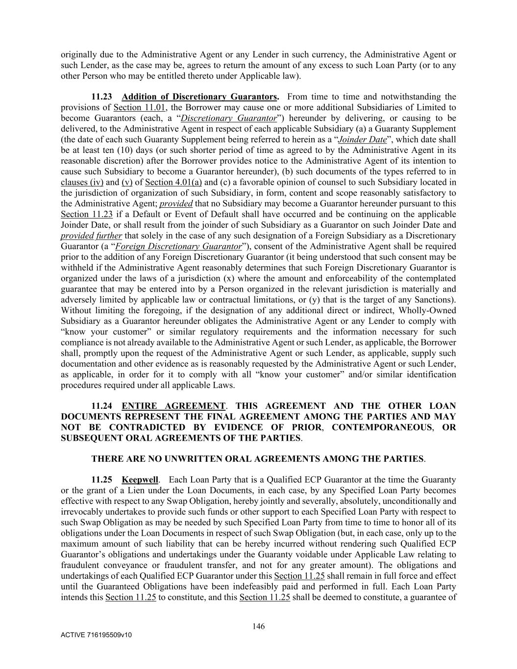 146 ACTIVE 716195509v10 originally due to the Administrative Agent or any Lender in such currency, the Administrative Agent or such Lender, as the case may be, agrees to return the amount of any excess to such Loan Party (or to any other Person who may be entitled thereto under Applicable law). 11.23 Addition of Discretionary Guarantors. From time to time and notwithstanding the provisions of Section 11.01, the Borrower may cause one or more additional Subsidiaries of Limited to become Guarantors (each, a “Discretionary Guarantor”) hereunder by delivering, or causing to be delivered, to the Administrative Agent in respect of each applicable Subsidiary (a) a Guaranty Supplement (the date of each such Guaranty Supplement being referred to herein as a “Joinder Date”, which date shall be at least ten (10) days (or such shorter period of time as agreed to by the Administrative Agent in its reasonable discretion) after the Borrower provides notice to the Administrative Agent of its intention to cause such Subsidiary to become a Guarantor hereunder), (b) such documents of the types referred to in clauses (iv) and (v) of Section 4.01(a) and (c) a favorable opinion of counsel to such Subsidiary located in the jurisdiction of organization of such Subsidiary, in form, content and scope reasonably satisfactory to the Administrative Agent; provided that no Subsidiary may become a Guarantor hereunder pursuant to this Section 11.23 if a Default or Event of Default shall have occurred and be continuing on the applicable Joinder Date, or shall result from the joinder of such Subsidiary as a Guarantor on such Joinder Date and provided further that solely in the case of any such designation of a Foreign Subsidiary as a Discretionary Guarantor (a “Foreign Discretionary Guarantor”), consent of the Administrative Agent shall be required prior to the addition of any Foreign Discretionary Guarantor (it being understood that such consent may be withheld if the Administrative Agent reasonably determines that such Foreign Discretionary Guarantor is organized under the laws of a jurisdiction (x) where the amount and enforceability of the contemplated guarantee that may be entered into by a Person organized in the relevant jurisdiction is materially and adversely limited by applicable law or contractual limitations, or (y) that is the target of any Sanctions). Without limiting the foregoing, if the designation of any additional direct or indirect, Wholly-Owned Subsidiary as a Guarantor hereunder obligates the Administrative Agent or any Lender to comply with “know your customer” or similar regulatory requirements and the information necessary for such compliance is not already available to the Administrative Agent or such Lender, as applicable, the Borrower shall, promptly upon the request of the Administrative Agent or such Lender, as applicable, supply such documentation and other evidence as is reasonably requested by the Administrative Agent or such Lender, as applicable, in order for it to comply with all “know your customer” and/or similar identification procedures required under all applicable Laws. 11.24 ENTIRE AGREEMENT. THIS AGREEMENT AND THE OTHER LOAN DOCUMENTS REPRESENT THE FINAL AGREEMENT AMONG THE PARTIES AND MAY NOT BE CONTRADICTED BY EVIDENCE OF PRIOR, CONTEMPORANEOUS, OR SUBSEQUENT ORAL AGREEMENTS OF THE PARTIES. THERE ARE NO UNWRITTEN ORAL AGREEMENTS AMONG THE PARTIES. 11.25 Keepwell. Each Loan Party that is a Qualified ECP Guarantor at the time the Guaranty or the grant of a Lien under the Loan Documents, in each case, by any Specified Loan Party becomes effective with respect to any Swap Obligation, hereby jointly and severally, absolutely, unconditionally and irrevocably undertakes to provide such funds or other support to each Specified Loan Party with respect to such Swap Obligation as may be needed by such Specified Loan Party from time to time to honor all of its obligations under the Loan Documents in respect of such Swap Obligation (but, in each case, only up to the maximum amount of such liability that can be hereby incurred without rendering such Qualified ECP Guarantor’s obligations and undertakings under the Guaranty voidable under Applicable Law relating to fraudulent conveyance or fraudulent transfer, and not for any greater amount). The obligations and undertakings of each Qualified ECP Guarantor under this Section 11.25 shall remain in full force and effect until the Guaranteed Obligations have been indefeasibly paid and performed in full. Each Loan Party intends this Section 11.25 to constitute, and this Section 11.25 shall be deemed to constitute, a guarantee of