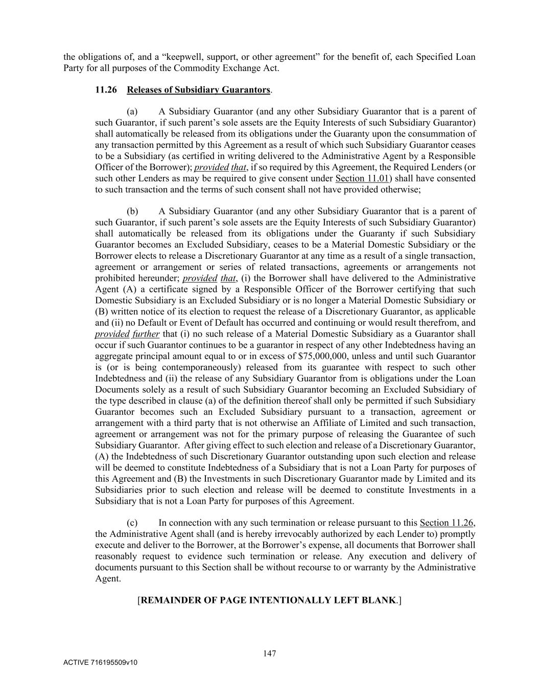 147 ACTIVE 716195509v10 the obligations of, and a “keepwell, support, or other agreement” for the benefit of, each Specified Loan Party for all purposes of the Commodity Exchange Act. 11.26 Releases of Subsidiary Guarantors. (a) A Subsidiary Guarantor (and any other Subsidiary Guarantor that is a parent of such Guarantor, if such parent’s sole assets are the Equity Interests of such Subsidiary Guarantor) shall automatically be released from its obligations under the Guaranty upon the consummation of any transaction permitted by this Agreement as a result of which such Subsidiary Guarantor ceases to be a Subsidiary (as certified in writing delivered to the Administrative Agent by a Responsible Officer of the Borrower); provided that, if so required by this Agreement, the Required Lenders (or such other Lenders as may be required to give consent under Section 11.01) shall have consented to such transaction and the terms of such consent shall not have provided otherwise; (b) A Subsidiary Guarantor (and any other Subsidiary Guarantor that is a parent of such Guarantor, if such parent’s sole assets are the Equity Interests of such Subsidiary Guarantor) shall automatically be released from its obligations under the Guaranty if such Subsidiary Guarantor becomes an Excluded Subsidiary, ceases to be a Material Domestic Subsidiary or the Borrower elects to release a Discretionary Guarantor at any time as a result of a single transaction, agreement or arrangement or series of related transactions, agreements or arrangements not prohibited hereunder; provided that, (i) the Borrower shall have delivered to the Administrative Agent (A) a certificate signed by a Responsible Officer of the Borrower certifying that such Domestic Subsidiary is an Excluded Subsidiary or is no longer a Material Domestic Subsidiary or (B) written notice of its election to request the release of a Discretionary Guarantor, as applicable and (ii) no Default or Event of Default has occurred and continuing or would result therefrom, and provided further that (i) no such release of a Material Domestic Subsidiary as a Guarantor shall occur if such Guarantor continues to be a guarantor in respect of any other Indebtedness having an aggregate principal amount equal to or in excess of $75,000,000, unless and until such Guarantor is (or is being contemporaneously) released from its guarantee with respect to such other Indebtedness and (ii) the release of any Subsidiary Guarantor from is obligations under the Loan Documents solely as a result of such Subsidiary Guarantor becoming an Excluded Subsidiary of the type described in clause (a) of the definition thereof shall only be permitted if such Subsidiary Guarantor becomes such an Excluded Subsidiary pursuant to a transaction, agreement or arrangement with a third party that is not otherwise an Affiliate of Limited and such transaction, agreement or arrangement was not for the primary purpose of releasing the Guarantee of such Subsidiary Guarantor. After giving effect to such election and release of a Discretionary Guarantor, (A) the Indebtedness of such Discretionary Guarantor outstanding upon such election and release will be deemed to constitute Indebtedness of a Subsidiary that is not a Loan Party for purposes of this Agreement and (B) the Investments in such Discretionary Guarantor made by Limited and its Subsidiaries prior to such election and release will be deemed to constitute Investments in a Subsidiary that is not a Loan Party for purposes of this Agreement. (c) In connection with any such termination or release pursuant to this Section 11.26, the Administrative Agent shall (and is hereby irrevocably authorized by each Lender to) promptly execute and deliver to the Borrower, at the Borrower’s expense, all documents that Borrower shall reasonably request to evidence such termination or release. Any execution and delivery of documents pursuant to this Section shall be without recourse to or warranty by the Administrative Agent. [REMAINDER OF PAGE INTENTIONALLY LEFT BLANK.]