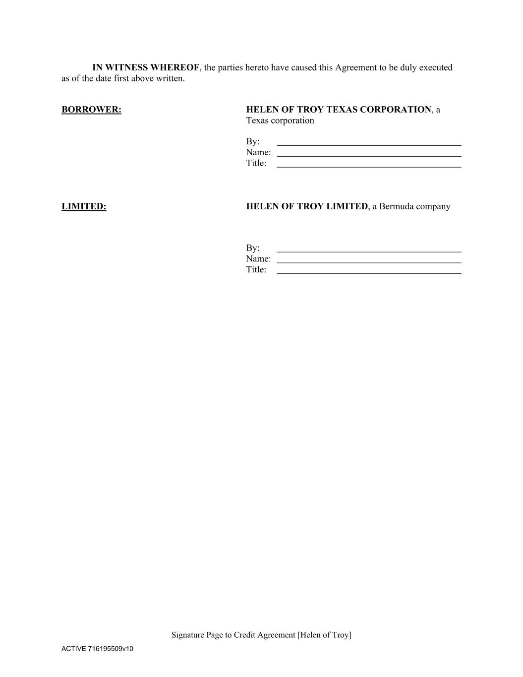 Signature Page to Credit Agreement [Helen of Troy] ACTIVE 716195509v10 IN WITNESS WHEREOF, the parties hereto have caused this Agreement to be duly executed as of the date first above written. BORROWER: HELEN OF TROY TEXAS CORPORATION, a Texas corporation By: Name: Title: LIMITED: HELEN OF TROY LIMITED, a Bermuda company By: Name: Title: