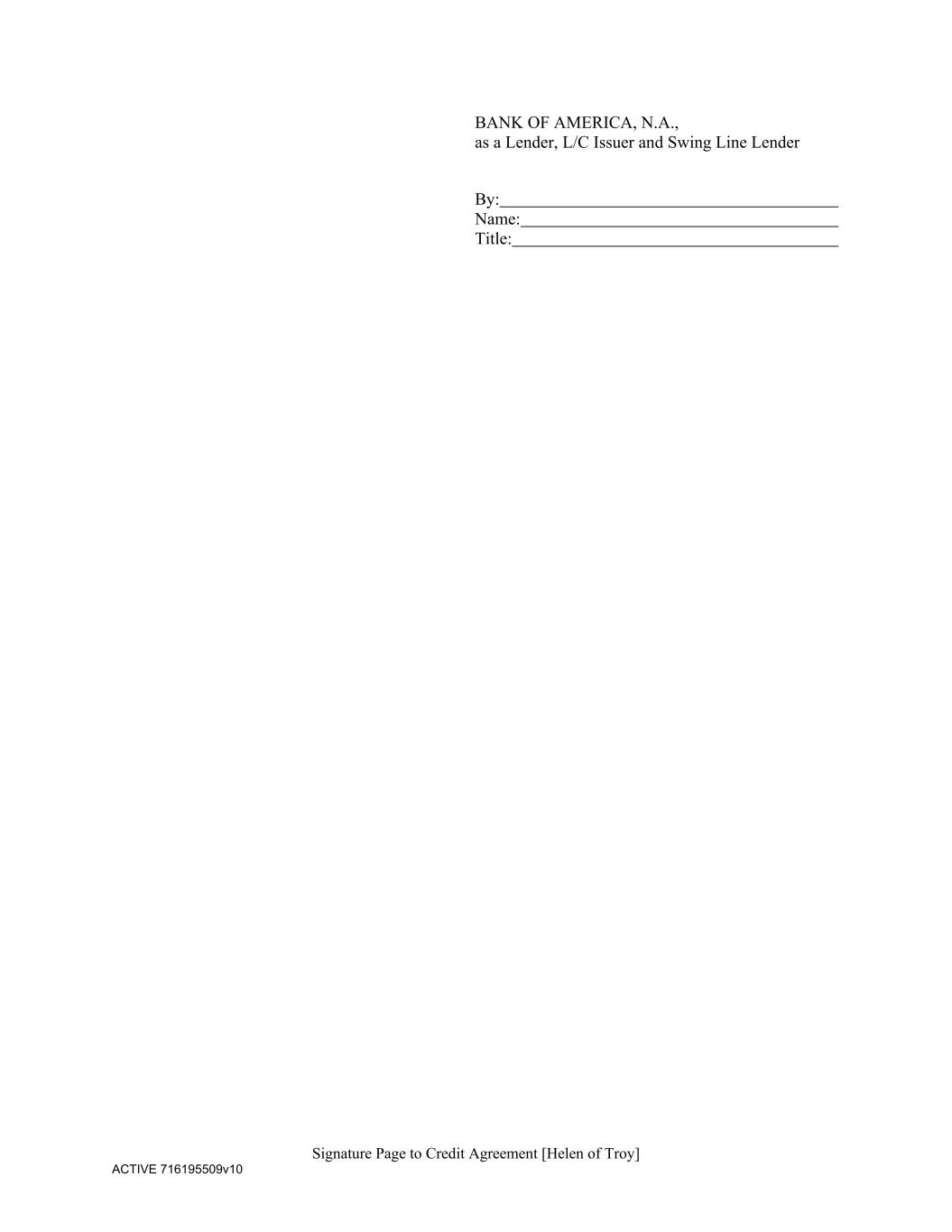 Signature Page to Credit Agreement [Helen of Troy] ACTIVE 716195509v10 BANK OF AMERICA, N.A., as a Lender, L/C Issuer and Swing Line Lender By: Name: Title: