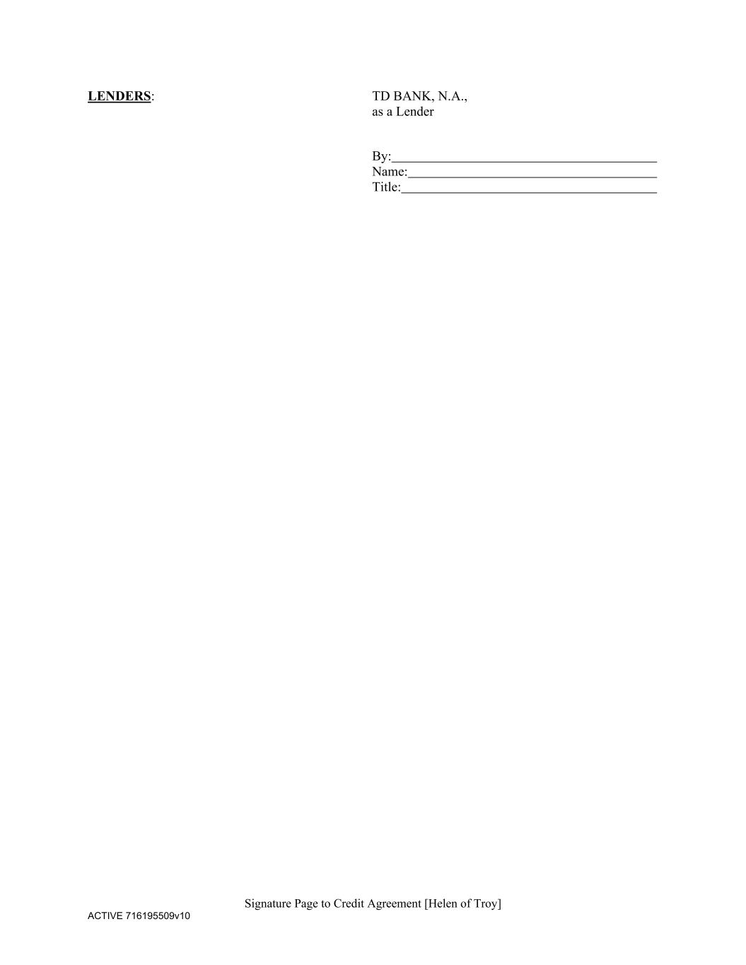Signature Page to Credit Agreement [Helen of Troy] ACTIVE 716195509v10 LENDERS: TD BANK, N.A., as a Lender By: Name: Title: