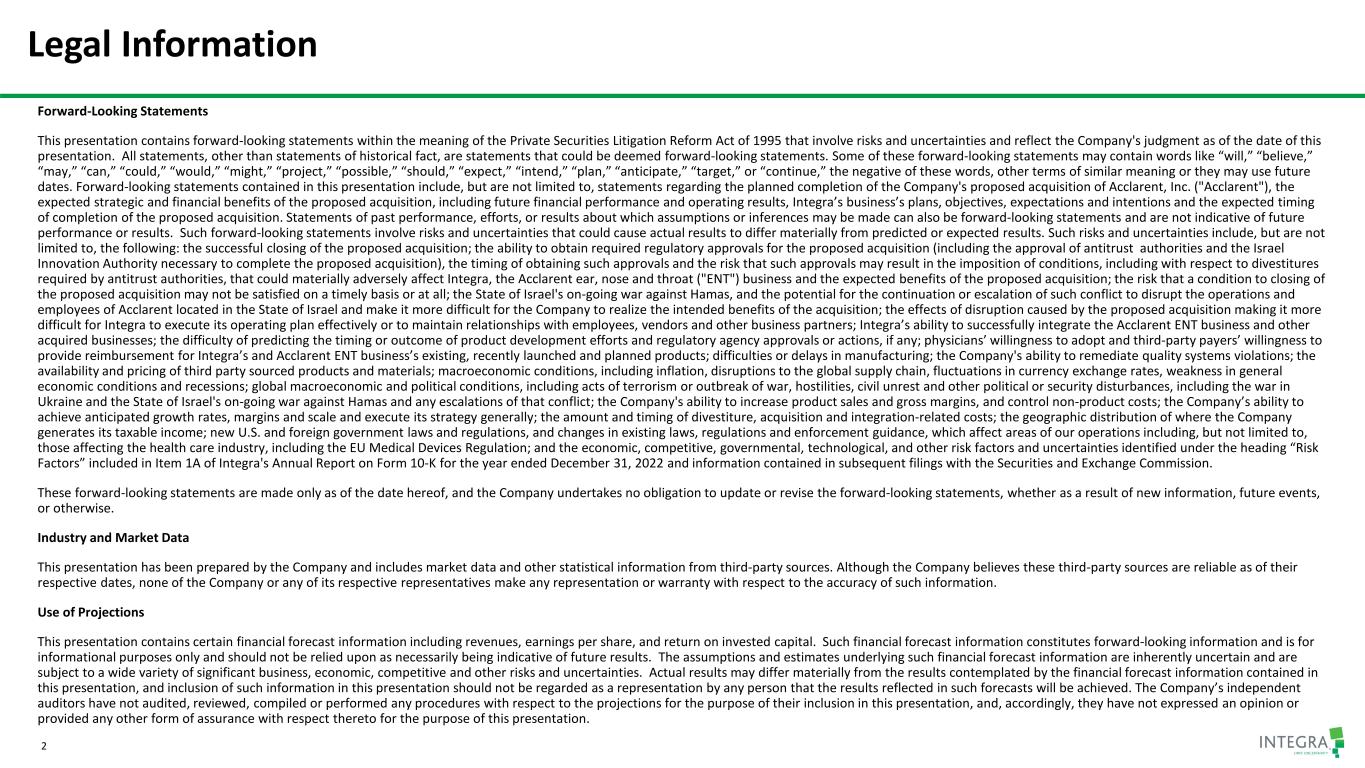 Legal Information 2 Forward-Looking Statements This presentation contains forward-looking statements within the meaning of the Private Securities Litigation Reform Act of 1995 that involve risks and uncertainties and reflect the Company's judgment as of the date of this presentation. All statements, other than statements of historical fact, are statements that could be deemed forward-looking statements. Some of these forward-looking statements may contain words like “will,” “believe,” “may,” “can,” “could,” “would,” “might,” “project,” “possible,” “should,” “expect,” “intend,” “plan,” “anticipate,” “target,” or “continue,” the negative of these words, other terms of similar meaning or they may use future dates. Forward-looking statements contained in this presentation include, but are not limited to, statements regarding the planned completion of the Company's proposed acquisition of Acclarent, Inc. ("Acclarent"), the expected strategic and financial benefits of the proposed acquisition, including future financial performance and operating results, Integra’s business’s plans, objectives, expectations and intentions and the expected timing of completion of the proposed acquisition. Statements of past performance, efforts, or results about which assumptions or inferences may be made can also be forward-looking statements and are not indicative of future performance or results. Such forward-looking statements involve risks and uncertainties that could cause actual results to differ materially from predicted or expected results. Such risks and uncertainties include, but are not limited to, the following: the successful closing of the proposed acquisition; the ability to obtain required regulatory approvals for the proposed acquisition (including the approval of antitrust authorities and the Israel Innovation Authority necessary to complete the proposed acquisition), the timing of obtaining such approvals and the risk that such approvals may result in the imposition of conditions, including with respect to divestitures required by antitrust authorities, that could materially adversely affect Integra, the Acclarent ear, nose and throat ("ENT") business and the expected benefits of the proposed acquisition; the risk that a condition to closing of the proposed acquisition may not be satisfied on a timely basis or at all; the State of Israel's on-going war against Hamas, and the potential for the continuation or escalation of such conflict to disrupt the operations and employees of Acclarent located in the State of Israel and make it more difficult for the Company to realize the intended benefits of the acquisition; the effects of disruption caused by the proposed acquisition making it more difficult for Integra to execute its operating plan effectively or to maintain relationships with employees, vendors and other business partners; Integra’s ability to successfully integrate the Acclarent ENT business and other acquired businesses; the difficulty of predicting the timing or outcome of product development efforts and regulatory agency approvals or actions, if any; physicians’ willingness to adopt and third-party payers’ willingness to provide reimbursement for Integra’s and Acclarent ENT business’s existing, recently launched and planned products; difficulties or delays in manufacturing; the Company's ability to remediate quality systems violations; the availability and pricing of third party sourced products and materials; macroeconomic conditions, including inflation, disruptions to the global supply chain, fluctuations in currency exchange rates, weakness in general economic conditions and recessions; global macroeconomic and political conditions, including acts of terrorism or outbreak of war, hostilities, civil unrest and other political or security disturbances, including the war in Ukraine and the State of Israel's on-going war against Hamas and any escalations of that conflict; the Company's ability to increase product sales and gross margins, and control non-product costs; the Company’s ability to achieve anticipated growth rates, margins and scale and execute its strategy generally; the amount and timing of divestiture, acquisition and integration-related costs; the geographic distribution of where the Company generates its taxable income; new U.S. and foreign government laws and regulations, and changes in existing laws, regulations and enforcement guidance, which affect areas of our operations including, but not limited to, those affecting the health care industry, including the EU Medical Devices Regulation; and the economic, competitive, governmental, technological, and other risk factors and uncertainties identified under the heading “Risk Factors” included in Item 1A of Integra's Annual Report on Form 10-K for the year ended December 31, 2022 and information contained in subsequent filings with the Securities and Exchange Commission. These forward-looking statements are made only as of the date hereof, and the Company undertakes no obligation to update or revise the forward-looking statements, whether as a result of new information, future events, or otherwise. Industry and Market Data This presentation has been prepared by the Company and includes market data and other statistical information from third-party sources. Although the Company believes these third-party sources are reliable as of their respective dates, none of the Company or any of its respective representatives make any representation or warranty with respect to the accuracy of such information. Use of Projections This presentation contains certain financial forecast information including revenues, earnings per share, and return on invested capital. Such financial forecast information constitutes forward-looking information and is for informational purposes only and should not be relied upon as necessarily being indicative of future