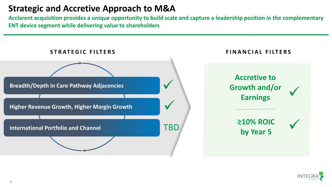 Legal Information 2 Forward-Looking Statements This presentation contains forward-looking statements within the meaning of the Private Securities Litigation Reform Act of 1995 that involve risks and uncertainties and reflect the Company's judgment as of the date of this presentation. All statements, other than statements of historical fact, are statements that could be deemed forward-looking statements. Some of these forward-looking statements may contain words like “will,” “believe,” “may,” “can,” “could,” “would,” “might,” “project,” “possible,” “should,” “expect,” “intend,” “plan,” “anticipate,” “target,” or “continue,” the negative of these words, other terms of similar meaning or they may use future dates. Forward-looking statements contained in this presentation include, but are not limited to, statements regarding the planned completion of the Company's proposed acquisition of Acclarent, Inc. ("Acclarent"), the expected strategic and financial benefits of the proposed acquisition, including future financial performance and operating results, Integra’s business’s plans, objectives, expectations and intentions and the expected timing of completion of the proposed acquisition. Statements of past performance, efforts, or results about which assumptions or inferences may be made can also be forward-looking statements and are not indicative of future performance or results. Such forward-looking statements involve risks and uncertainties that could cause actual results to differ materially from predicted or expected results. Such risks and uncertainties include, but are not limited to, the following: the successful closing of the proposed acquisition; the ability to obtain required regulatory approvals for the proposed acquisition (including the approval of antitrust authorities and the Israel Innovation Authority necessary to complete the proposed acquisition), the timing of obtaining such approvals and the risk that such approvals may result in the imposition of conditions, including with respect to divestitures required by antitrust authorities, that could materially adversely affect Integra, the Acclarent ear, nose and throat ("ENT") business and the expected benefits of the proposed acquisition; the risk that a condition to closing of the proposed acquisition may not be satisfied on a timely basis or at all; the State of Israel's on-going war against Hamas, and the potential for the continuation or escalation of such conflict to disrupt the operations and employees of Acclarent located in the State of Israel and make it more difficult for the Company to realize the intended benefits of the acquisition; the effects of disruption caused by the proposed acquisition making it more difficult for Integra to execute its operating plan effectively or to maintain relationships with employees, vendors and other business partners; Integra’s ability to successfully integrate the Acclarent ENT business and other acquired businesses; the difficulty of predicting the timing or outcome of product development efforts and regulatory agency approvals or actions, if any; physicians’ willingness to adopt and third-party payers’ willingness to provide reimbursement for Integra’s and Acclarent ENT business’s existing, recently launched and planned products; difficulties or delays in manufacturing; the Company's ability to remediate quality systems violations; the availability and pricing of third party sourced products and materials; macroeconomic conditions, including inflation, disruptions to the global supply chain, fluctuations in currency exchange rates, weakness in general economic conditions and recessions; global macroeconomic and political conditions, including acts of terrorism or outbreak of war, hostilities, civil unrest and other political or security disturbances, including the war in Ukraine and the State of Israel's on-going war against Hamas and any escalations of that conflict; the Company's ability to increase product sales and gross margins, and control non-product costs; the Company’s ability to achieve anticipated growth rates, margins and scale and execute its strategy generally; the amount and timing of divestiture, acquisition and integration-related costs; the geographic distribution of where the Company generates its taxable income; new U.S. and foreign government laws and regulations, and changes in existing laws, regulations and enforcement guidance, which affect areas of our operations including, but not limited to, those affecting the health care industry, including the EU Medical Devices Regulation; and the economic, competitive, governmental, technological, and other risk factors and uncertainties identified under the heading “Risk Factors” included in Item 1A of Integra's Annual Report on Form 10-K for the year ended December 31, 2022 and information contained in subsequent filings with the Securities and Exchange Commission. These forward-looking statements are made only as of the date hereof, and the Company undertakes no obligation to update or revise the forward-looking statements, whether as a result of new information, future events, or otherwise. Industry and Market Data This presentation has been prepared by the Company and includes market data and other statistical information from third-party sources. Although the Company believes these third-party sources are reliable as of their respective dates, none of the Company or any of its respective representatives make any representation or warranty with respect to the accuracy of such information. Use of Projections This presentation contains certain financial forecast information including revenues, earnings per share, and return on invested capital. Such financial forecast information constitutes forward-looking information and is for informational purposes only and should not be relied upon as necessarily being indicative of future