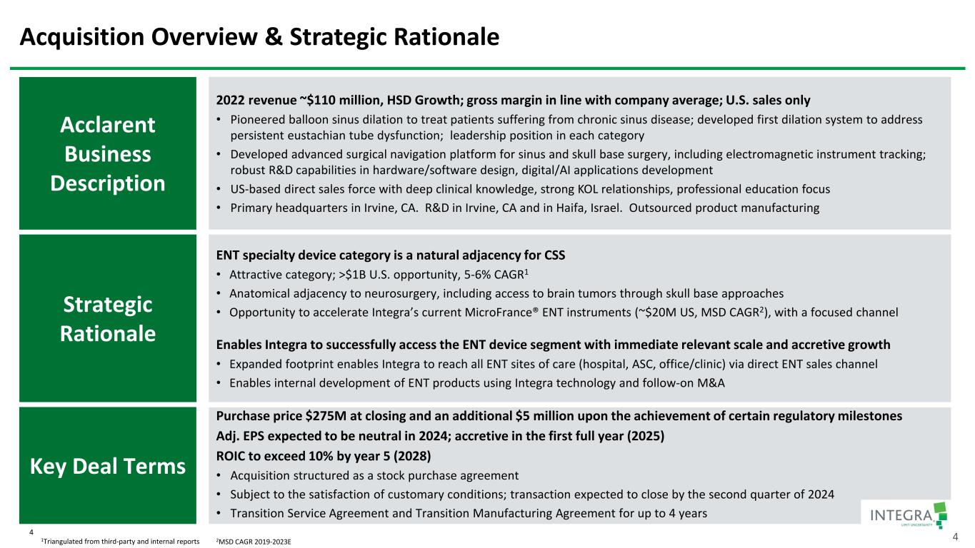 Legal Information 2 Forward-Looking Statements This presentation contains forward-looking statements within the meaning of the Private Securities Litigation Reform Act of 1995 that involve risks and uncertainties and reflect the Company's judgment as of the date of this presentation. All statements, other than statements of historical fact, are statements that could be deemed forward-looking statements. Some of these forward-looking statements may contain words like “will,” “believe,” “may,” “can,” “could,” “would,” “might,” “project,” “possible,” “should,” “expect,” “intend,” “plan,” “anticipate,” “target,” or “continue,” the negative of these words, other terms of similar meaning or they may use future dates. Forward-looking statements contained in this presentation include, but are not limited to, statements regarding the planned completion of the Company's proposed acquisition of Acclarent, Inc. ("Acclarent"), the expected strategic and financial benefits of the proposed acquisition, including future financial performance and operating results, Integra’s business’s plans, objectives, expectations and intentions and the expected timing of completion of the proposed acquisition. Statements of past performance, efforts, or results about which assumptions or inferences may be made can also be forward-looking statements and are not indicative of future performance or results. Such forward-looking statements involve risks and uncertainties that could cause actual results to differ materially from predicted or expected results. Such risks and uncertainties include, but are not limited to, the following: the successful closing of the proposed acquisition; the ability to obtain required regulatory approvals for the proposed acquisition (including the approval of antitrust authorities and the Israel Innovation Authority necessary to complete the proposed acquisition), the timing of obtaining such approvals and the risk that such approvals may result in the imposition of conditions, including with respect to divestitures required by antitrust authorities, that could materially adversely affect Integra, the Acclarent ear, nose and throat ("ENT") business and the expected benefits of the proposed acquisition; the risk that a condition to closing of the proposed acquisition may not be satisfied on a timely basis or at all; the State of Israel's on-going war against Hamas, and the potential for the continuation or escalation of such conflict to disrupt the operations and employees of Acclarent located in the State of Israel and make it more difficult for the Company to realize the intended benefits of the acquisition; the effects of disruption caused by the proposed acquisition making it more difficult for Integra to execute its operating plan effectively or to maintain relationships with employees, vendors and other business partners; Integra’s ability to successfully integrate the Acclarent ENT business and other acquired businesses; the difficulty of predicting the timing or outcome of product development efforts and regulatory agency approvals or actions, if any; physicians’ willingness to adopt and third-party payers’ willingness to provide reimbursement for Integra’s and Acclarent ENT business’s existing, recently launched and planned products; difficulties or delays in manufacturing; the Company's ability to remediate quality systems violations; the availability and pricing of third party sourced products and materials; macroeconomic conditions, including inflation, disruptions to the global supply chain, fluctuations in currency exchange rates, weakness in general economic conditions and recessions; global macroeconomic and political conditions, including acts of terrorism or outbreak of war, hostilities, civil unrest and other political or security disturbances, including the war in Ukraine and the State of Israel's on-going war against Hamas and any escalations of that conflict; the Company's ability to increase product sales and gross margins, and control non-product costs; the Company’s ability to achieve anticipated growth rates, margins and scale and execute its strategy generally; the amount and timing of divestiture, acquisition and integration-related costs; the geographic distribution of where the Company generates its taxable income; new U.S. and foreign government laws and regulations, and changes in existing laws, regulations and enforcement guidance, which affect areas of our operations including, but not limited to, those affecting the health care industry, including the EU Medical Devices Regulation; and the economic, competitive, governmental, technological, and other risk factors and uncertainties identified under the heading “Risk Factors” included in Item 1A of Integra's Annual Report on Form 10-K for the year ended December 31, 2022 and information contained in subsequent filings with the Securities and Exchange Commission. These forward-looking statements are made only as of the date hereof, and the Company undertakes no obligation to update or revise the forward-looking statements, whether as a result of new information, future events, or otherwise. Industry and Market Data This presentation has been prepared by the Company and includes market data and other statistical information from third-party sources. Although the Company believes these third-party sources are reliable as of their respective dates, none of the Company or any of its respective representatives make any representation or warranty with respect to the accuracy of such information. Use of Projections This presentation contains certain financial forecast information including revenues, earnings per share, and return on invested capital. Such financial forecast information constitutes forward-looking information and is for informational purposes only and should not be relied upon as necessarily being indicative of future