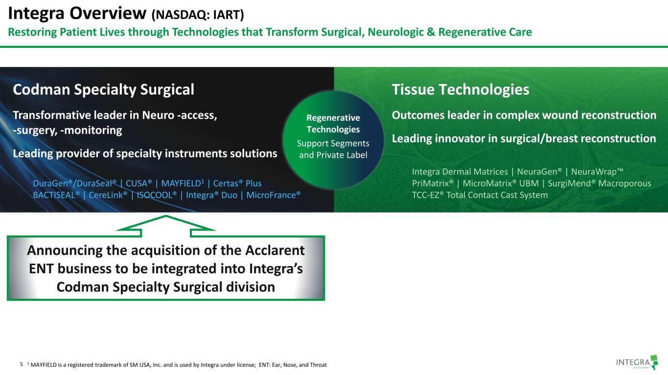 Legal Information 2 Forward-Looking Statements This presentation contains forward-looking statements within the meaning of the Private Securities Litigation Reform Act of 1995 that involve risks and uncertainties and reflect the Company's judgment as of the date of this presentation. All statements, other than statements of historical fact, are statements that could be deemed forward-looking statements. Some of these forward-looking statements may contain words like “will,” “believe,” “may,” “can,” “could,” “would,” “might,” “project,” “possible,” “should,” “expect,” “intend,” “plan,” “anticipate,” “target,” or “continue,” the negative of these words, other terms of similar meaning or they may use future dates. Forward-looking statements contained in this presentation include, but are not limited to, statements regarding the planned completion of the Company's proposed acquisition of Acclarent, Inc. ("Acclarent"), the expected strategic and financial benefits of the proposed acquisition, including future financial performance and operating results, Integra’s business’s plans, objectives, expectations and intentions and the expected timing of completion of the proposed acquisition. Statements of past performance, efforts, or results about which assumptions or inferences may be made can also be forward-looking statements and are not indicative of future performance or results. Such forward-looking statements involve risks and uncertainties that could cause actual results to differ materially from predicted or expected results. Such risks and uncertainties include, but are not limited to, the following: the successful closing of the proposed acquisition; the ability to obtain required regulatory approvals for the proposed acquisition (including the approval of antitrust authorities and the Israel Innovation Authority necessary to complete the proposed acquisition), the timing of obtaining such approvals and the risk that such approvals may result in the imposition of conditions, including with respect to divestitures required by antitrust authorities, that could materially adversely affect Integra, the Acclarent ear, nose and throat ("ENT") business and the expected benefits of the proposed acquisition; the risk that a condition to closing of the proposed acquisition may not be satisfied on a timely basis or at all; the State of Israel's on-going war against Hamas, and the potential for the continuation or escalation of such conflict to disrupt the operations and employees of Acclarent located in the State of Israel and make it more difficult for the Company to realize the intended benefits of the acquisition; the effects of disruption caused by the proposed acquisition making it more difficult for Integra to execute its operating plan effectively or to maintain relationships with employees, vendors and other business partners; Integra’s ability to successfully integrate the Acclarent ENT business and other acquired businesses; the difficulty of predicting the timing or outcome of product development efforts and regulatory agency approvals or actions, if any; physicians’ willingness to adopt and third-party payers’ willingness to provide reimbursement for Integra’s and Acclarent ENT business’s existing, recently launched and planned products; difficulties or delays in manufacturing; the Company's ability to remediate quality systems violations; the availability and pricing of third party sourced products and materials; macroeconomic conditions, including inflation, disruptions to the global supply chain, fluctuations in currency exchange rates, weakness in general economic conditions and recessions; global macroeconomic and political conditions, including acts of terrorism or outbreak of war, hostilities, civil unrest and other political or security disturbances, including the war in Ukraine and the State of Israel's on-going war against Hamas and any escalations of that conflict; the Company's ability to increase product sales and gross margins, and control non-product costs; the Company’s ability to achieve anticipated growth rates, margins and scale and execute its strategy generally; the amount and timing of divestiture, acquisition and integration-related costs; the geographic distribution of where the Company generates its taxable income; new U.S. and foreign government laws and regulations, and changes in existing laws, regulations and enforcement guidance, which affect areas of our operations including, but not limited to, those affecting the health care industry, including the EU Medical Devices Regulation; and the economic, competitive, governmental, technological, and other risk factors and uncertainties identified under the heading “Risk Factors” included in Item 1A of Integra's Annual Report on Form 10-K for the year ended December 31, 2022 and information contained in subsequent filings with the Securities and Exchange Commission. These forward-looking statements are made only as of the date hereof, and the Company undertakes no obligation to update or revise the forward-looking statements, whether as a result of new information, future events, or otherwise. Industry and Market Data This presentation has been prepared by the Company and includes market data and other statistical information from third-party sources. Although the Company believes these third-party sources are reliable as of their respective dates, none of the Company or any of its respective representatives make any representation or warranty with respect to the accuracy of such information. Use of Projections This presentation contains certain financial forecast information including revenues, earnings per share, and return on invested capital. Such financial forecast information constitutes forward-looking information and is for informational purposes only and should not be relied upon as necessarily being indicative of future