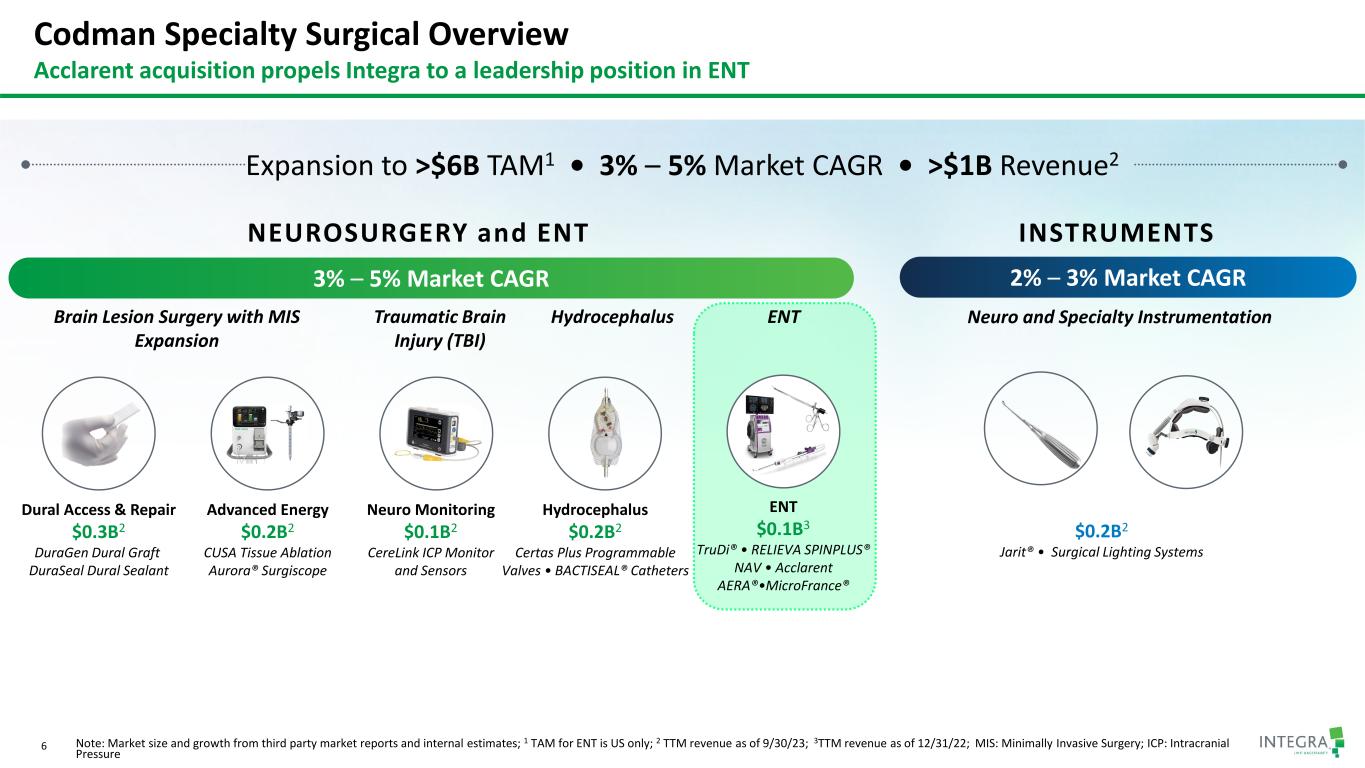 5 1 MAYFIELD is a registered trademark of SM USA, Inc. and is used by Integra under license; ENT: Ear, Nose, and Throat Transformative leader in Neuro -access, -surgery, -monitoring Leading provider of specialty instruments solutions DuraGen®/DuraSeal® | CUSA® | MAYFIELD1 | Certas® Plus BACTISEAL® | CereLink® | ISOCOOL® | Integra® Duo | MicroFrance® Codman Specialty Surgical Outcomes leader in complex wound reconstruction Leading innovator in surgical/breast reconstruction Tissue Technologies Support Segments and Private Label Regenerative Technologies Integra Dermal Matrices | NeuraGen® | NeuraWrap™ PriMatrix® | MicroMatrix® UBM | SurgiMend® Macroporous TCC-EZ® Total Contact Cast System Announcing the acquisition of the Acclarent ENT business to be integrated into Integra’s Codman Specialty Surgical division Integra Overview (NASDAQ: IART) Restoring Patient Lives through Technologies that Transform Surgical, Neurologic & Regenerative Care