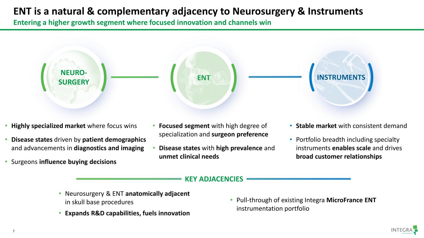 HAWK 6 Codman Specialty Surgical Overview Acclarent acquisition propels Integra to a leadership position in ENT 3% – 5% Market CAGR INSTRUMENTS Neuro and Specialty Instrumentation 2% – 3% Market CAGR Expansion to >$6B TAM1 • 3% – 5% Market CAGR • >$1B Revenue2 $0.2B2 Jarit® • Surgical Lighting Systems Dural Access & Repair $0.3B2 DuraGen Dural Graft DuraSeal Dural Sealant Hydrocephalus $0.2B2 Certas Plus Programmable Valves • BACTISEAL® Catheters Neuro Monitoring $0.1B2 CereLink ICP Monitor and Sensors Advanced Energy $0.2B2 CUSA Tissue Ablation Aurora® Surgiscope ENT $0.1B3 TruDi® • RELIEVA SPINPLUS® NAV • Acclarent AERA®•MicroFrance® NEUROSURGERY and ENT Brain Lesion Surgery with MIS Expansion Traumatic Brain Injury (TBI) Hydrocephalus ENT Note: Market size and growth from third party market reports and internal estimates; 1 TAM for ENT is US only; 2 TTM revenue as of 9/30/23; 3TTM revenue as of 12/31/22; MIS: Minimally Invasive Surgery; ICP: Intracranial Pressure