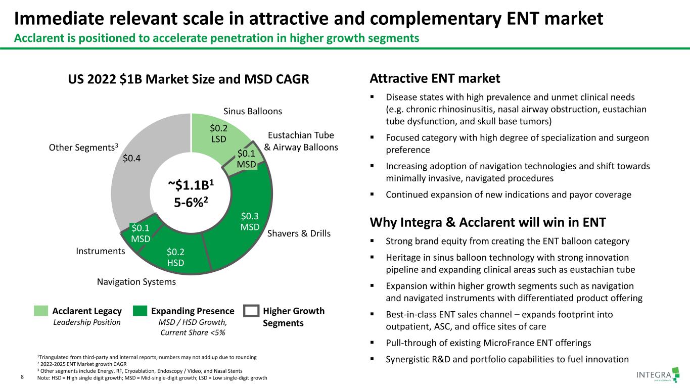 7 ENT is a natural & complementary adjacency to Neurosurgery & Instruments Entering a higher growth segment where focused innovation and channels win NEURO- SURGERY INSTRUMENTSENT • Highly specialized market where focus wins • Disease states driven by patient demographics and advancements in diagnostics and imaging • Surgeons influence buying decisions • Stable market with consistent demand • Portfolio breadth including specialty instruments enables scale and drives broad customer relationships • Focused segment with high degree of specialization and surgeon preference • Disease states with high prevalence and unmet clinical needs • Neurosurgery & ENT anatomically adjacent in skull base procedures • Expands R&D capabilities, fuels innovation • Pull-through of existing Integra MicroFrance ENT instrumentation portfolio KEY ADJACENCIES