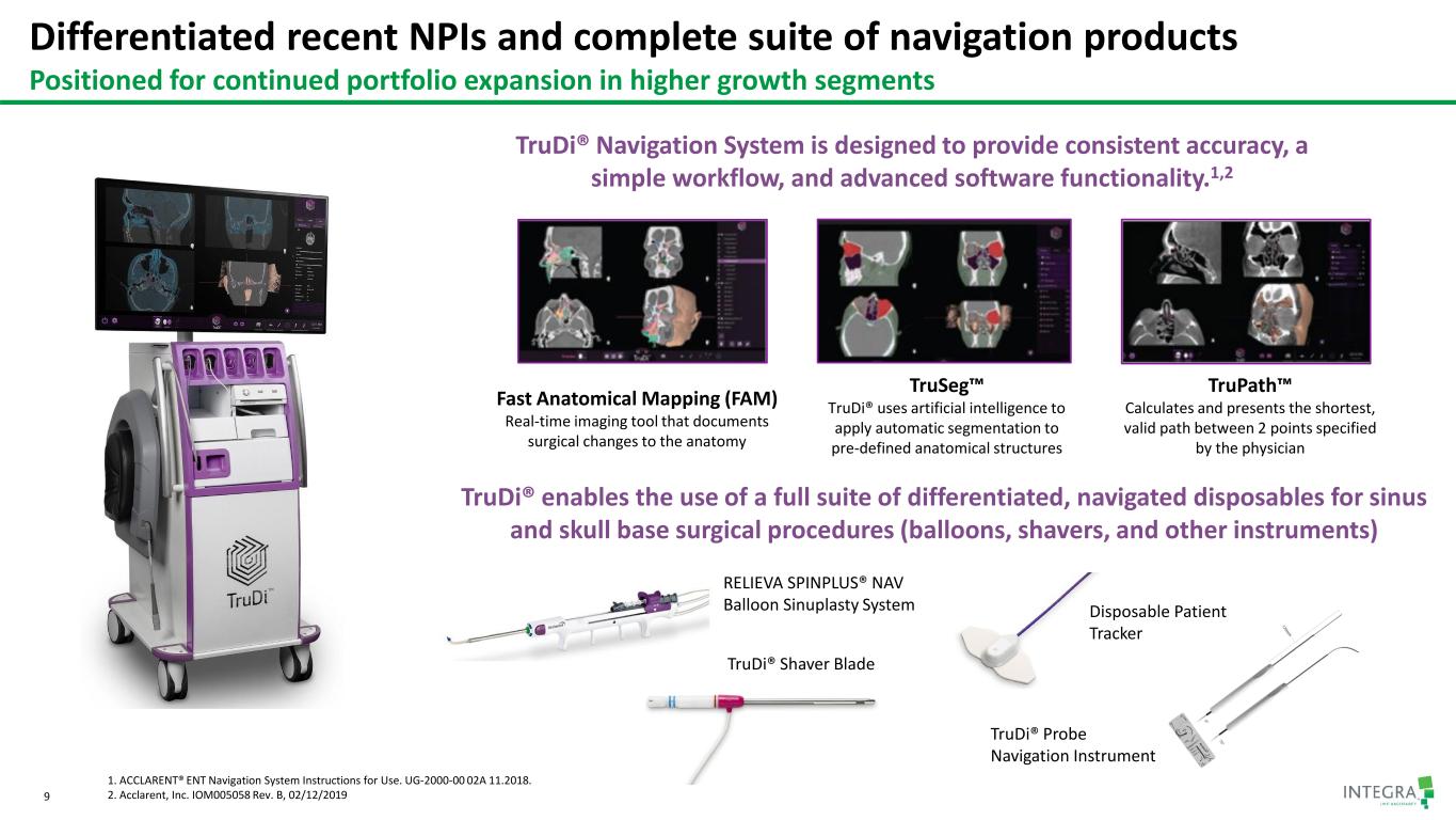 8 1Triangulated from third-party and internal reports, numbers may not add up due to rounding 2 2022-2025 ENT Market growth CAGR 3 Other segments include Energy, RF, Cryoablation, Endoscopy / Video, and Nasal Stents Note: HSD = High single digit growth; MSD = Mid-single-digit growth; LSD = Low single-digit growth Attractive ENT market  Disease states with high prevalence and unmet clinical needs (e.g. chronic rhinosinusitis, nasal airway obstruction, eustachian tube dysfunction, and skull base tumors)  Focused category with high degree of specialization and surgeon preference  Increasing adoption of navigation technologies and shift towards minimally invasive, navigated procedures  Continued expansion of new indications and payor coverage Why Integra & Acclarent will win in ENT  Strong brand equity from creating the ENT balloon category  Heritage in sinus balloon technology with strong innovation pipeline and expanding clinical areas such as eustachian tube  Expansion within higher growth segments such as navigation and navigated instruments with differentiated product offering  Best-in-class ENT sales channel – expands footprint into outpatient, ASC, and office sites of care  Pull-through of existing MicroFrance ENT offerings  Synergistic R&D and portfolio capabilities to fuel innovation US 2022 $1B Market Size and MSD CAGR Immediate relevant scale in attractive and complementary ENT market Acclarent is positioned to accelerate penetration in higher growth segments $0.2 LSD Sinus Balloons $0.1 MSD Eustachian Tube & Airway Balloons $0.3 MSD Shavers & Drills $0.2 HSD Navigation Systems $0.1 MSD Instruments $0.4 Other Segments3 ~$1.1B1 5-6%2 Expanding Presence MSD / HSD Growth, Current Share <5% Acclarent Legacy Leadership Position Higher Growth Segments