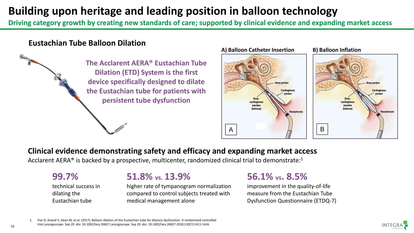 Differentiated recent NPIs and complete suite of navigation products Positioned for continued portfolio expansion in higher growth segments 9 TruDi® Navigation System is designed to provide consistent accuracy, a simple workflow, and advanced software functionality.1,2 1. ACCLARENT® ENT Navigation System Instructions for Use. UG-2000-00 02A 11.2018. 2. Acclarent, Inc. IOM005058 Rev. B, 02/12/2019 Fast Anatomical Mapping (FAM) Real-time imaging tool that documents surgical changes to the anatomy TruSeg™ TruDi® uses artificial intelligence to apply automatic segmentation to pre-defined anatomical structures TruPath™ Calculates and presents the shortest, valid path between 2 points specified by the physician TruDi® enables the use of a full suite of differentiated, navigated disposables for sinus and skull base surgical procedures (balloons, shavers, and other instruments) RELIEVA SPINPLUS® NAV Balloon Sinuplasty System Disposable Patient Tracker TruDi® Shaver Blade TruDi® Probe Navigation Instrument