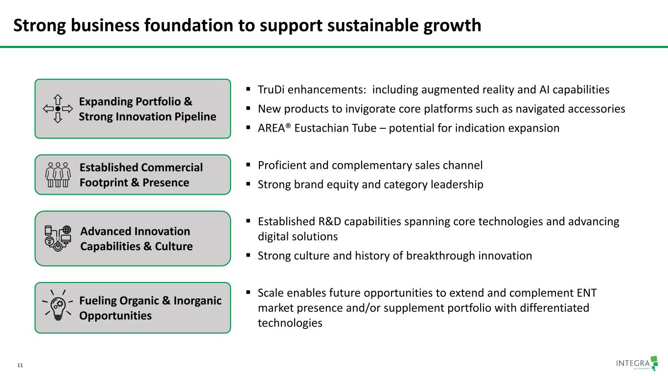 Legal Information 2 Forward-Looking Statements This presentation contains forward-looking statements within the meaning of the Private Securities Litigation Reform Act of 1995 that involve risks and uncertainties and reflect the Company's judgment as of the date of this presentation. All statements, other than statements of historical fact, are statements that could be deemed forward-looking statements. Some of these forward-looking statements may contain words like “will,” “believe,” “may,” “can,” “could,” “would,” “might,” “project,” “possible,” “should,” “expect,” “intend,” “plan,” “anticipate,” “target,” or “continue,” the negative of these words, other terms of similar meaning or they may use future dates. Forward-looking statements contained in this presentation include, but are not limited to, statements regarding the planned completion of the Company's proposed acquisition of Acclarent, Inc. ("Acclarent"), the expected strategic and financial benefits of the proposed acquisition, including future financial performance and operating results, Integra’s business’s plans, objectives, expectations and intentions and the expected timing of completion of the proposed acquisition. Statements of past performance, efforts, or results about which assumptions or inferences may be made can also be forward-looking statements and are not indicative of future performance or results. Such forward-looking statements involve risks and uncertainties that could cause actual results to differ materially from predicted or expected results. Such risks and uncertainties include, but are not limited to, the following: the successful closing of the proposed acquisition; the ability to obtain required regulatory approvals for the proposed acquisition (including the approval of antitrust authorities and the Israel Innovation Authority necessary to complete the proposed acquisition), the timing of obtaining such approvals and the risk that such approvals may result in the imposition of conditions, including with respect to divestitures required by antitrust authorities, that could materially adversely affect Integra, the Acclarent ear, nose and throat ("ENT") business and the expected benefits of the proposed acquisition; the risk that a condition to closing of the proposed acquisition may not be satisfied on a timely basis or at all; the State of Israel's on-going war against Hamas, and the potential for the continuation or escalation of such conflict to disrupt the operations and employees of Acclarent located in the State of Israel and make it more difficult for the Company to realize the intended benefits of the acquisition; the effects of disruption caused by the proposed acquisition making it more difficult for Integra to execute its operating plan effectively or to maintain relationships with employees, vendors and other business partners; Integra’s ability to successfully integrate the Acclarent ENT business and other acquired businesses; the difficulty of predicting the timing or outcome of product development efforts and regulatory agency approvals or actions, if any; physicians’ willingness to adopt and third-party payers’ willingness to provide reimbursement for Integra’s and Acclarent ENT business’s existing, recently launched and planned products; difficulties or delays in manufacturing; the Company's ability to remediate quality systems violations; the availability and pricing of third party sourced products and materials; macroeconomic conditions, including inflation, disruptions to the global supply chain, fluctuations in currency exchange rates, weakness in general economic conditions and recessions; global macroeconomic and political conditions, including acts of terrorism or outbreak of war, hostilities, civil unrest and other political or security disturbances, including the war in Ukraine and the State of Israel's on-going war against Hamas and any escalations of that conflict; the Company's ability to increase product sales and gross margins, and control non-product costs; the Company’s ability to achieve anticipated growth rates, margins and scale and execute its strategy generally; the amount and timing of divestiture, acquisition and integration-related costs; the geographic distribution of where the Company generates its taxable income; new U.S. and foreign government laws and regulations, and changes in existing laws, regulations and enforcement guidance, which affect areas of our operations including, but not limited to, those affecting the health care industry, including the EU Medical Devices Regulation; and the economic, competitive, governmental, technological, and other risk factors and uncertainties identified under the heading “Risk Factors” included in Item 1A of Integra's Annual Report on Form 10-K for the year ended December 31, 2022 and information contained in subsequent filings with the Securities and Exchange Commission. These forward-looking statements are made only as of the date hereof, and the Company undertakes no obligation to update or revise the forward-looking statements, whether as a result of new information, future events, or otherwise. Industry and Market Data This presentation has been prepared by the Company and includes market data and other statistical information from third-party sources. Although the Company believes these third-party sources are reliable as of their respective dates, none of the Company or any of its respective representatives make any representation or warranty with respect to the accuracy of such information. Use of Projections This presentation contains certain financial forecast information including revenues, earnings per share, and return on invested capital. Such financial forecast information constitutes forward-looking information and is for informational purposes only and should not be relied upon as necessarily being indicative of future
