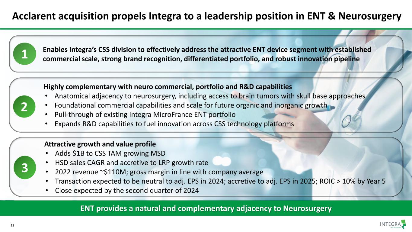 Legal Information 2 Forward-Looking Statements This presentation contains forward-looking statements within the meaning of the Private Securities Litigation Reform Act of 1995 that involve risks and uncertainties and reflect the Company's judgment as of the date of this presentation. All statements, other than statements of historical fact, are statements that could be deemed forward-looking statements. Some of these forward-looking statements may contain words like “will,” “believe,” “may,” “can,” “could,” “would,” “might,” “project,” “possible,” “should,” “expect,” “intend,” “plan,” “anticipate,” “target,” or “continue,” the negative of these words, other terms of similar meaning or they may use future dates. Forward-looking statements contained in this presentation include, but are not limited to, statements regarding the planned completion of the Company's proposed acquisition of Acclarent, Inc. ("Acclarent"), the expected strategic and financial benefits of the proposed acquisition, including future financial performance and operating results, Integra’s business’s plans, objectives, expectations and intentions and the expected timing of completion of the proposed acquisition. Statements of past performance, efforts, or results about which assumptions or inferences may be made can also be forward-looking statements and are not indicative of future performance or results. Such forward-looking statements involve risks and uncertainties that could cause actual results to differ materially from predicted or expected results. Such risks and uncertainties include, but are not limited to, the following: the successful closing of the proposed acquisition; the ability to obtain required regulatory approvals for the proposed acquisition (including the approval of antitrust authorities and the Israel Innovation Authority necessary to complete the proposed acquisition), the timing of obtaining such approvals and the risk that such approvals may result in the imposition of conditions, including with respect to divestitures required by antitrust authorities, that could materially adversely affect Integra, the Acclarent ear, nose and throat ("ENT") business and the expected benefits of the proposed acquisition; the risk that a condition to closing of the proposed acquisition may not be satisfied on a timely basis or at all; the State of Israel's on-going war against Hamas, and the potential for the continuation or escalation of such conflict to disrupt the operations and employees of Acclarent located in the State of Israel and make it more difficult for the Company to realize the intended benefits of the acquisition; the effects of disruption caused by the proposed acquisition making it more difficult for Integra to execute its operating plan effectively or to maintain relationships with employees, vendors and other business partners; Integra’s ability to successfully integrate the Acclarent ENT business and other acquired businesses; the difficulty of predicting the timing or outcome of product development efforts and regulatory agency approvals or actions, if any; physicians’ willingness to adopt and third-party payers’ willingness to provide reimbursement for Integra’s and Acclarent ENT business’s existing, recently launched and planned products; difficulties or delays in manufacturing; the Company's ability to remediate quality systems violations; the availability and pricing of third party sourced products and materials; macroeconomic conditions, including inflation, disruptions to the global supply chain, fluctuations in currency exchange rates, weakness in general economic conditions and recessions; global macroeconomic and political conditions, including acts of terrorism or outbreak of war, hostilities, civil unrest and other political or security disturbances, including the war in Ukraine and the State of Israel's on-going war against Hamas and any escalations of that conflict; the Company's ability to increase product sales and gross margins, and control non-product costs; the Company’s ability to achieve anticipated growth rates, margins and scale and execute its strategy generally; the amount and timing of divestiture, acquisition and integration-related costs; the geographic distribution of where the Company generates its taxable income; new U.S. and foreign government laws and regulations, and changes in existing laws, regulations and enforcement guidance, which affect areas of our operations including, but not limited to, those affecting the health care industry, including the EU Medical Devices Regulation; and the economic, competitive, governmental, technological, and other risk factors and uncertainties identified under the heading “Risk Factors” included in Item 1A of Integra's Annual Report on Form 10-K for the year ended December 31, 2022 and information contained in subsequent filings with the Securities and Exchange Commission. These forward-looking statements are made only as of the date hereof, and the Company undertakes no obligation to update or revise the forward-looking statements, whether as a result of new information, future events, or otherwise. Industry and Market Data This presentation has been prepared by the Company and includes market data and other statistical information from third-party sources. Although the Company believes these third-party sources are reliable as of their respective dates, none of the Company or any of its respective representatives make any representation or warranty with respect to the accuracy of such information. Use of Projections This presentation contains certain financial forecast information including revenues, earnings per share, and return on invested capital. Such financial forecast information constitutes forward-looking information and is for informational purposes only and should not be relied upon as necessarily being indicative of future
