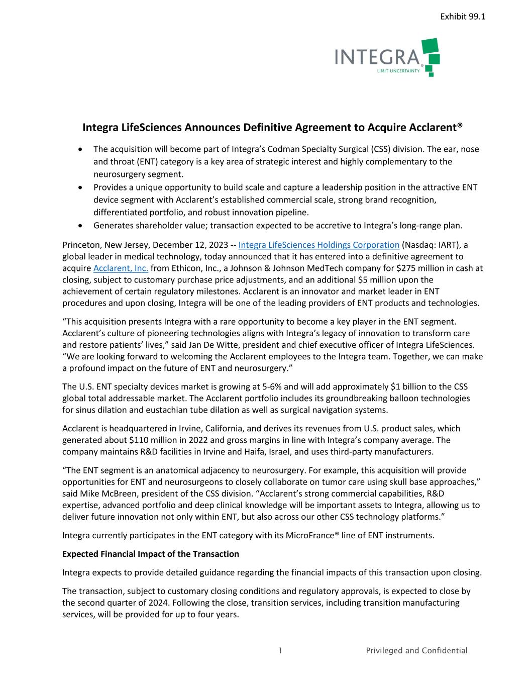 1 Privileged and Confidential Integra LifeSciences Announces Definitive Agreement to Acquire Acclarent® • The acquisition will become part of Integra’s Codman Specialty Surgical (CSS) division. The ear, nose and throat (ENT) category is a key area of strategic interest and highly complementary to the neurosurgery segment. • Provides a unique opportunity to build scale and capture a leadership position in the attractive ENT device segment with Acclarent’s established commercial scale, strong brand recognition, differentiated portfolio, and robust innovation pipeline. • Generates shareholder value; transaction expected to be accretive to Integra’s long-range plan. Princeton, New Jersey, December 12, 2023 -- Integra LifeSciences Holdings Corporation (Nasdaq: IART), a global leader in medical technology, today announced that it has entered into a definitive agreement to acquire Acclarent, Inc. from Ethicon, Inc., a Johnson & Johnson MedTech company for $275 million in cash at closing, subject to customary purchase price adjustments, and an additional $5 million upon the achievement of certain regulatory milestones. Acclarent is an innovator and market leader in ENT procedures and upon closing, Integra will be one of the leading providers of ENT products and technologies. “This acquisition presents Integra with a rare opportunity to become a key player in the ENT segment. Acclarent’s culture of pioneering technologies aligns with Integra’s legacy of innovation to transform care and restore patients’ lives,” said Jan De Witte, president and chief executive officer of Integra LifeSciences. “We are looking forward to welcoming the Acclarent employees to the Integra team. Together, we can make a profound impact on the future of ENT and neurosurgery.” The U.S. ENT specialty devices market is growing at 5-6% and will add approximately $1 billion to the CSS global total addressable market. The Acclarent portfolio includes its groundbreaking balloon technologies for sinus dilation and eustachian tube dilation as well as surgical navigation systems. Acclarent is headquartered in Irvine, California, and derives its revenues from U.S. product sales, which generated about $110 million in 2022 and gross margins in line with Integra’s company average. The company maintains R&D facilities in Irvine and Haifa, Israel, and uses third-party manufacturers. “The ENT segment is an anatomical adjacency to neurosurgery. For example, this acquisition will provide opportunities for ENT and neurosurgeons to closely collaborate on tumor care using skull base approaches,” said Mike McBreen, president of the CSS division. “Acclarent’s strong commercial capabilities, R&D expertise, advanced portfolio and deep clinical knowledge will be important assets to Integra, allowing us to deliver future innovation not only within ENT, but also across our other CSS technology platforms.” Integra currently participates in the ENT category with its MicroFrance® line of ENT instruments. Expected Financial Impact of the Transaction Integra expects to provide detailed guidance regarding the financial impacts of this transaction upon closing. The transaction, subject to customary closing conditions and regulatory approvals, is expected to close by the second quarter of 2024. Following the close, transition services, including transition manufacturing services, will be provided for up to four years. Exhibit 99.1