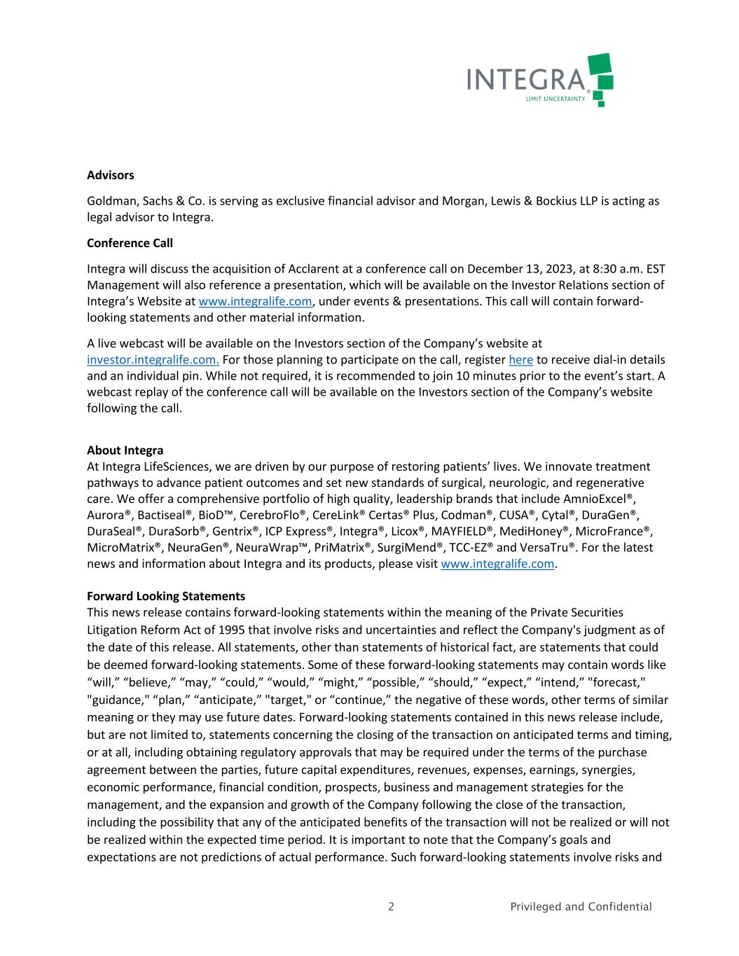 3 Privileged and Confidential uncertainties that could cause actual results to differ materially from predicted or expected results. Such risks and uncertainties include, but are not limited, to the following: the successful closing of the transaction; the ability to obtain required regulatory approvals for the transaction, the timing of obtaining such approvals and the risk that such approvals may result in the imposition of conditions, including with respect to divestitures required by antitrust authorities, that could materially adversely affect the Company and the expected benefits of the transaction; the risk that a condition to closing of the transaction may not be satisfied on a timely basis or at all; the failure of the transaction to close for any other reason and the risk of liability to the Company in connection therewith; the Company’s ability to successfully integrate Acclarent and other acquired businesses; the State of Israel's on-going war against Hamas, and the potential for the continuation or escalation of such conflict to disrupt the operations and employees of Acclarent’s business located in the State of Israel and make it more difficult for the Company to both integrate Acclarent and realize the expected benefits of the transaction; global macroeconomic and political conditions, including acts of terrorism or outbreak of war, hostilities, civil unrest, and other political or security disturbances, including the State of Israel’s ongoing war against Hamas and any escalations of that conflict; the difficulty of predicting the timing or outcome of product development efforts and regulatory agency approvals or actions, if any; physicians’ willingness to adopt and third-party payers’ willingness to provide reimbursement for the Company’s and Acclarent's existing, recently launched and planned products; difficulties or delays in manufacturing; the availability and pricing of third party sourced products and materials; and the economic, competitive, governmental, technological and other risk factors and uncertainties identified under the heading “Risk Factors” included in Item 1A of Integra's Annual Report on Form 10-K for the year ended December 31, 2022 and information contained in subsequent filings with the Securities and Exchange Commission. These forward-looking statements are made only as of the date hereof, and the Company undertakes no obligation to update or revise the forward-looking statements, whether as a result of new information, future events, or otherwise. CONTACT: Integra LifeSciences Holdings Corporation Investors Chris Ward (609) 772-7736 chris.ward@integralife.com Media Laurene Isip (609) 208-8121 laurene.isip@integralife.com