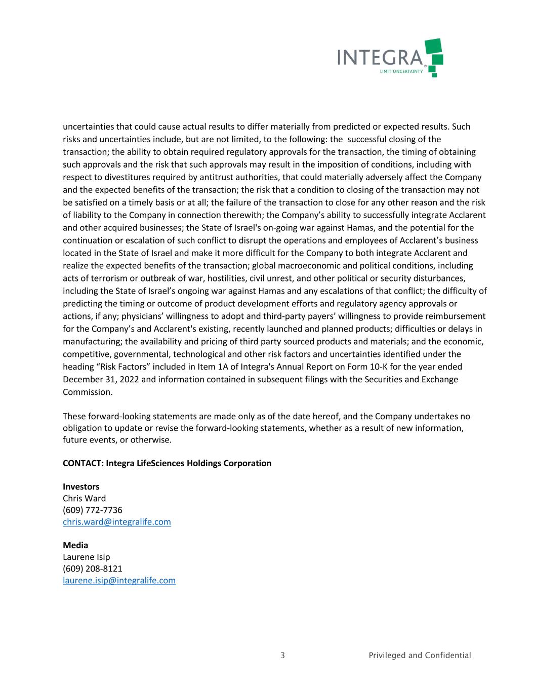 3 Privileged and Confidential uncertainties that could cause actual results to differ materially from predicted or expected results. Such risks and uncertainties include, but are not limited, to the following: the successful closing of the transaction; the ability to obtain required regulatory approvals for the transaction, the timing of obtaining such approvals and the risk that such approvals may result in the imposition of conditions, including with respect to divestitures required by antitrust authorities, that could materially adversely affect the Company and the expected benefits of the transaction; the risk that a condition to closing of the transaction may not be satisfied on a timely basis or at all; the failure of the transaction to close for any other reason and the risk of liability to the Company in connection therewith; the Company’s ability to successfully integrate Acclarent and other acquired businesses; the State of Israel's on-going war against Hamas, and the potential for the continuation or escalation of such conflict to disrupt the operations and employees of Acclarent’s business located in the State of Israel and make it more difficult for the Company to both integrate Acclarent and realize the expected benefits of the transaction; global macroeconomic and political conditions, including acts of terrorism or outbreak of war, hostilities, civil unrest, and other political or security disturbances, including the State of Israel’s ongoing war against Hamas and any escalations of that conflict; the difficulty of predicting the timing or outcome of product development efforts and regulatory agency approvals or actions, if any; physicians’ willingness to adopt and third-party payers’ willingness to provide reimbursement for the Company’s and Acclarent's existing, recently launched and planned products; difficulties or delays in manufacturing; the availability and pricing of third party sourced products and materials; and the economic, competitive, governmental, technological and other risk factors and uncertainties identified under the heading “Risk Factors” included in Item 1A of Integra's Annual Report on Form 10-K for the year ended December 31, 2022 and information contained in subsequent filings with the Securities and Exchange Commission. These forward-looking statements are made only as of the date hereof, and the Company undertakes no obligation to update or revise the forward-looking statements, whether as a result of new information, future events, or otherwise. CONTACT: Integra LifeSciences Holdings Corporation Investors Chris Ward (609) 772-7736 chris.ward@integralife.com Media Laurene Isip (609) 208-8121 laurene.isip@integralife.com