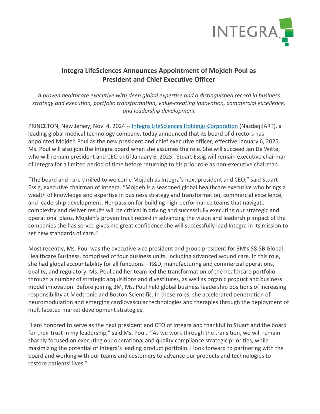 Integra LifeSciences Announces Appointment of Mojdeh Poul as President and Chief Executive Officer A proven healthcare executive with deep global expertise and a distinguished record in business strategy and execution, portfolio transformation, value-creating innovation, commercial excellence, and leadership development PRINCETON, New Jersey, Nov. 4, 2024 -- Integra LifeSciences Holdings Corporation (Nasdaq:IART), a leading global medical technology company, today announced that its board of directors has appointed Mojdeh Poul as the new president and chief executive officer, effective January 6, 2025. Ms. Poul will also join the Integra board when she assumes the role. She will succeed Jan De Witte, who will remain president and CEO until January 6, 2025. Stuart Essig will remain executive chairman of Integra for a limited period of time before returning to his prior role as non-executive chairman. “The board and I are thrilled to welcome Mojdeh as Integra’s next president and CEO,” said Stuart Essig, executive chairman of Integra. “Mojdeh is a seasoned global healthcare executive who brings a wealth of knowledge and expertise in business strategy and transformation, commercial excellence, and leadership development. Her passion for building high-performance teams that navigate complexity and deliver results will be critical in driving and successfully executing our strategic and operational plans. Mojdeh’s proven track record in advancing the vision and leadership impact of the companies she has served gives me great confidence she will successfully lead Integra in its mission to set new standards of care.” Most recently, Ms. Poul was the executive vice president and group president for 3M’s $8.5B Global Healthcare Business, comprised of four business units, including advanced wound care. In this role, she had global accountability for all functions – R&D, manufacturing and commercial operations, quality, and regulatory. Ms. Poul and her team led the transformation of the healthcare portfolio through a number of strategic acquisitions and divestitures, as well as organic product and business model innovation. Before joining 3M, Ms. Poul held global business leadership positions of increasing responsibility at Medtronic and Boston Scientific. In these roles, she accelerated penetration of neuromodulation and emerging cardiovascular technologies and therapies through the deployment of multifaceted market development strategies. “I am honored to serve as the next president and CEO of Integra and thankful to Stuart and the board for their trust in my leadership,” said Ms. Poul. “As we work through the transition, we will remain sharply focused on executing our operational and quality compliance strategic priorities, while maximizing the potential of Integra’s leading product portfolio. I look forward to partnering with the board and working with our teams and customers to advance our products and technologies to restore patients’ lives.”