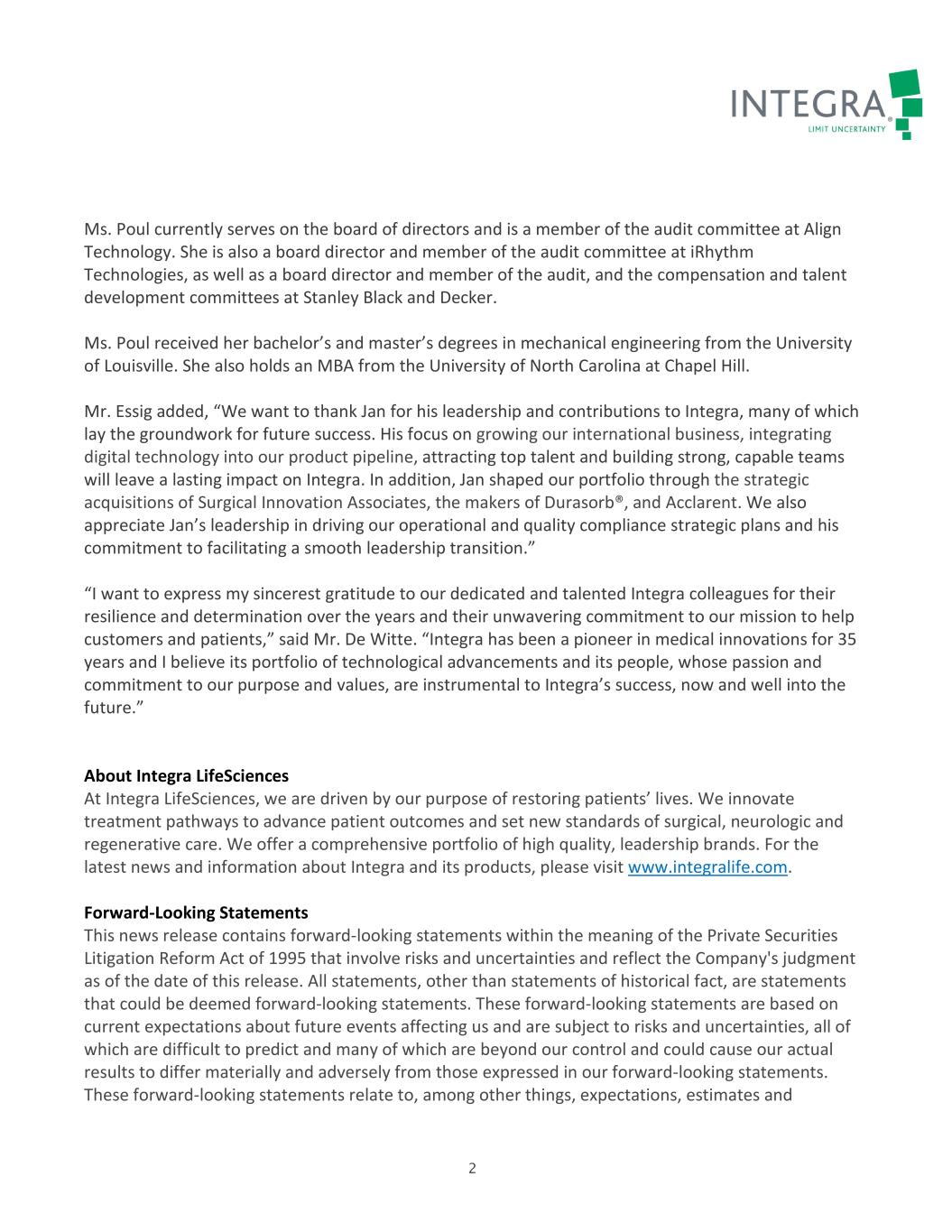 2 Ms. Poul currently serves on the board of directors and is a member of the audit committee at Align Technology. She is also a board director and member of the audit committee at iRhythm Technologies, as well as a board director and member of the audit, and the compensation and talent development committees at Stanley Black and Decker. Ms. Poul received her bachelor’s and master’s degrees in mechanical engineering from the University of Louisville. She also holds an MBA from the University of North Carolina at Chapel Hill. Mr. Essig added, “We want to thank Jan for his leadership and contributions to Integra, many of which lay the groundwork for future success. His focus on growing our international business, integrating digital technology into our product pipeline, attracting top talent and building strong, capable teams will leave a lasting impact on Integra. In addition, Jan shaped our portfolio through the strategic acquisitions of Surgical Innovation Associates, the makers of Durasorb®, and Acclarent. We also appreciate Jan’s leadership in driving our operational and quality compliance strategic plans and his commitment to facilitating a smooth leadership transition.” “I want to express my sincerest gratitude to our dedicated and talented Integra colleagues for their resilience and determination over the years and their unwavering commitment to our mission to help customers and patients,” said Mr. De Witte. “Integra has been a pioneer in medical innovations for 35 years and I believe its portfolio of technological advancements and its people, whose passion and commitment to our purpose and values, are instrumental to Integra’s success, now and well into the future.” About Integra LifeSciences At Integra LifeSciences, we are driven by our purpose of restoring patients’ lives. We innovate treatment pathways to advance patient outcomes and set new standards of surgical, neurologic and regenerative care. We offer a comprehensive portfolio of high quality, leadership brands. For the latest news and information about Integra and its products, please visit www.integralife.com. Forward-Looking Statements This news release contains forward-looking statements within the meaning of the Private Securities Litigation Reform Act of 1995 that involve risks and uncertainties and reflect the Company's judgment as of the date of this release. All statements, other than statements of historical fact, are statements that could be deemed forward-looking statements. These forward-looking statements are based on current expectations about future events affecting us and are subject to risks and uncertainties, all of which are difficult to predict and many of which are beyond our control and could cause our actual results to differ materially and adversely from those expressed in our forward-looking statements. These forward-looking statements relate to, among other things, expectations, estimates and