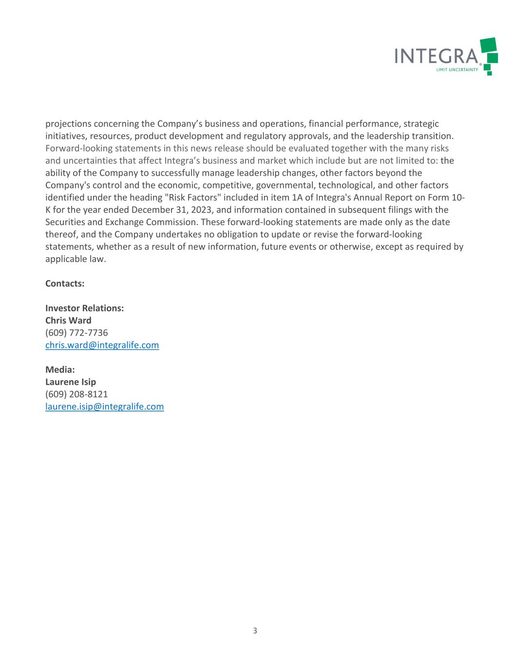 3 projections concerning the Company’s business and operations, financial performance, strategic initiatives, resources, product development and regulatory approvals, and the leadership transition. Forward-looking statements in this news release should be evaluated together with the many risks and uncertainties that affect Integra’s business and market which include but are not limited to: the ability of the Company to successfully manage leadership changes, other factors beyond the Company's control and the economic, competitive, governmental, technological, and other factors identified under the heading "Risk Factors" included in item 1A of Integra's Annual Report on Form 10- K for the year ended December 31, 2023, and information contained in subsequent filings with the Securities and Exchange Commission. These forward-looking statements are made only as the date thereof, and the Company undertakes no obligation to update or revise the forward-looking statements, whether as a result of new information, future events or otherwise, except as required by applicable law. Contacts: Investor Relations: Chris Ward (609) 772-7736 chris.ward@integralife.com Media: Laurene Isip (609) 208-8121 laurene.isip@integralife.com