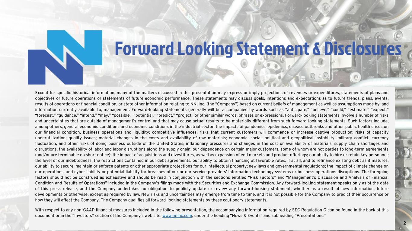 Except for specific historical information, many of the matters discussed in this presentation may express or imply projections of revenues or expenditures, statements of plans and objectives or future operations or statements of future economic performance. These statements may discuss goals, intentions and expectations as to future trends, plans, events, results of operations or financial condition, or state other information relating to NN, Inc. (the “Company”) based on current beliefs of management as well as assumptions made by, and information currently available to, management. Forward-looking statements generally will be accompanied by words such as “anticipate,” “believe,” “could,” “estimate,” “expect,” “forecast,” “guidance,” “intend,” “may,” “possible,” “potential,” “predict,” “project” or other similar words, phrases or expressions. Forward-looking statements involve a number of risks and uncertainties that are outside of management’s control and that may cause actual results to be materially different from such forward-looking statements. Such factors include, among others, general economic conditions and economic conditions in the industrial sector; the impacts of pandemics, epidemics, disease outbreaks and other public health crises on our financial condition, business operations and liquidity; competitive influences; risks that current customers will commence or increase captive production; risks of capacity underutilization; quality issues; material changes in the costs and availability of raw materials; economic, social, political and geopolitical instability, military conflict, currency fluctuation, and other risks of doing business outside of the United States; inflationary pressures and changes in the cost or availability of materials, supply chain shortages and disruptions, the availability of labor and labor disruptions along the supply chain; our dependence on certain major customers, some of whom are not parties to long-term agreements (and/or are terminable on short notice); the impact of acquisitions and divestitures, as well as expansion of end markets and product offerings; our ability to hire or retain key personnel; the level of our indebtedness; the restrictions contained in our debt agreements; our ability to obtain financing at favorable rates, if at all, and to refinance existing debt as it matures; our ability to secure, maintain or enforce patents or other appropriate protections for our intellectual property; new laws and governmental regulations; the impact of climate change on our operations; and cyber liability or potential liability for breaches of our or our service providers’ information technology systems or business operations disruptions. The foregoing factors should not be construed as exhaustive and should be read in conjunction with the sections entitled “Risk Factors” and “Management’s Discussion and Analysis of Financial Condition and Results of Operations” included in the Company’s filings made with the Securities and Exchange Commission. Any forward-looking statement speaks only as of the date of this press release, and the Company undertakes no obligation to publicly update or review any forward-looking statement, whether as a result of new information, future developments or otherwise, except as required by law. New risks and uncertainties may emerge from time to time, and it is not possible for the Company to predict their occurrence or how they will affect the Company. The Company qualifies all forward-looking statements by these cautionary statements. With respect to any non-GAAP financial measures included in the following presentation, the accompanying information required by SEC Regulation G can be found in the back of this document or in the “Investors” section of the Company’s web site, www.nninc.com, under the heading “News & Events” and subheading “Presentations.” Forward Looking Statement & Disclosures 2
