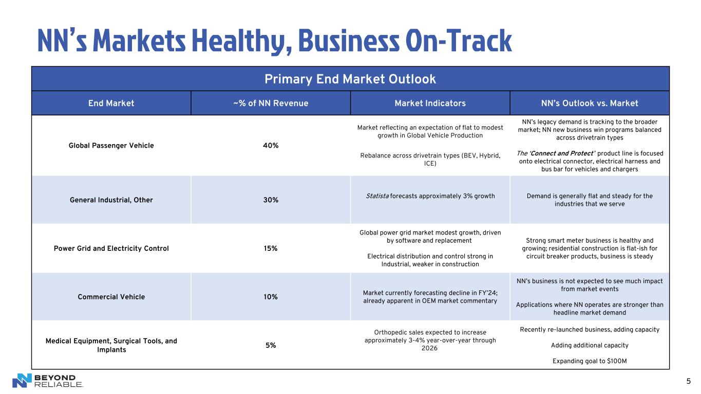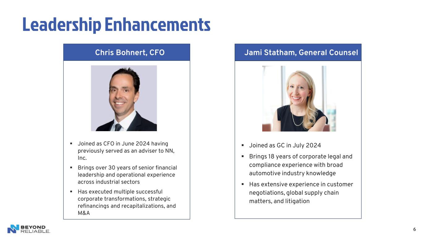 5 NN’s Markets Healthy, Business On-Track Primary End Market Outlook End Market ~% of NN Revenue Market Indicators NN’s Outlook vs. Market Global Passenger Vehicle 40% Market reflecting an expectation of flat to modest growth in Global Vehicle Production Rebalance across drivetrain types (BEV, Hybrid, ICE) NN’s legacy demand is tracking to the broader market; NN new business win programs balanced across drivetrain types The ‘Connect and Protect’ product line is focused onto electrical connector, electrical harness and bus bar for vehicles and chargers General Industrial, Other 30% Statista forecasts approximately 3% growth Demand is generally flat and steady for the industries that we serve Power Grid and Electricity Control 15% Global power grid market modest growth, driven by software and replacement Electrical distribution and control strong in Industrial, weaker in construction Strong smart meter business is healthy and growing; residential construction is flat-ish for circuit breaker products, business is steady Commercial Vehicle 10% Market currently forecasting decline in FY’24; already apparent in OEM market commentary NN’s business is not expected to see much impact from market events Applications where NN operates are stronger than headline market demand Medical Equipment, Surgical Tools, and Implants 5% Orthopedic sales expected to increase approximately 3-4% year-over-year through 2026 Recently re-launched business, adding capacity Adding additional capacity Expanding goal to $100M