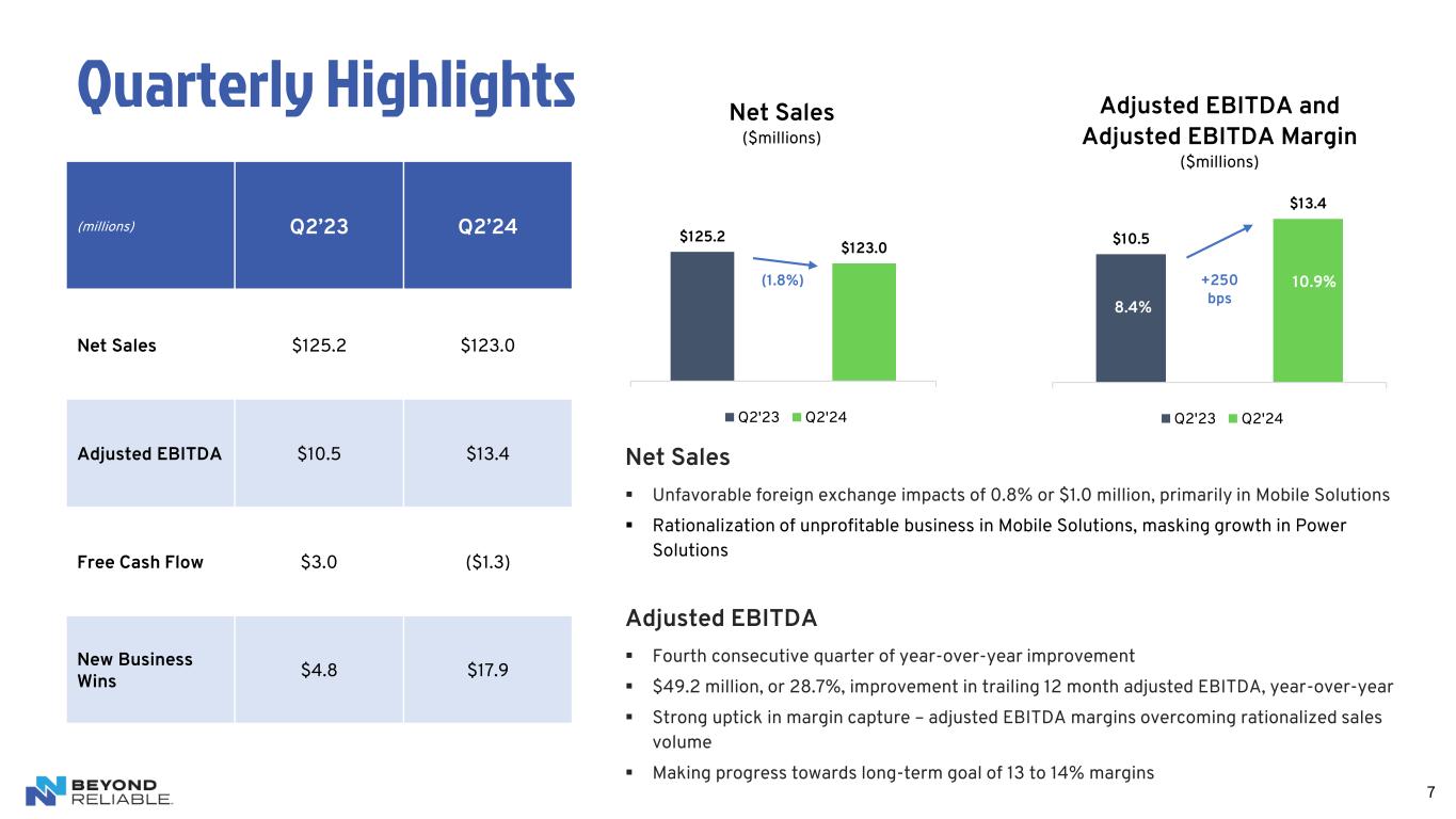 6 Leadership Enhancements ▪ Joined as CFO in June 2024 having previously served as an adviser to NN, Inc. ▪ Brings over 30 years of senior financial leadership and operational experience across industrial sectors ▪ Has executed multiple successful corporate transformations, strategic refinancings and recapitalizations, and M&A Chris Bohnert, CFO ▪ Joined as GC in July 2024 ▪ Brings 18 years of corporate legal and compliance experience with broad automotive industry knowledge ▪ Has extensive experience in customer negotiations, global supply chain matters, and litigation Jami Statham, General Counsel