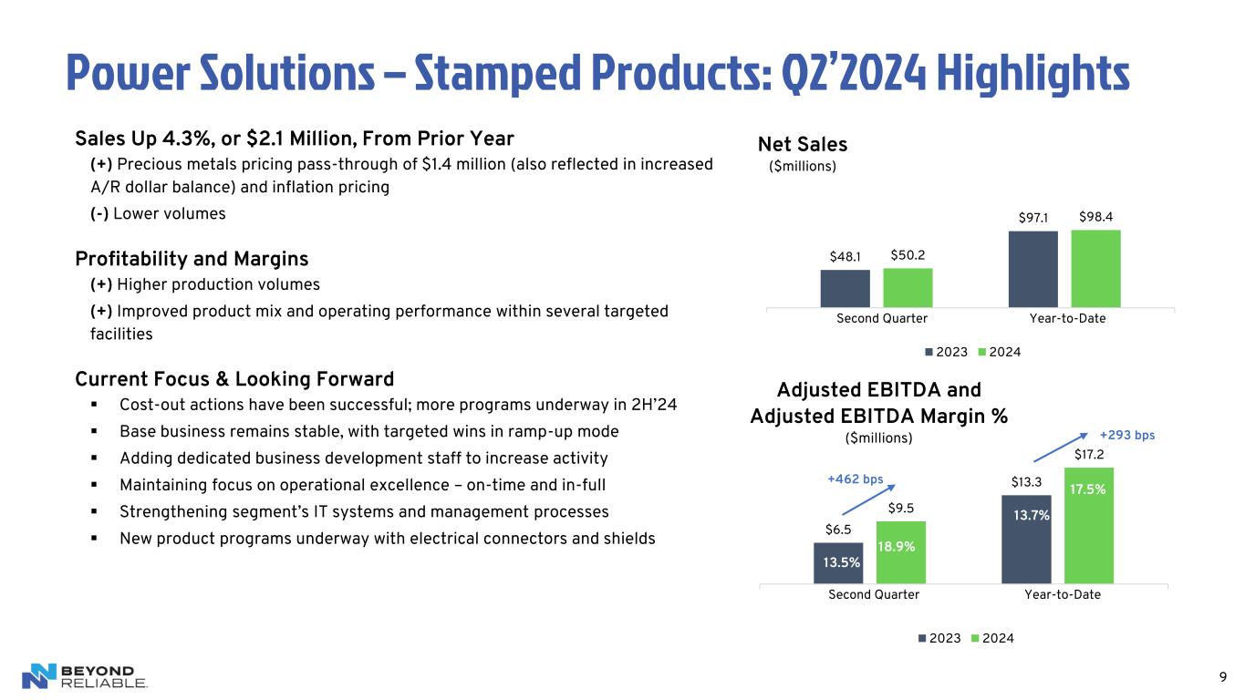 8 Net Sales ▪ Stable volumes with some rationalization actions; largely offset by organic volume growth in other areas ▪ Unfavorable FX impacts, partially offset by the net impact of contractual pricing provisions (millions, except per share data) Q2’23 Q2’24 Δ Net Sales $125.2 $123.0 ($2.2) Operating Income (Loss) ($4.0) ($2.1) $1.9 Adjusted Operating Income (Loss) $1.3 $2.1 $0.8 Adjusted EBITDA $10.5 $13.4 $2.9 Adjusted EBITDA Margin 8.4% 10.9% 2.5% Income (Loss) per Diluted Common Share ($0.38) ($0.12) $0.26 Adjusted Income (Loss) per Diluted Common Share ($0.08) ($0.02) $0.06 Adjusted EBITDA ▪ Improved operational performance in base business ▪ Strong 1H’24 from China JV – will balance out in 2H’24 ▪ Positive sales mix and cost productivity benefits Q2 2024 Financial Results