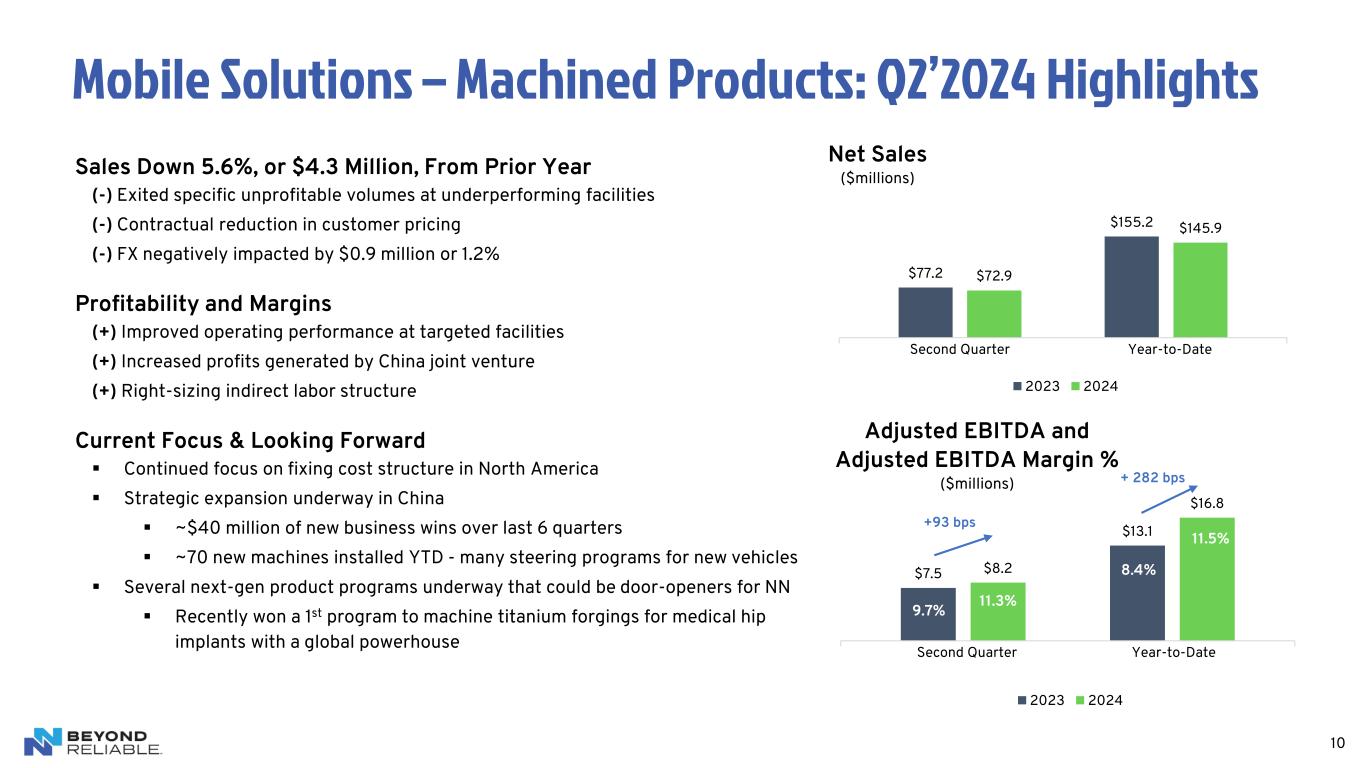 Sales Up 4.3%, or $2.1 Million, From Prior Year (+) Precious metals pricing pass-through of $1.4 million (also reflected in increased A/R dollar balance) and inflation pricing (-) Lower volumes Profitability and Margins (+) Higher production volumes (+) Improved product mix and operating performance within several targeted facilities Current Focus & Looking Forward ▪ Cost-out actions have been successful; more programs underway in 2H’24 ▪ Base business remains stable, with targeted wins in ramp-up mode ▪ Adding dedicated business development staff to increase activity ▪ Maintaining focus on operational excellence – on-time and in-full ▪ Strengthening segment’s IT systems and management processes ▪ New product programs underway with electrical connectors and shields 9 $48.1 $50.2 $97.1 $98.4 Second Quarter Year-to-Date Net Sales ($millions) 2023 2024 $6.5 $9.5 $13.3 $17.2 Second Quarter Year-to-Date Adjusted EBITDA and Adjusted EBITDA Margin % ($millions) 2023 2024 13.5% 18.9% 13.7% 17.5% Power Solutions – Stamped Products: Q2’2024 Highlights +293 bps +462 bps