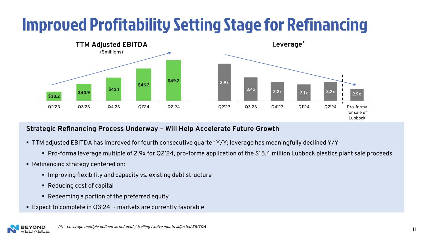 11 Improved Profitability Setting Stage for Refinancing $38.2 $40.9 $43.1 $46.3 $49.2 Q2'23 Q3'23 Q4'23 Q1'24 Q2'24 TTM Adjusted EBITDA ($millions) Strategic Refinancing Process Underway – Will Help Accelerate Future Growth ▪ TTM adjusted EBITDA has improved for fourth consecutive quarter Y/Y; leverage has meaningfully declined Y/Y ▪ Pro-forma leverage multiple of 2.9x for Q2’24, pro-forma application of the $15.4 million Lubbock plastics plant sale proceeds ▪ Refinancing strategy centered on: ▪ Improving flexibility and capacity vs. existing debt structure ▪ Reducing cost of capital ▪ Redeeming a portion of the preferred equity ▪ Expect to complete in Q3’24 - markets are currently favorable 3.9x 3.4x 3.2x 3.1x 3.2x 2.9x Q2'23 Q3'23 Q4'23 Q1'24 Q2'24 Pro-forma for sale of Lubbock Leverage* (*) Leverage multiple defined as net debt / trailing twelve month adjusted EBITDA