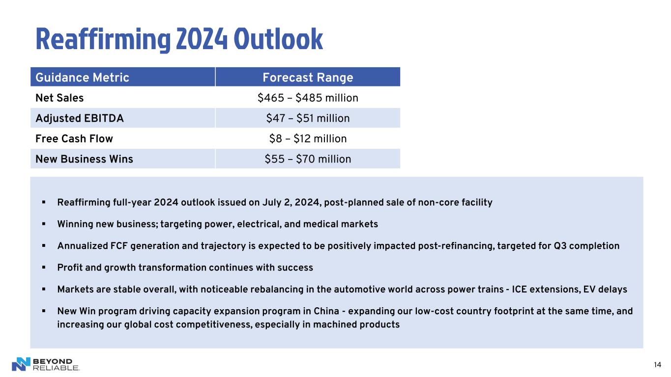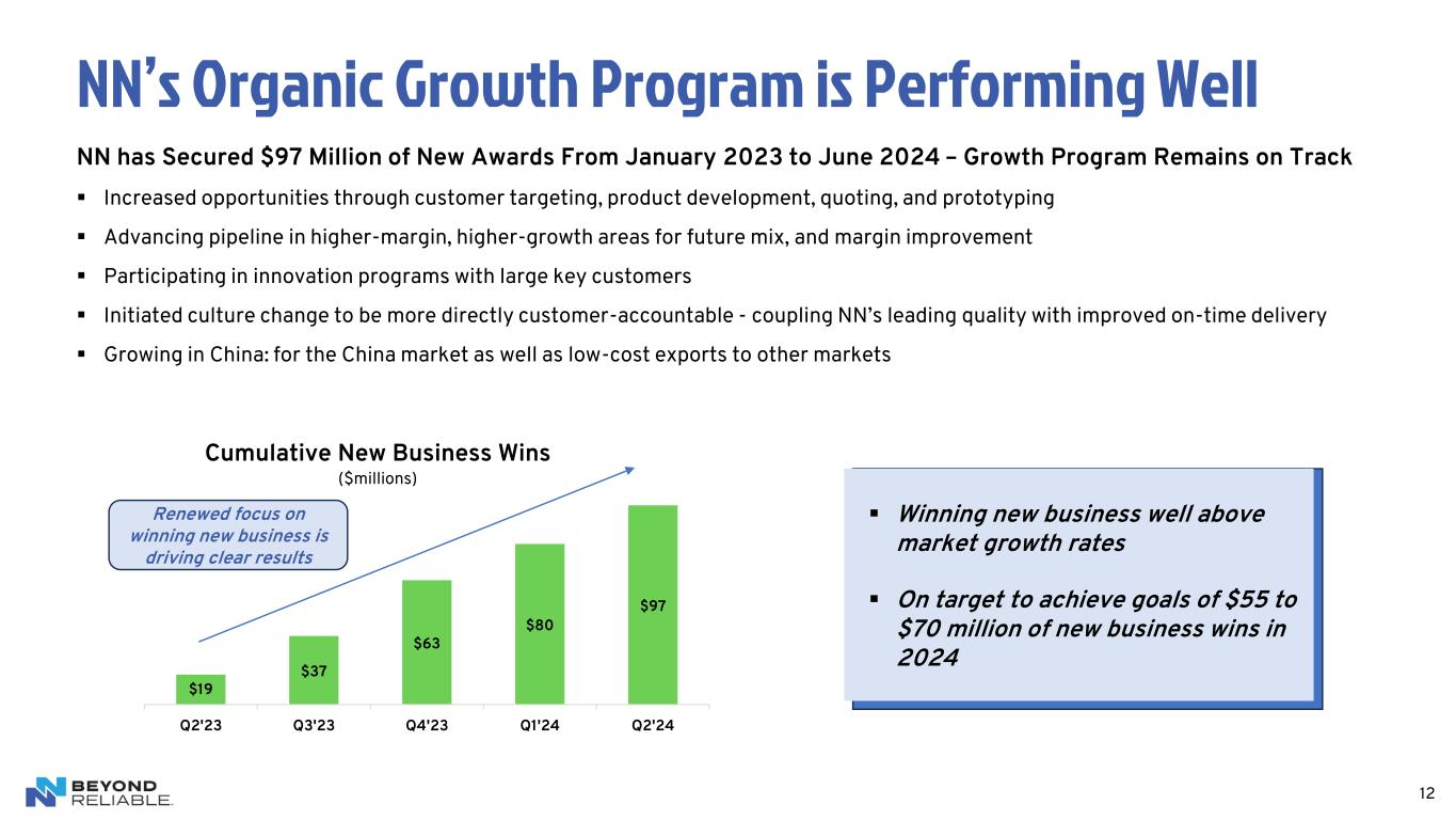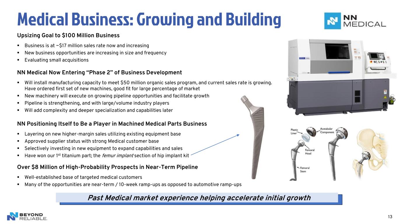 NN’s Organic Growth Program is Performing Well $19 $37 $63 $80 $97 Q2'23 Q3'23 Q4'23 Q1'24 Q2'24 Cumulative New Business Wins ($millions) 12 NN has Secured $97 Million of New Awards From January 2023 to June 2024 – Growth Program Remains on Track ▪ Increased opportunities through customer targeting, product development, quoting, and prototyping ▪ Advancing pipeline in higher-margin, higher-growth areas for future mix, and margin improvement ▪ Participating in innovation programs with large key customers ▪ Initiated culture change to be more directly customer-accountable - coupling NN’s leading quality with improved on-time delivery ▪ Growing in China: for the China market as well as low-cost exports to other markets ▪ Winning new business well above market growth rates ▪ On target to achieve goals of $55 to $70 million of new business wins in 2024 Renewed focus on winning new business is driving clear results